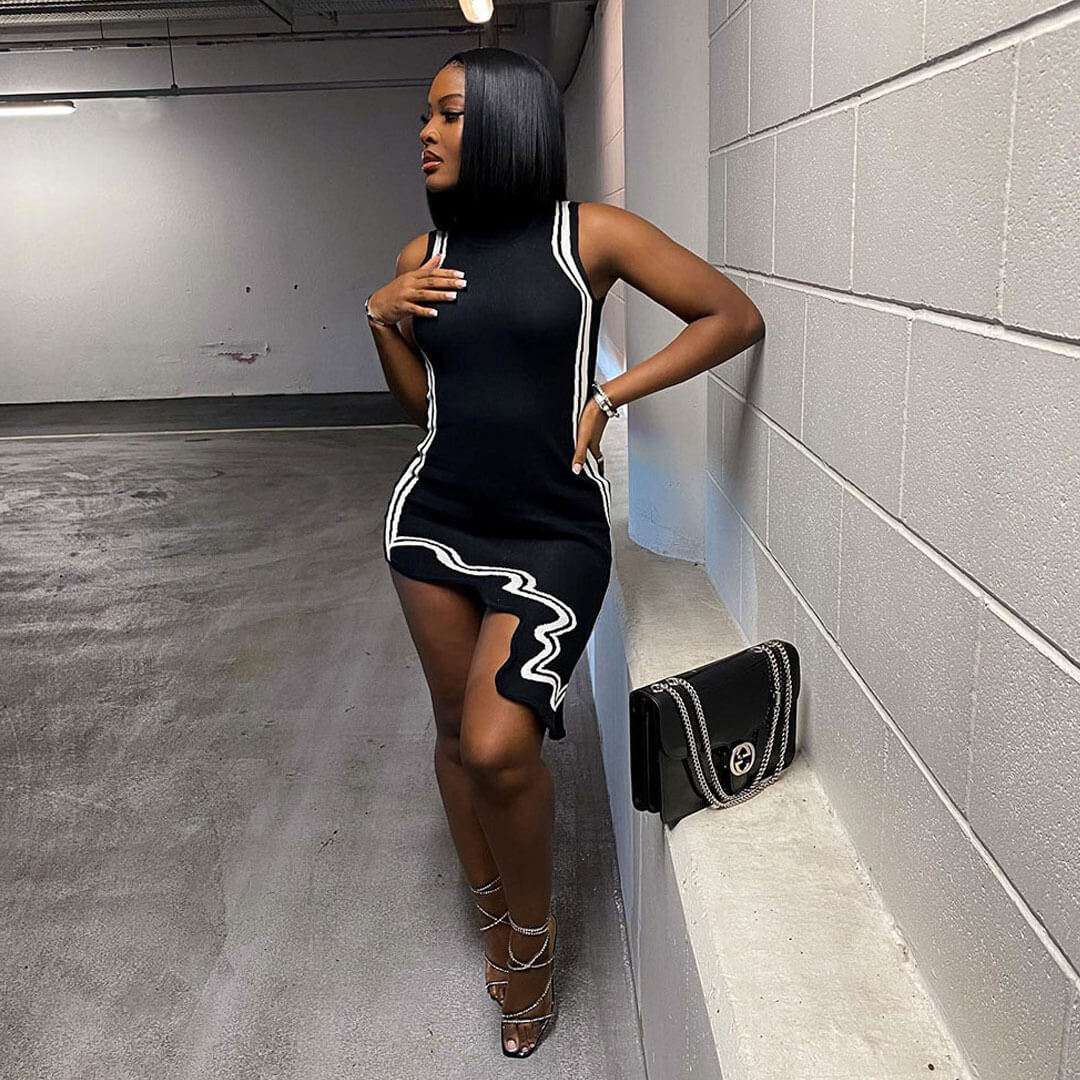 Dieses kontrastfarbene Strickkleid ist königlich und ein Traum für diesen Frühling und Sommer. Aus weichem Strick, Viskose und Polyester. Es fällt durch einen welligen, asymmetrischen Saum mit kontrastfarbenen Streifen auf. Mit hohem Halsausschnitt. Ein Pullover-Stil mit ärmellosem Oberteil. Ein figurbetontes Profil mit Midi-Länge. Weitere einzigartige ärmellose Kleider oder trendige Kleidung für Damen finden Sie in unserer Boutique. Und kombinieren Sie es mit einem Paar Pumps mit Absatz für einen fabelhaften Look.
