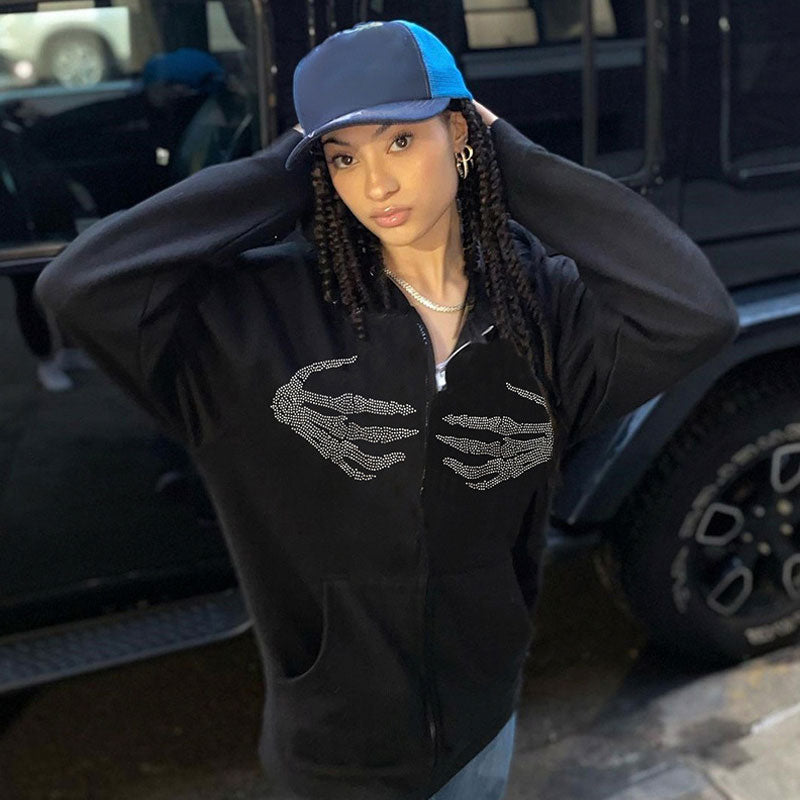 Dieser Hoodie sieht mit allem gleichermaßen cool aus. Aus Baumwollmischung und Polyester. Verziert mit glitzernden Edelstein-Skelettgrafiken auf der Brust. Mit lockerem Schnitt und strukturierter Kapuze mit Kordelzug. Reißverschluss vorne. Aufgesetzte Taschen an den Seiten und normale Länge mit geripptem Saum. Weitere trendige Hoodies oder Kleidung für Damen finden Sie in unserer Boutique und können perfekt mit lässigen Jogginghosen oder schmalen Hosen kombiniert werden.