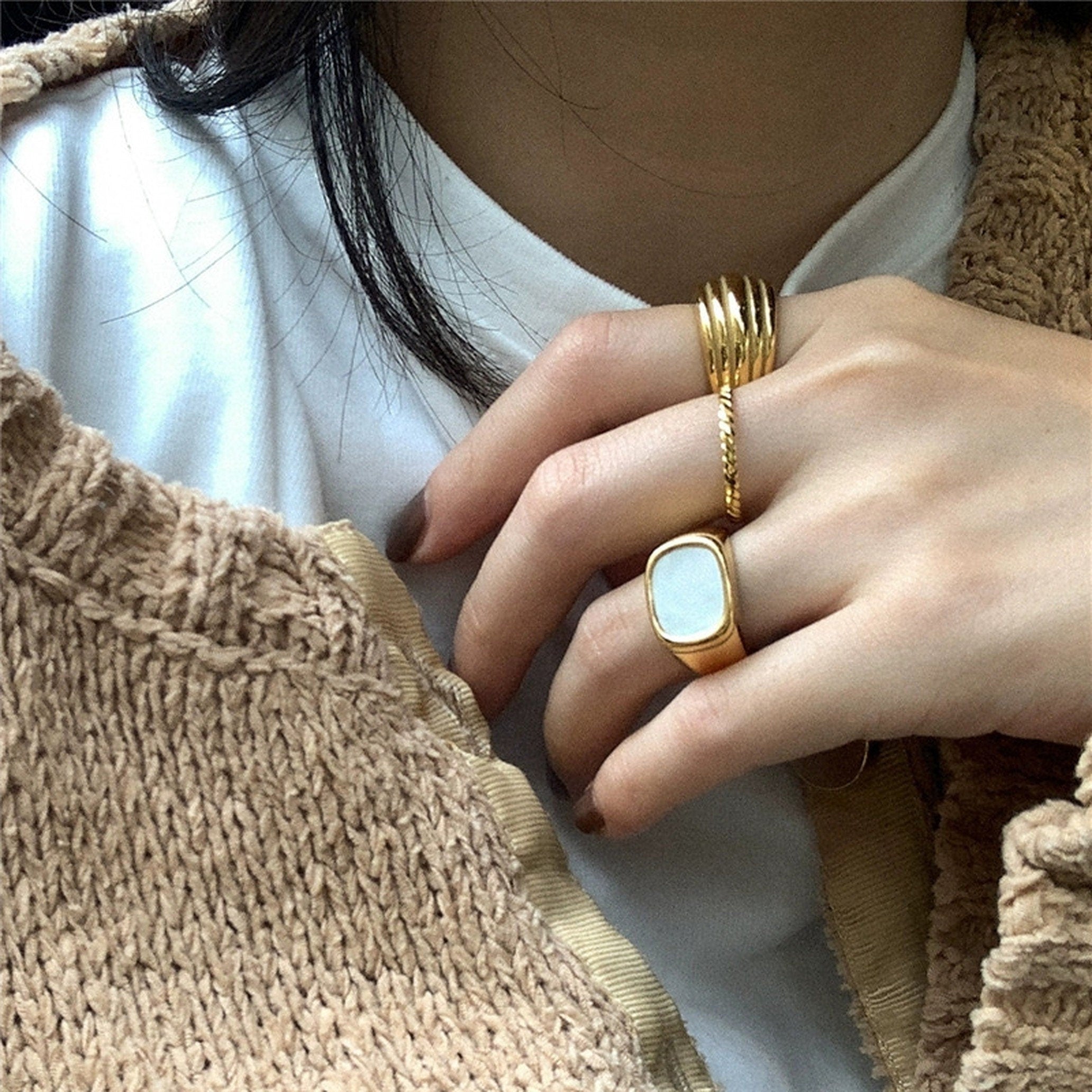 Trendy, klobiger Siegelring aus Gold mit Twist und Glasur, 3er-Set. Dickes, breites Band mit schicken Schwarz-Weiß-Optionen. Super praktisch zum Stapeln und Kombinieren nach Belieben. Sie können einen Statement-Ring allein oder die Ringe zusammen für verschiedene Stile und Outfits tragen! US-Größe 6. Verkauft als 3er-Set.