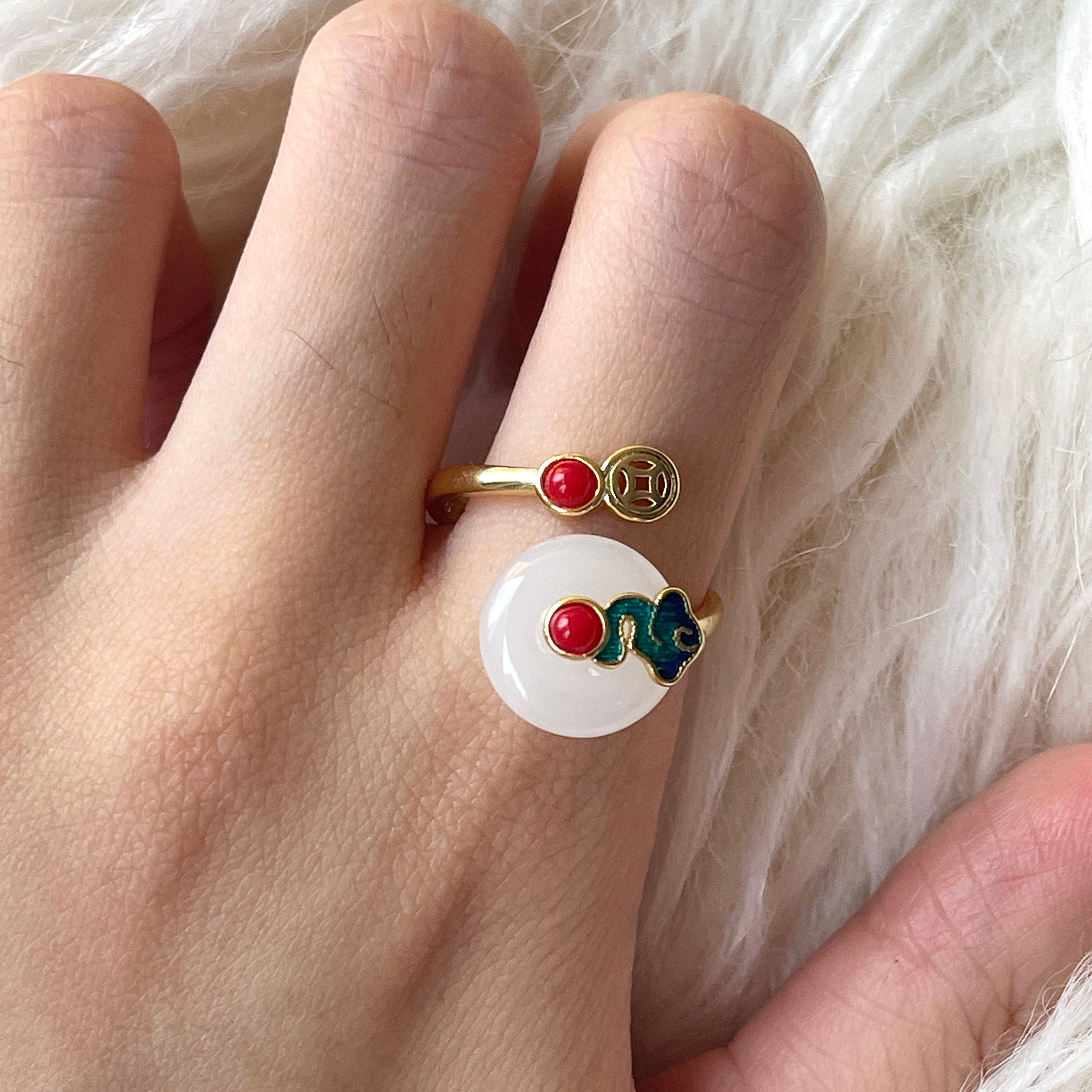 Zartes, exquisites, handgefertigtes Kunstwerk. Luxuriöser, natürlicher, ausgefallener Cocktailring aus Hetian-Jaspis-Edelsteinen. Ring mit heilender Energie. Sterlingsilber mit 14-karätiger Vergoldung. Einzigartiges, asymmetrisches Cloisonné-Spitzendesign aus roter und grüner Emaille. Hochwertiger Jade-Edelstein ist drehbar. Super raffiniert und doch dezent! Gönnen Sie sich etwas. Auch eine perfekte Geschenkidee.