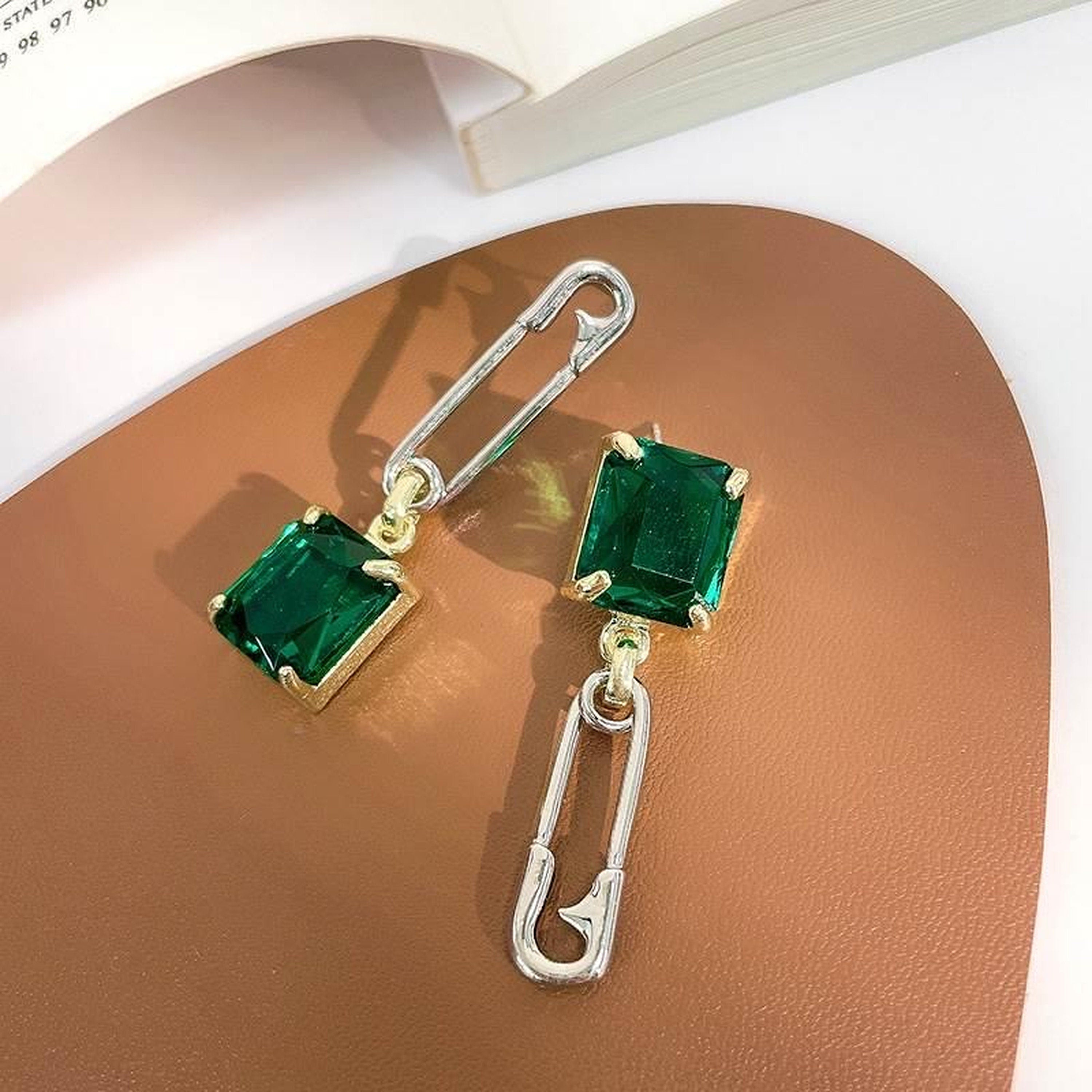 Grüne, smaragdgrüne, baumelnde Statement-Ohrringe aus Silber. Der quadratische grüne Edelstein passt auf kreative Weise zur silbernen Stiftkette. Modern und doch elegant. Einzigartig und filigran. Handgefertigt aus Sterlingsilber. Gut für empfindliche Haut.