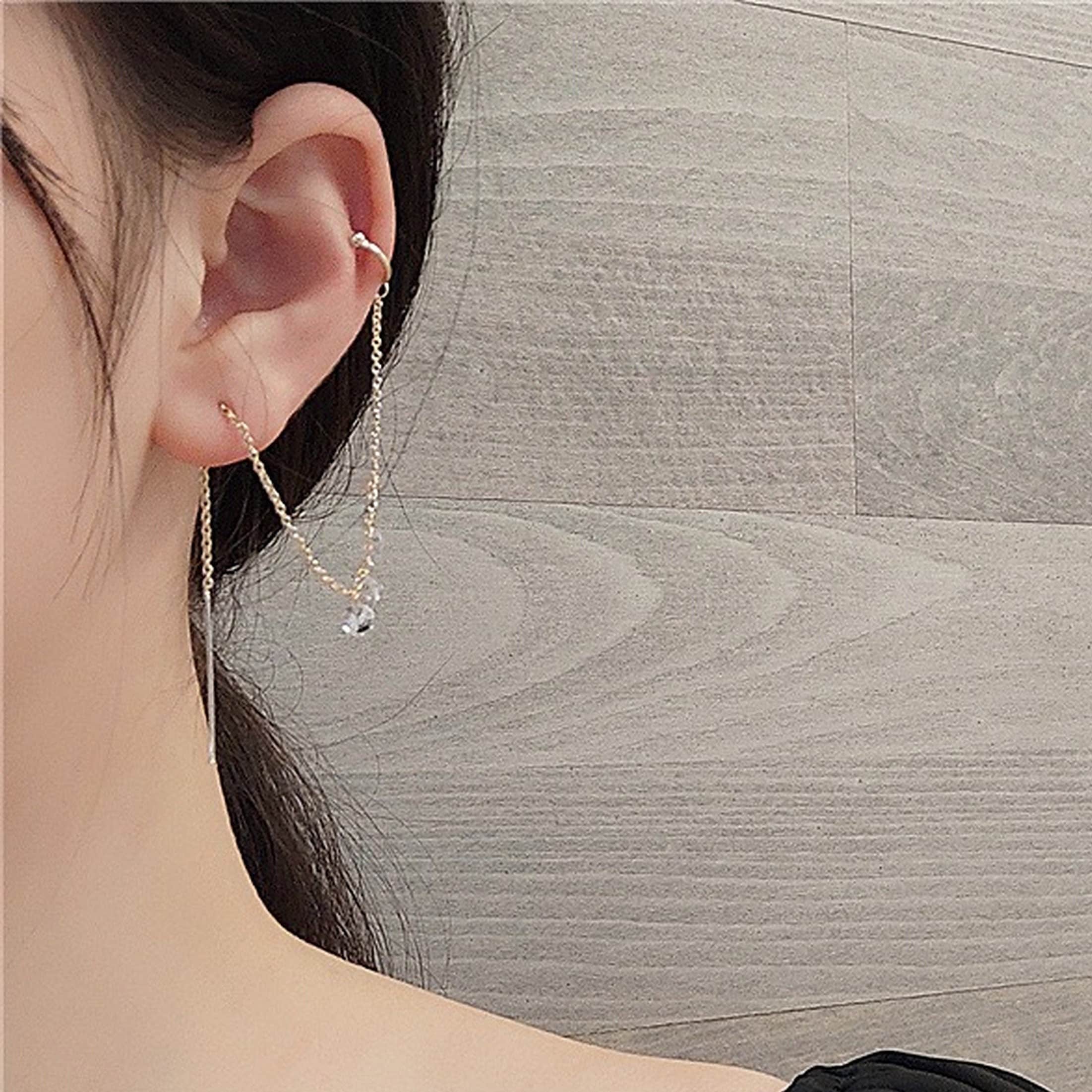 Handgefertigte, zarte Ohrmanschetten-Ohrringe mit goldenen Kristallen. Minimalistischer, zierlicher Stil. Wunderschönes, einzigartiges Design. Nicht durchstochene Ohrmanschette und goldener Einfädlerverschluss. Mit vier funkelnden, baumelnden Zirkonia-Kristallen. Süß und feminin. Exquisite Handarbeit. Verkauft als 1 Stück.