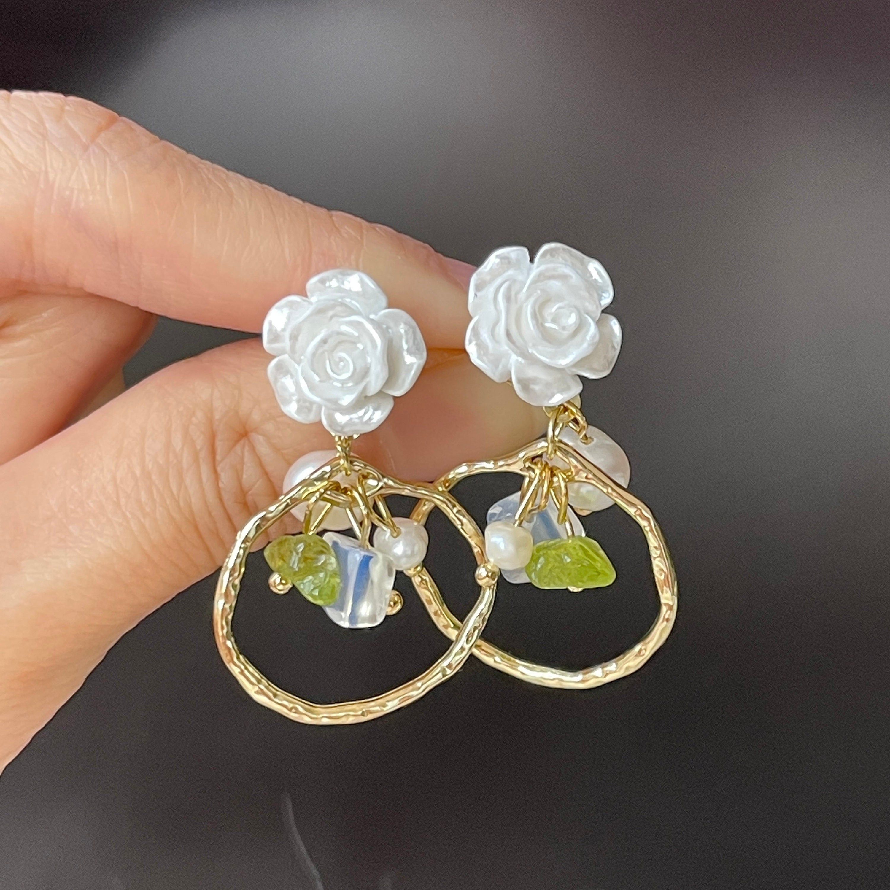 Einzigartig! Wunderschöne Ohrstecker mit Rosenblüten aus Naturperlen und goldenen Creolen. Mehrfarbige Edelstein-Ohrhänger. Zarte, handgefertigte Creolen mit baumelnden Kreisen. Zierliche, glitzernde und elegante Vintage-Vibes, die Ihr Outfit aufwerten! Auch eine tolle Geschenkidee für Freunde und Familie. Wunderschöne Brautjungfern-Hochzeitsgeschenke. Handgefertigt aus Süßwasser-Naturperlen und 14 Karat vergoldetem Sterlingsilber. Hypoallergen. Gut für empfindliche Haut!