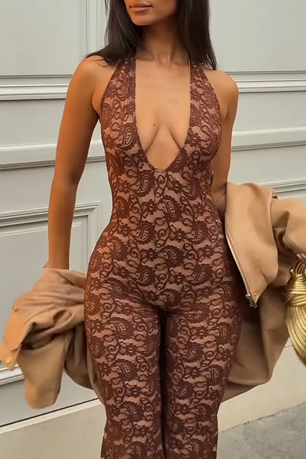 Deep V Neck Halter Paisley Pattern Lace Capri Jumpsuit - Brown Pre Order