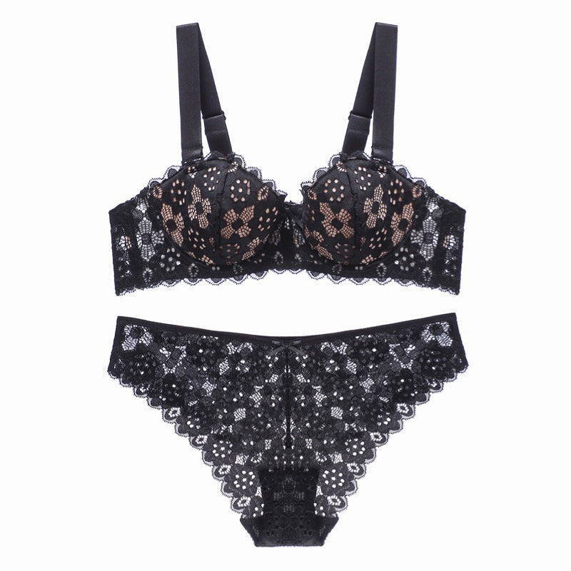 Das Push-Up-BH- und Höschen-Set mit Blumenstickerei ist ein sexy Dessous-Set, das ein BH- und Höschen-Set mit Spitzenbesatz umfasst. Der BH ist mit einem Blumenmuster verziert und hat einen tiefen Ausschnitt, eine niedrige Leibhöhe und ein Push-Up-Design. Das Höschen ist aus weicher Spitze und hat eine hohe Taille, die zusätzlichen Schutz bietet.