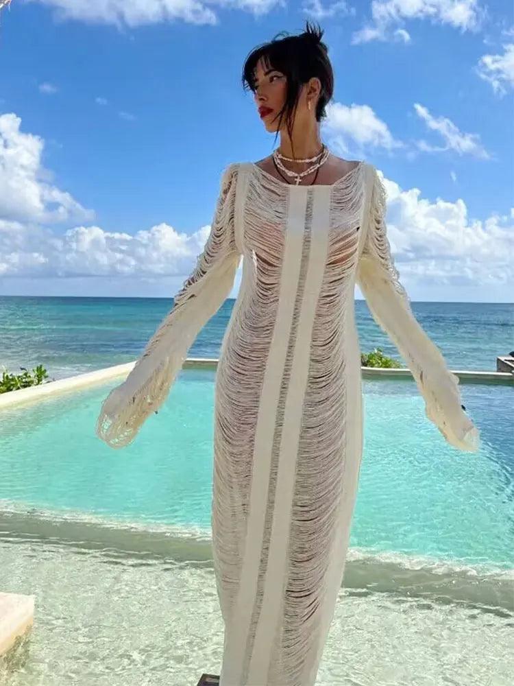 Weißes gestricktes Maxi-Strandkleid mit Fransen, rückenfreies Strandkleid mit Schnürung