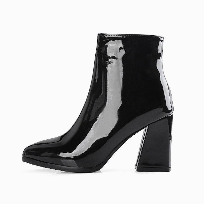 Dieses Paar Stiefeletten verleiht Ihrer Alltagskleidung einen coolen Touch. Hergestellt aus PU-Emaille-Leder und Gummi. Das hochglänzende Vorderblatt fällt auf. Mit knöchelhoher Oberlinie mit Reißverschluss an einer Seite. Scharfe, spitze Zehenpartie vorne. Blockabsatz mit Fersenkappe aus Gummi. Und eine rutschfeste Gummilaufsohle. Weitere trendige Damenstiefel und einzigartige Schuhe finden Sie in unserer Boutique. Kombinieren Sie die stylischen Stiefel mit allem von verkürzten Jeans bis hin zu Kleidern und Röcken für einen modernen, schicken Street-Look. - Absatzhöhe: 8 cm.