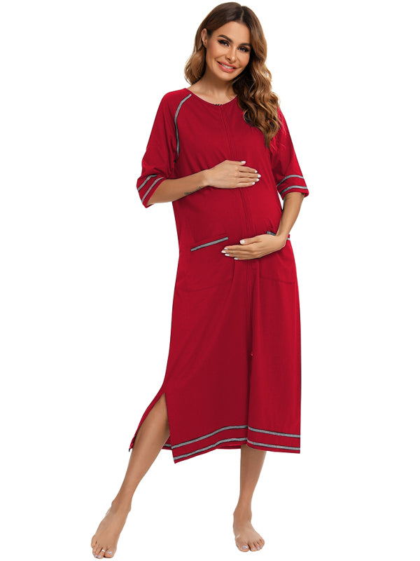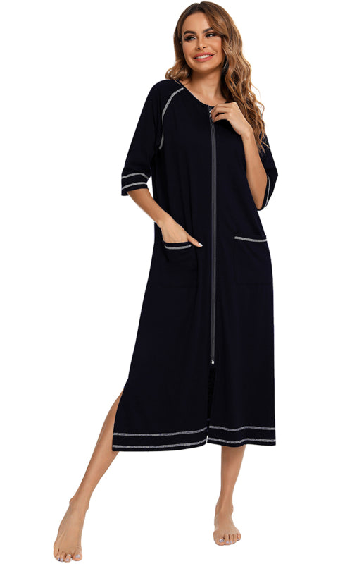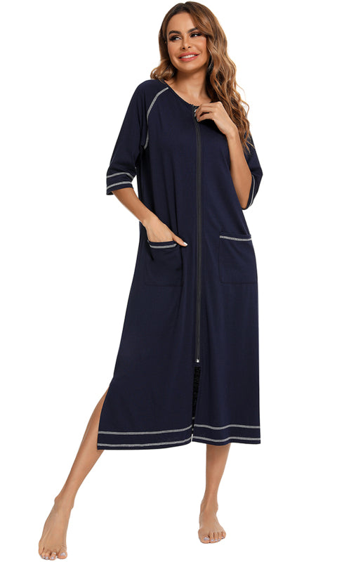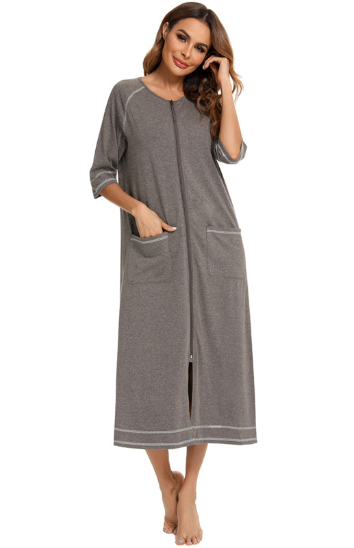 This leisure nightdress is perfect for relaxing at home.Crafted from soft. lightweight polyester fabric.The loose fit ensures maximum comfort and freedom.Features three quarter sleeves and a round neckline.Handy front pockets add convenience to your loungewear.Pair with slippers for a cozy and stylish look.