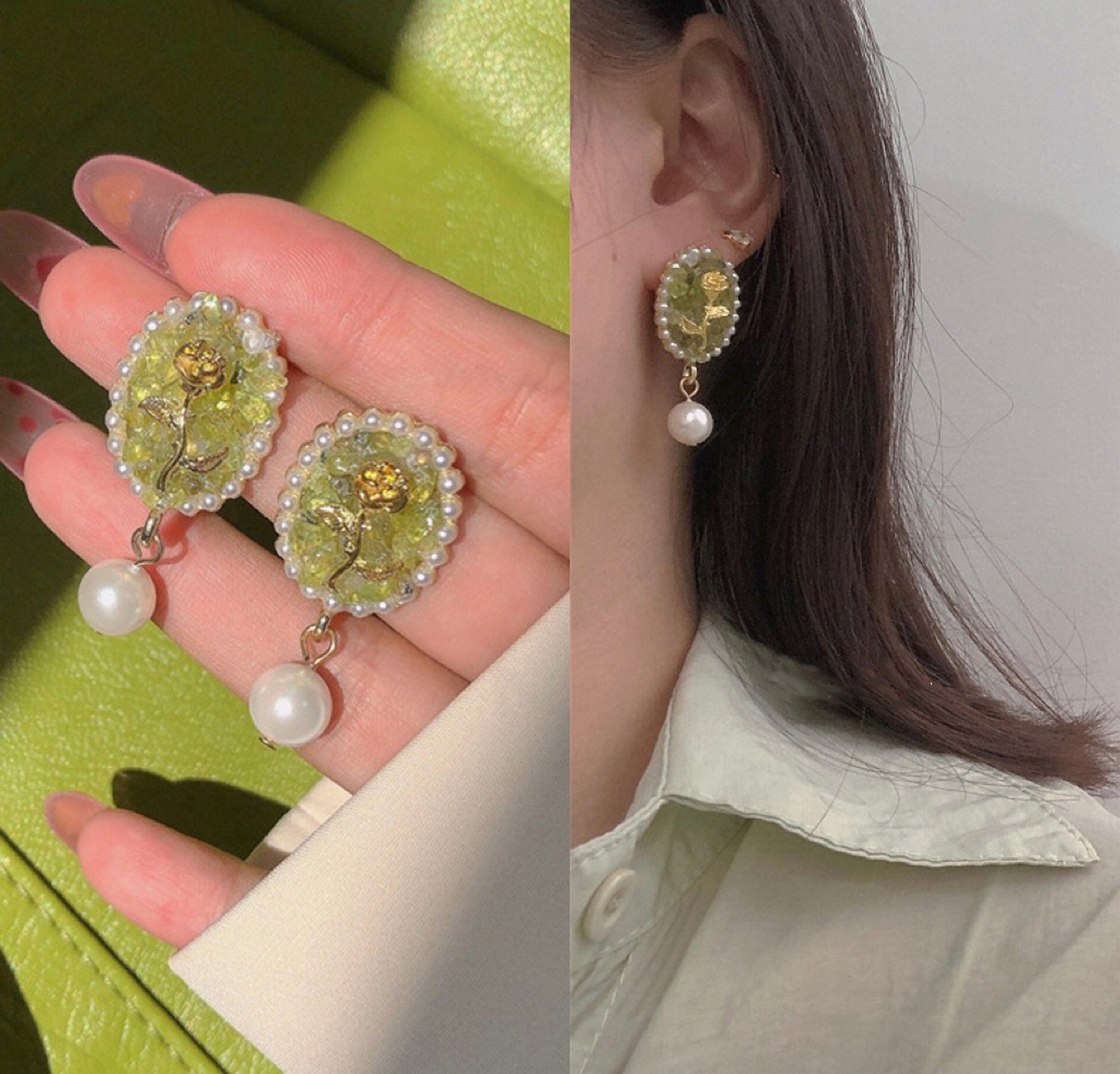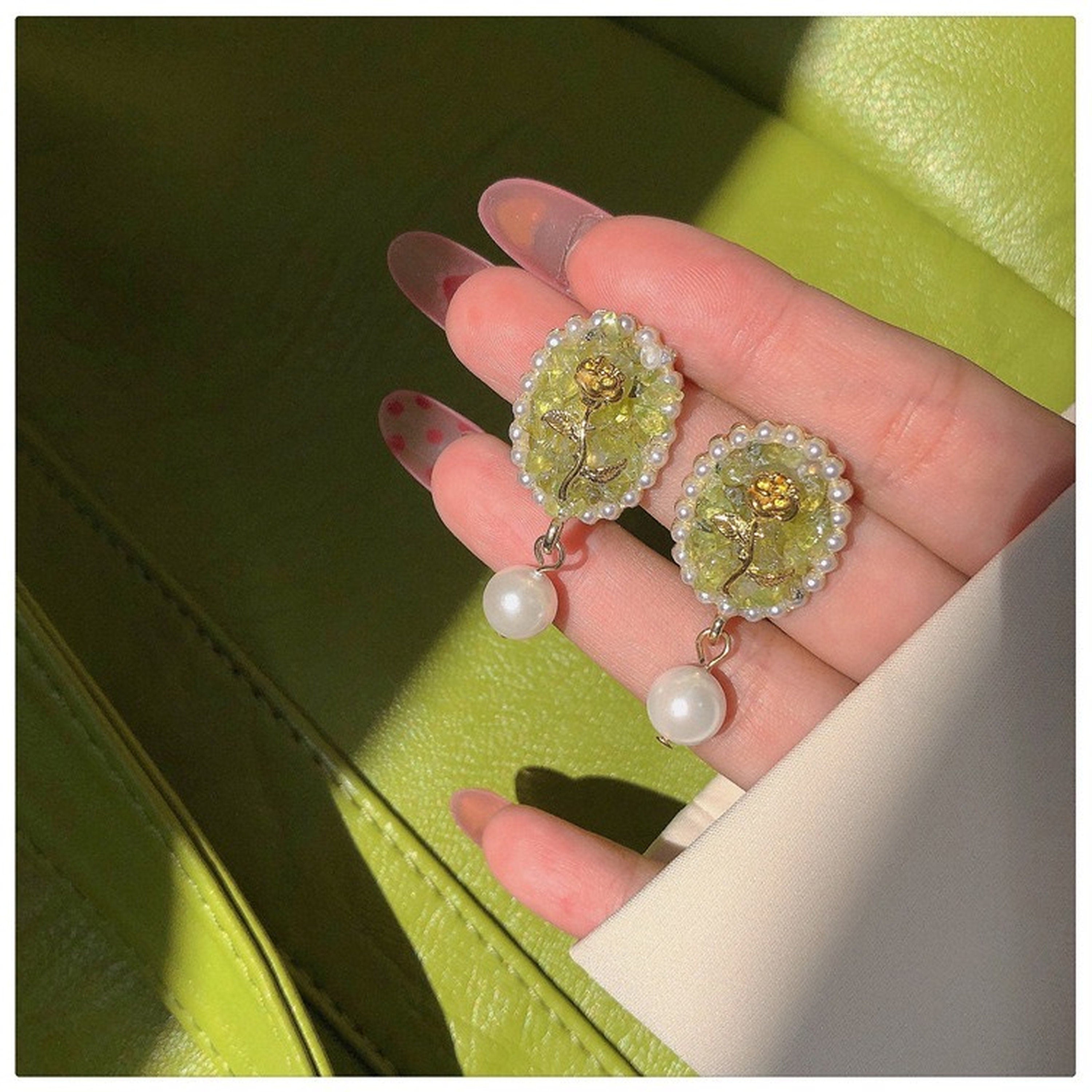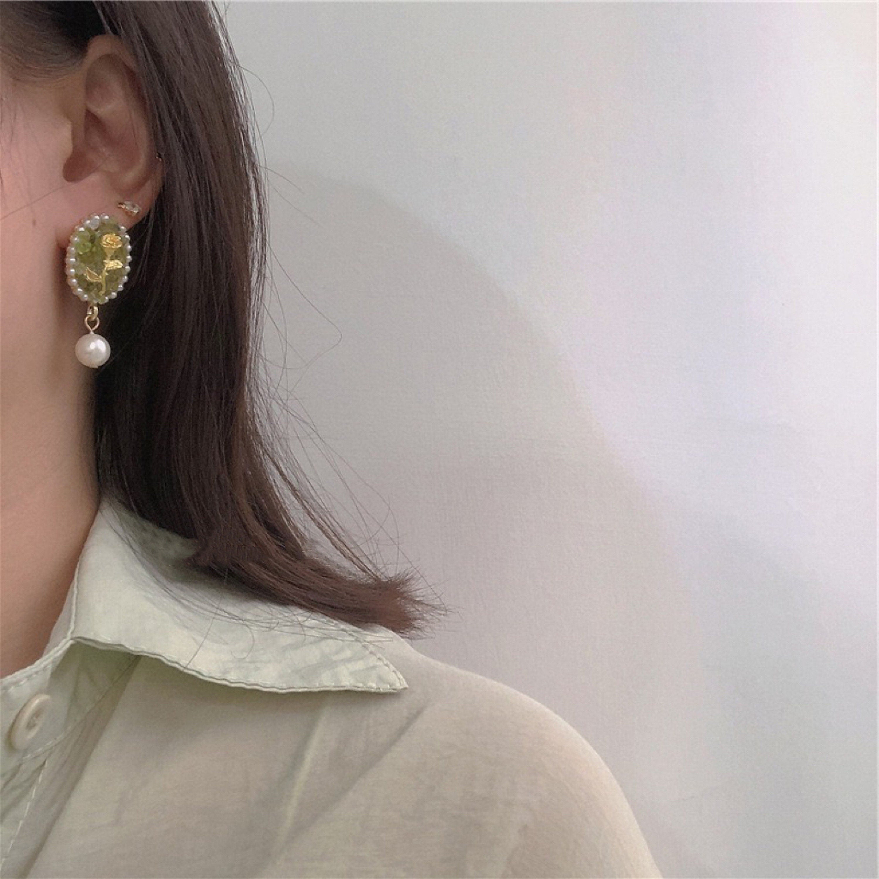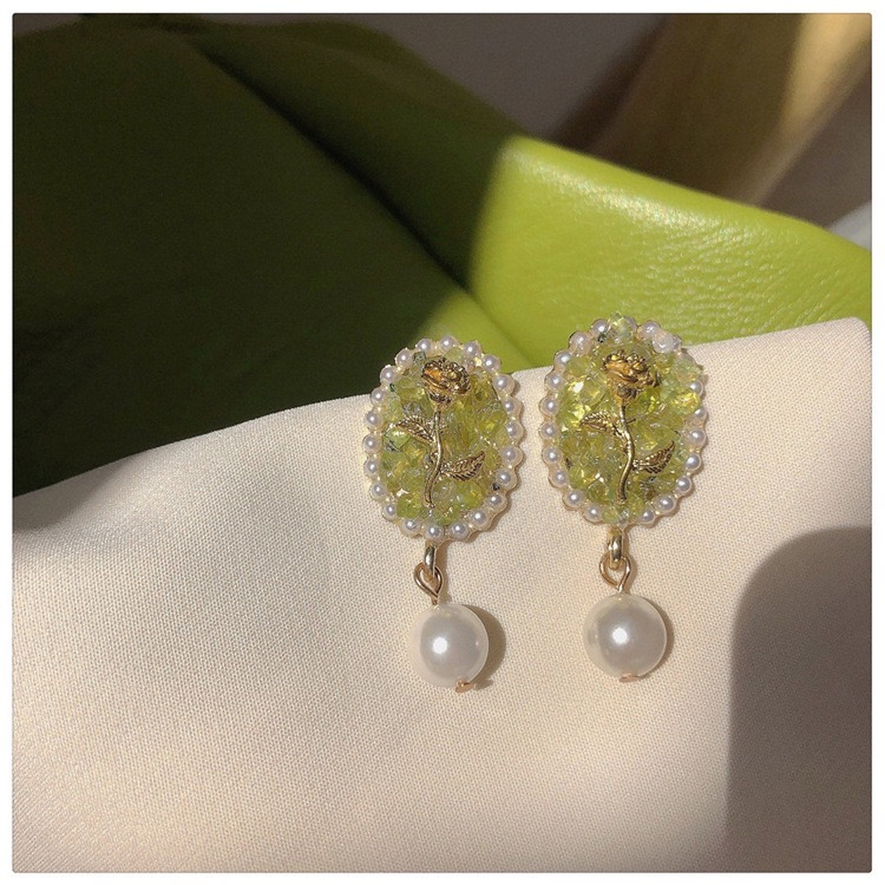 Wie eine frische Brise – goldene Rose im Vintage-Stil, eingraviert auf einem ovalen Siegelring aus pastellgrünem Kristallquarz. Mit wunderschöner Spitze aus Barockperlen und einem süßen Perlentropfen. Französische, mädchenhafte Pariser Eleganz. Die perfekte Kombination aus Feen- und Romantik-Kern. Einzigartige Ohrringe, die Ihnen viele Komplimente und gute Laune einbringen werden!