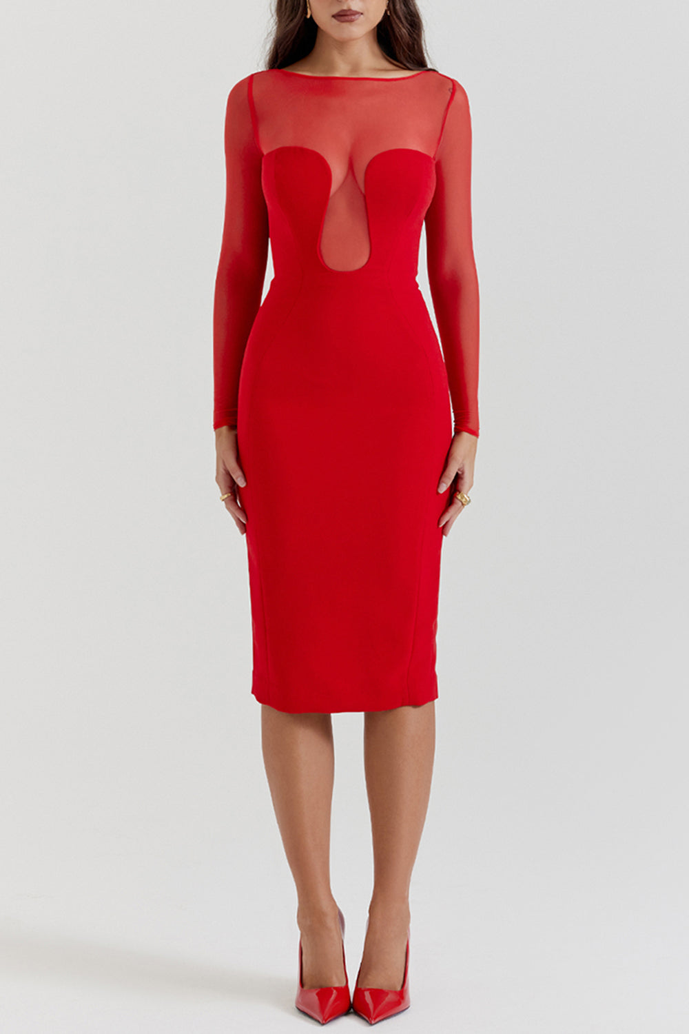 Radiant in Scarlet. it is our ultra feminine and sexy midi dress that is destined for glamorous events. The bodice is perfectly boned for ultimate support through the ultra plunging neckline and the sheer mesh and long sleeves are so flattering.