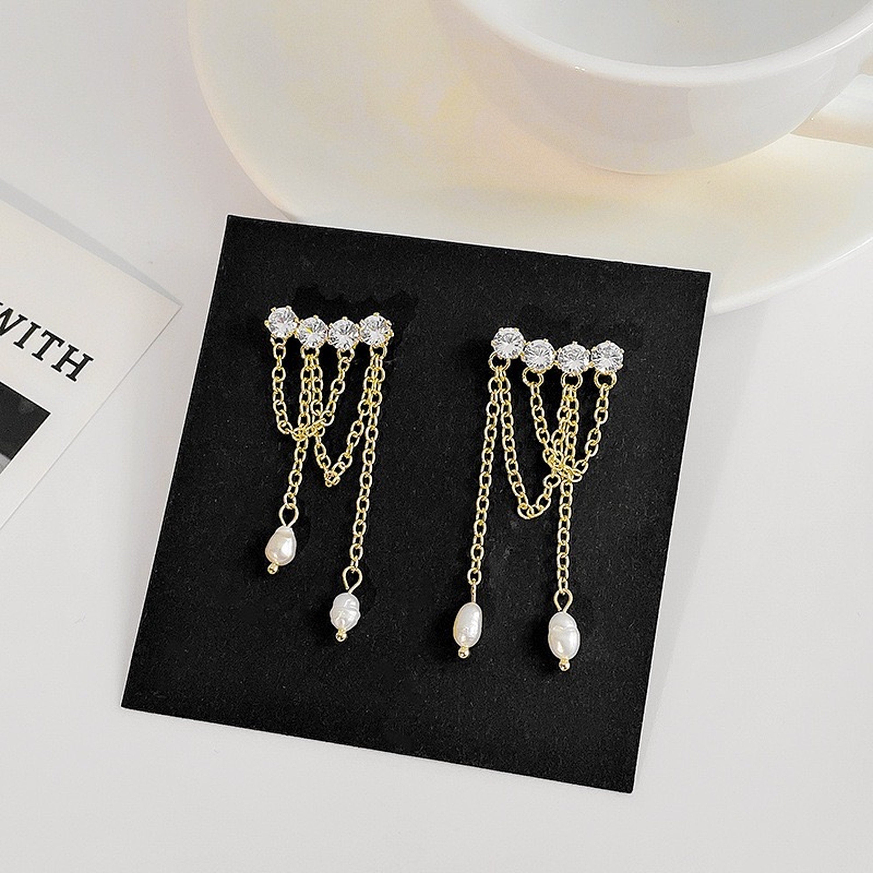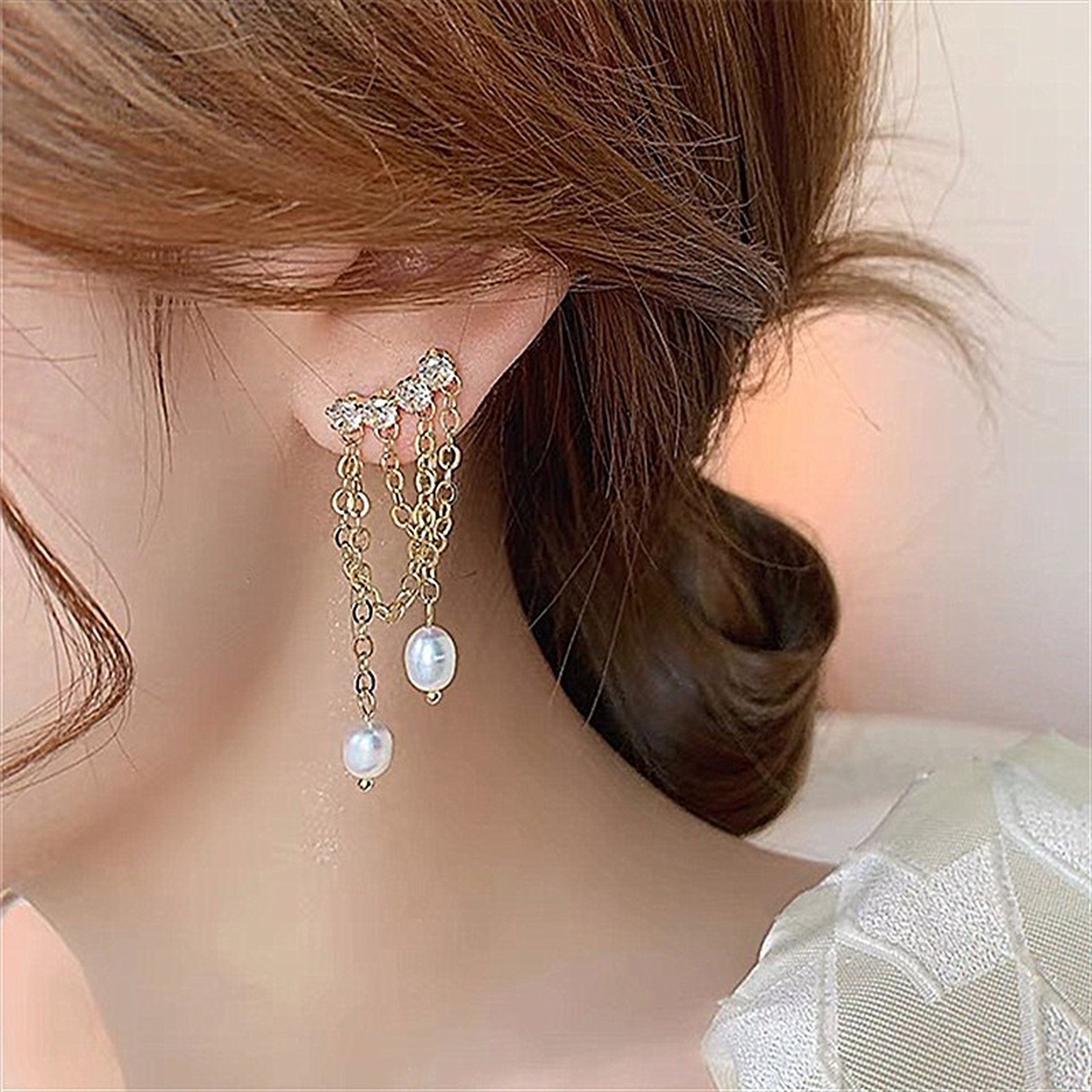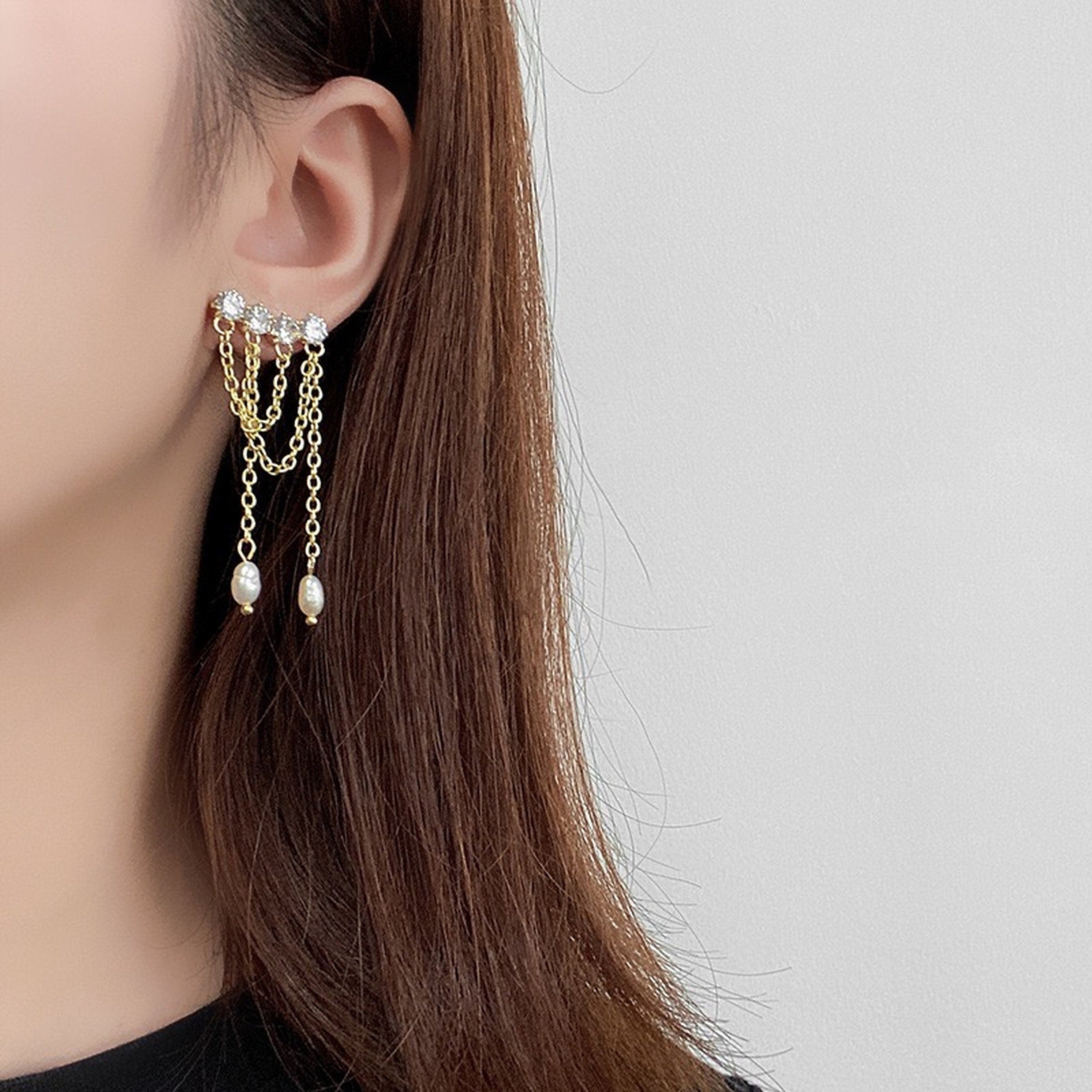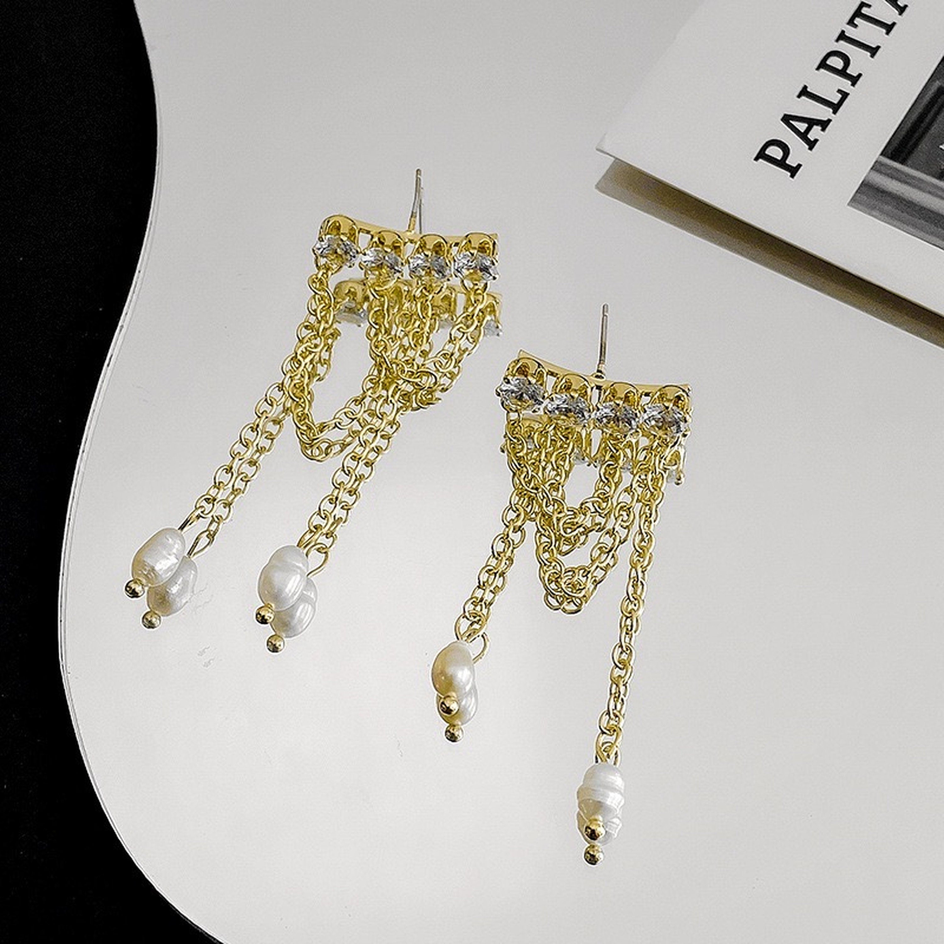Funkelnde, mehrlagige Ohrringe mit Fransen und Quasten zum Hängen. Wir haben natürliche Süßwasserperlen und Strasssteine gewählt, um diese atemberaubenden Ohrringe zu kreieren. Sie sind ein echter Hingucker und einzigartig. Ineinandergreifende, überkreuzte Quasten sorgen für einen böhmischen Akzent. Das perfekte Accessoire für jeden Anlass.