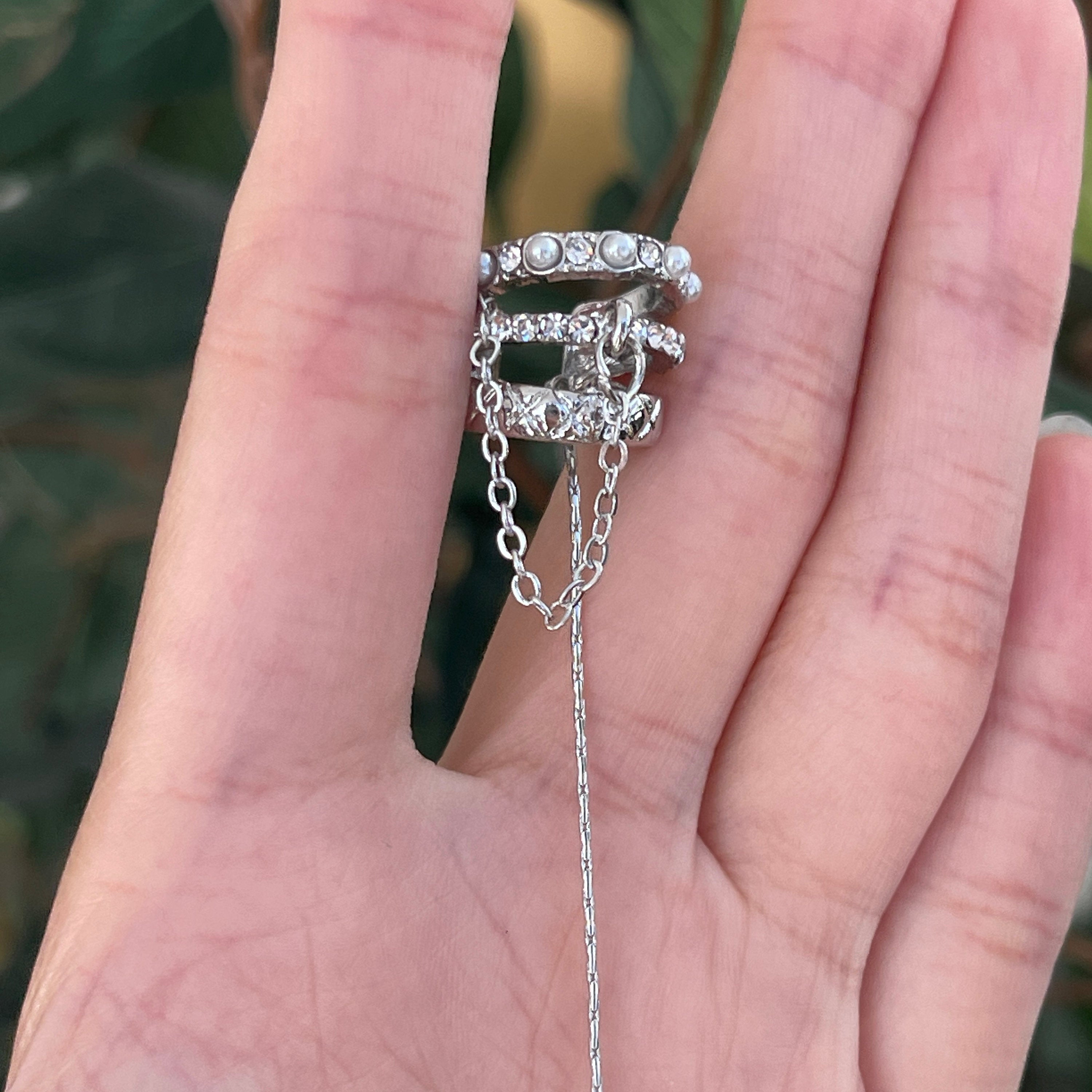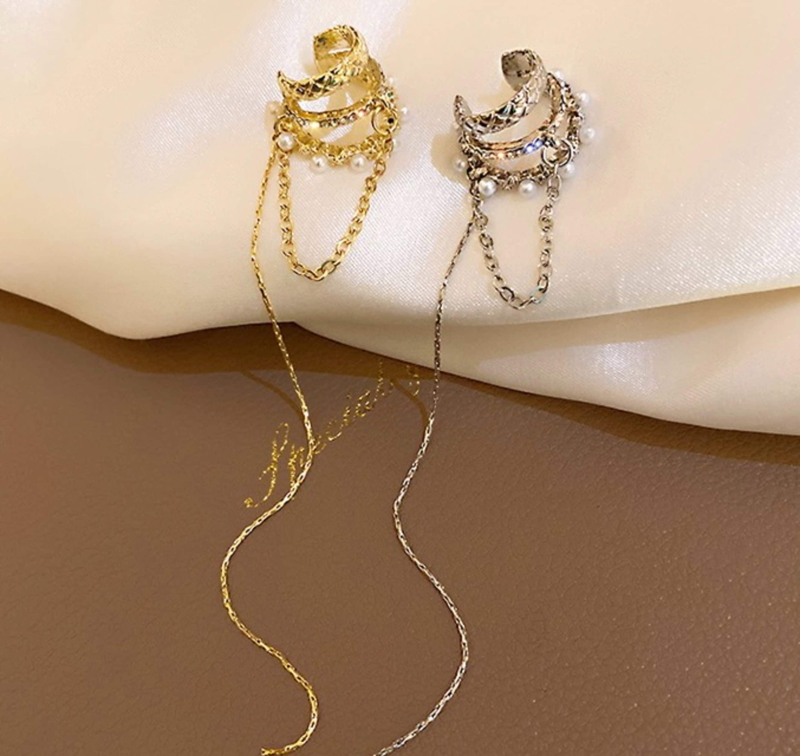 Mehrlagiger, nicht durchstochener Ear Cuff Climber mit gold-/silberner, mit Quastenfransen verzierter Hängekette. Perlen und funkelnde Zirkonia sind sorgfältig auf jeden der Bogen-Cuffs gesetzt. Super exquisit! Kein Ohrloch erforderlich. Für empfindliche Haut geeignet. Lässt sich leicht an Knorpel und Muschel anklipsen. Lange Quasten mit femininem Akzent verleihen ihm niedliche Merkmale. Passt zu jedem Outfit und Anlass. Wird als 1 Stück verkauft. Funktioniert für beide Ohren.