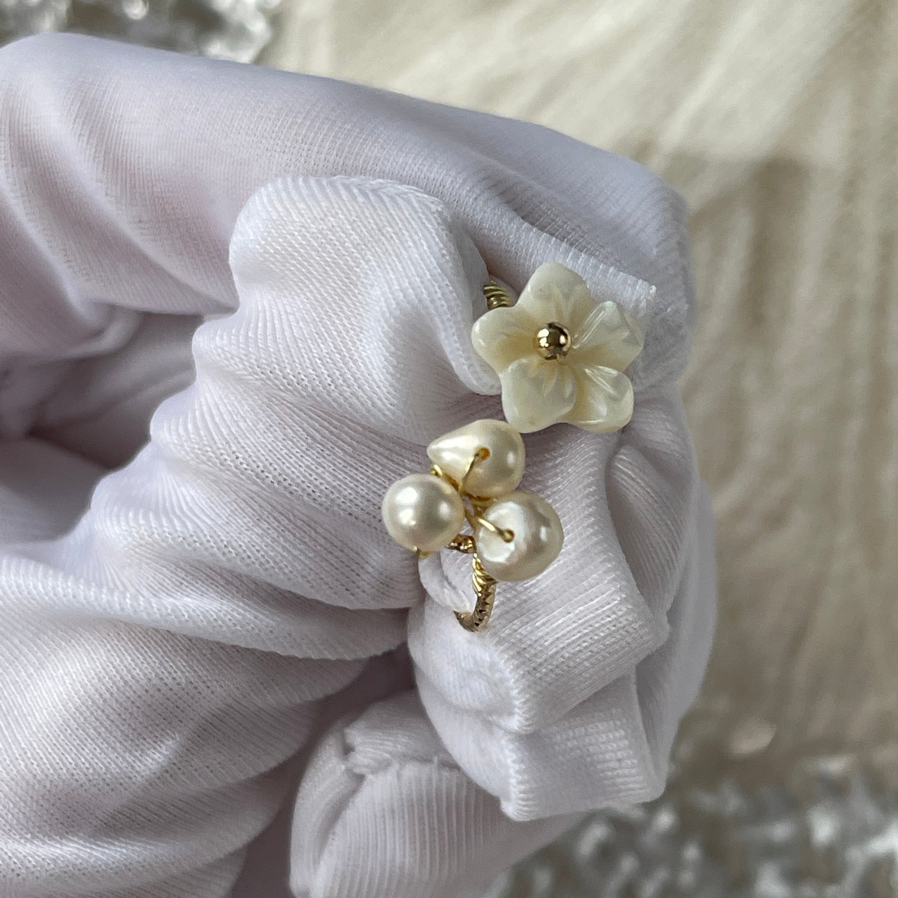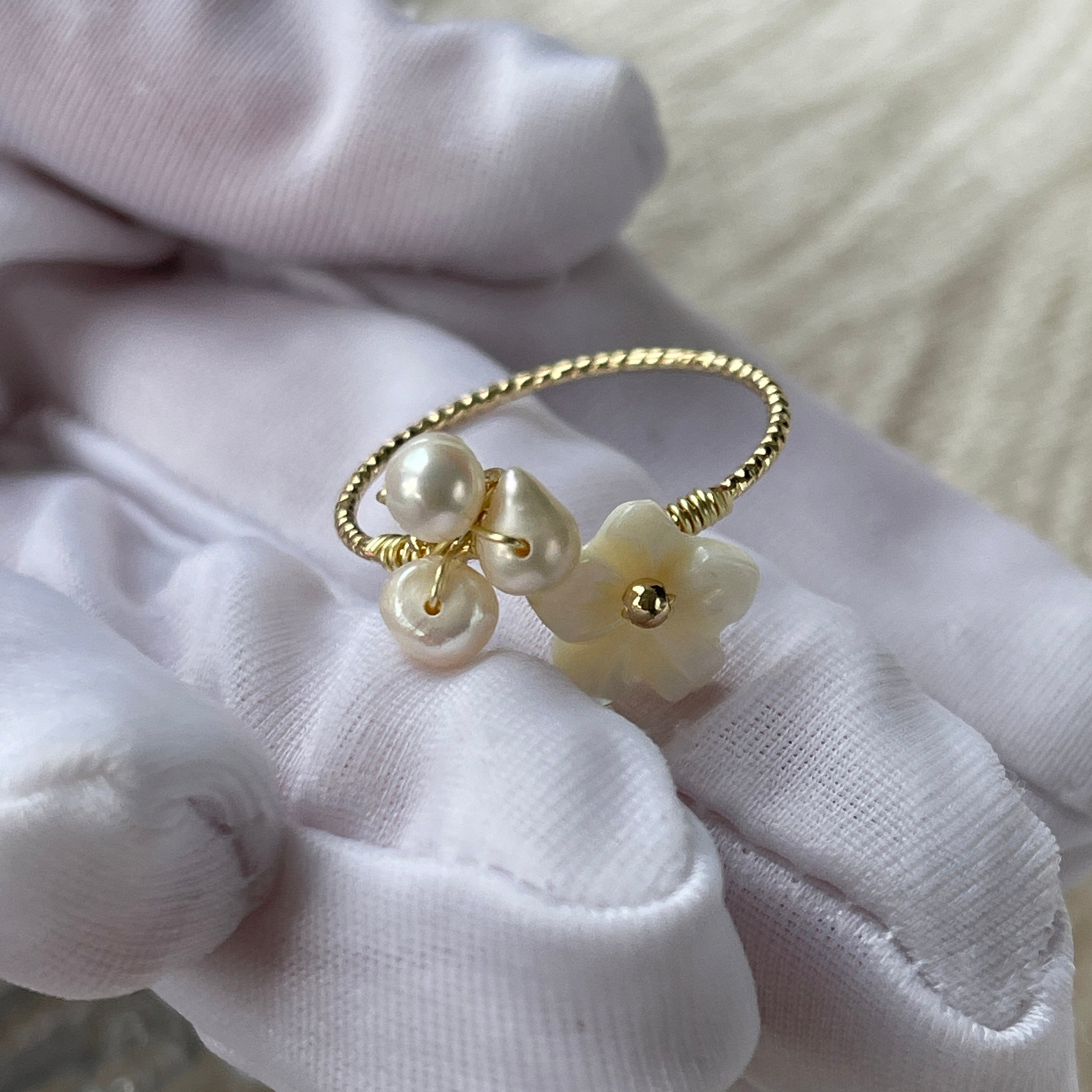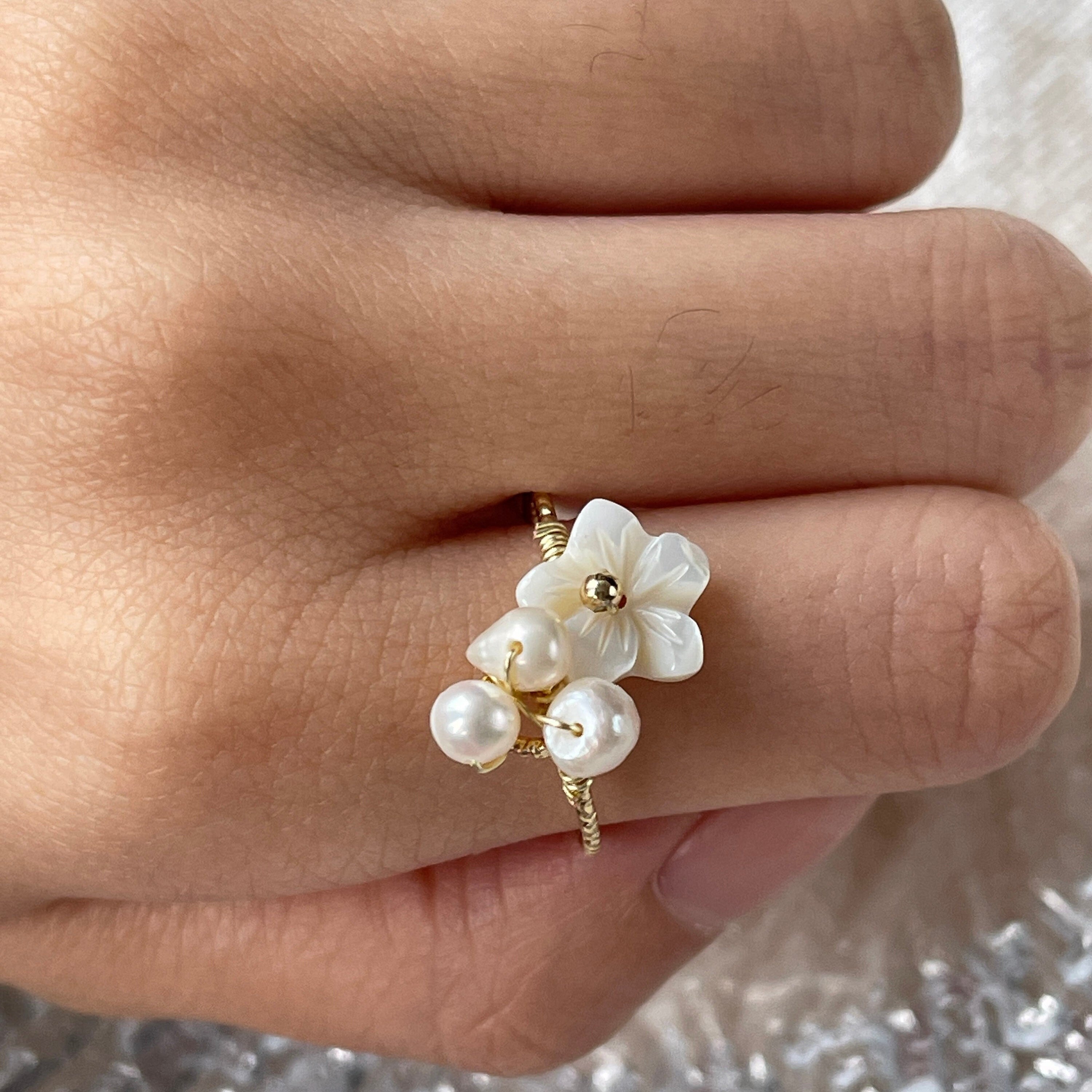 Exquisite handgefertigte natürliche Süßwasserperle, die an einem Ende gebündelt ist. und Kirschblütenmuschelblume am anderen Ende. Gedreht mit zierlichem 14-Karat-Gold-Finish. Feminine, süße, mädchenhafte Ausstrahlung. Super zart und elegant! Offener und verstellbarer Ring. Passend für US-Größen 4 bis 10. Einfach zu tragen und zu stapeln. Verleihen Sie Ihrem Alltags-/Anlass-/Braut- oder Brautjungfern-Look etwas Würze. Seien Sie ganz einfach die Glanzvollste. Perfekte Geschenkidee für Sie selbst und Ihre Lieben :)