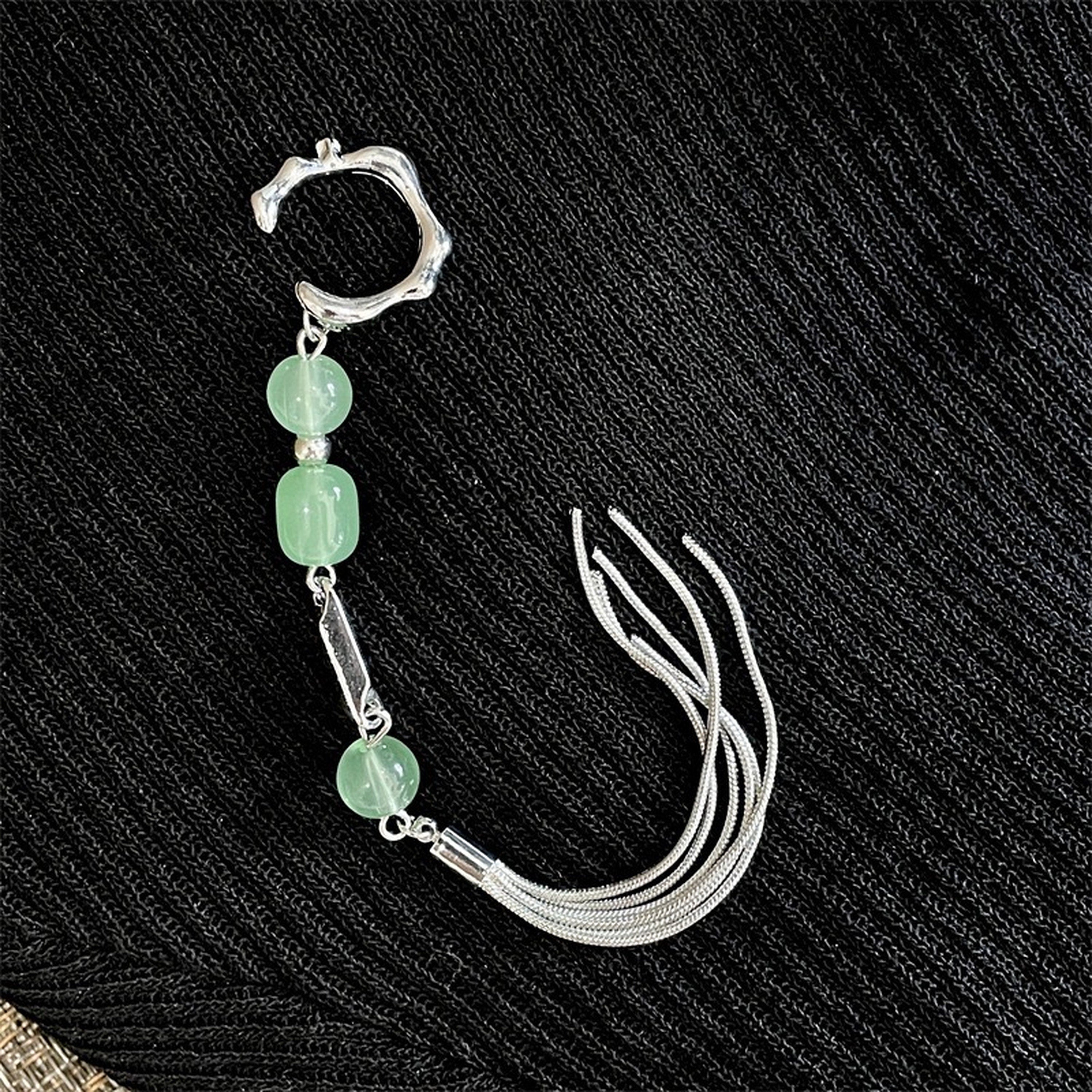Exotische grüne Jade-Ohrmanschette mit langer Quaste, die nicht durchstochen werden kann. Lange Statement-Ohrringe im Bohemian-Stil mit leicht orientalischem Akzent. Ohrschmuck im Vintage-Stil, aber dennoch modern und schick. Kein Ohrloch erforderlich. Einfach an der Helix anzubringen. Verkauft als 1 Stück.