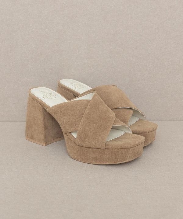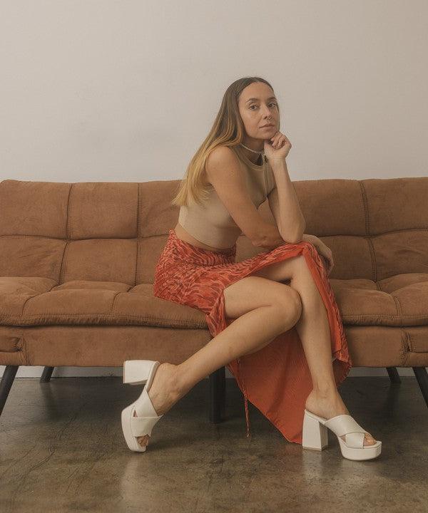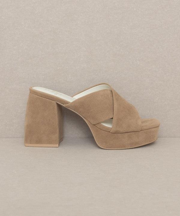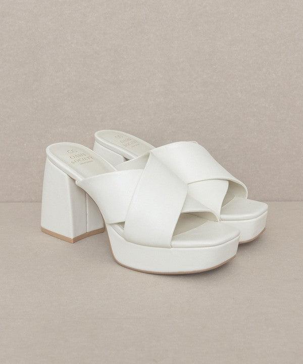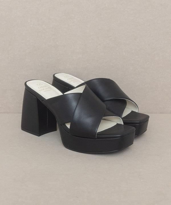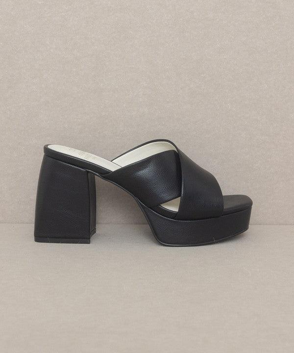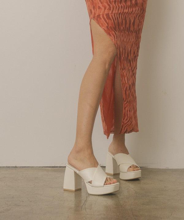 Ein großer, auffälliger, klobiger Absatz verleiht dieser Sandale mit doppeltem Plateau eine besondere Note.