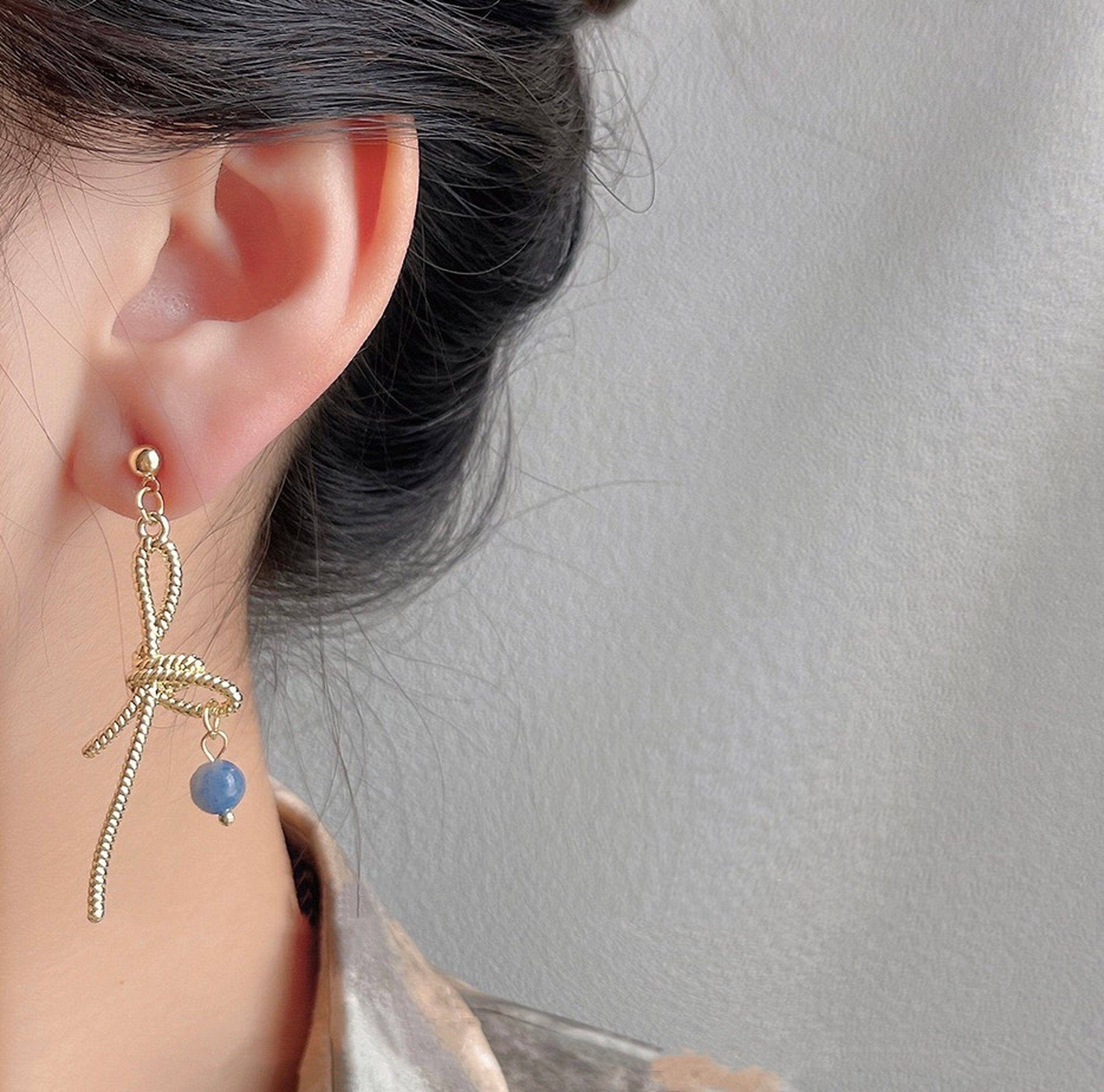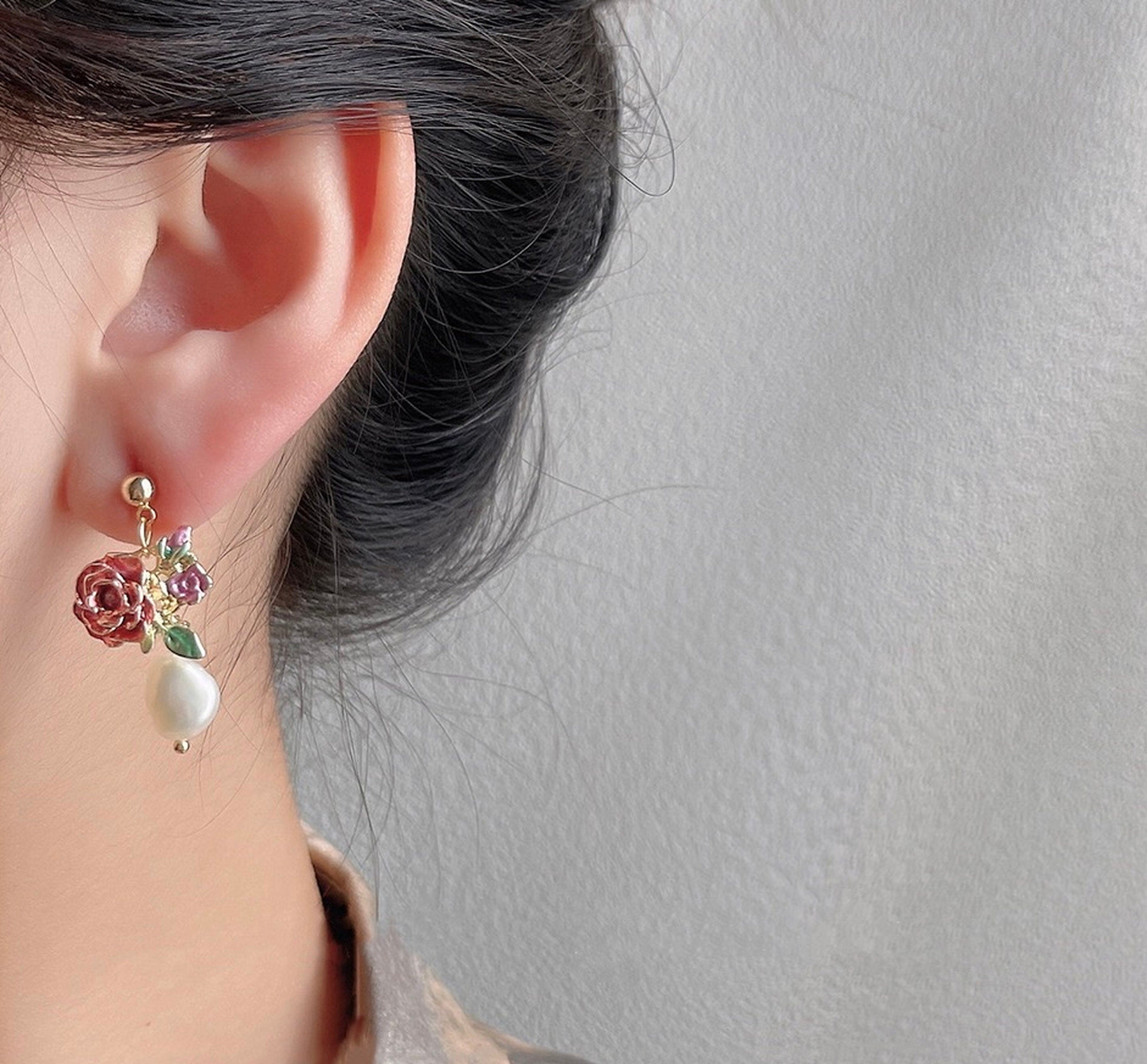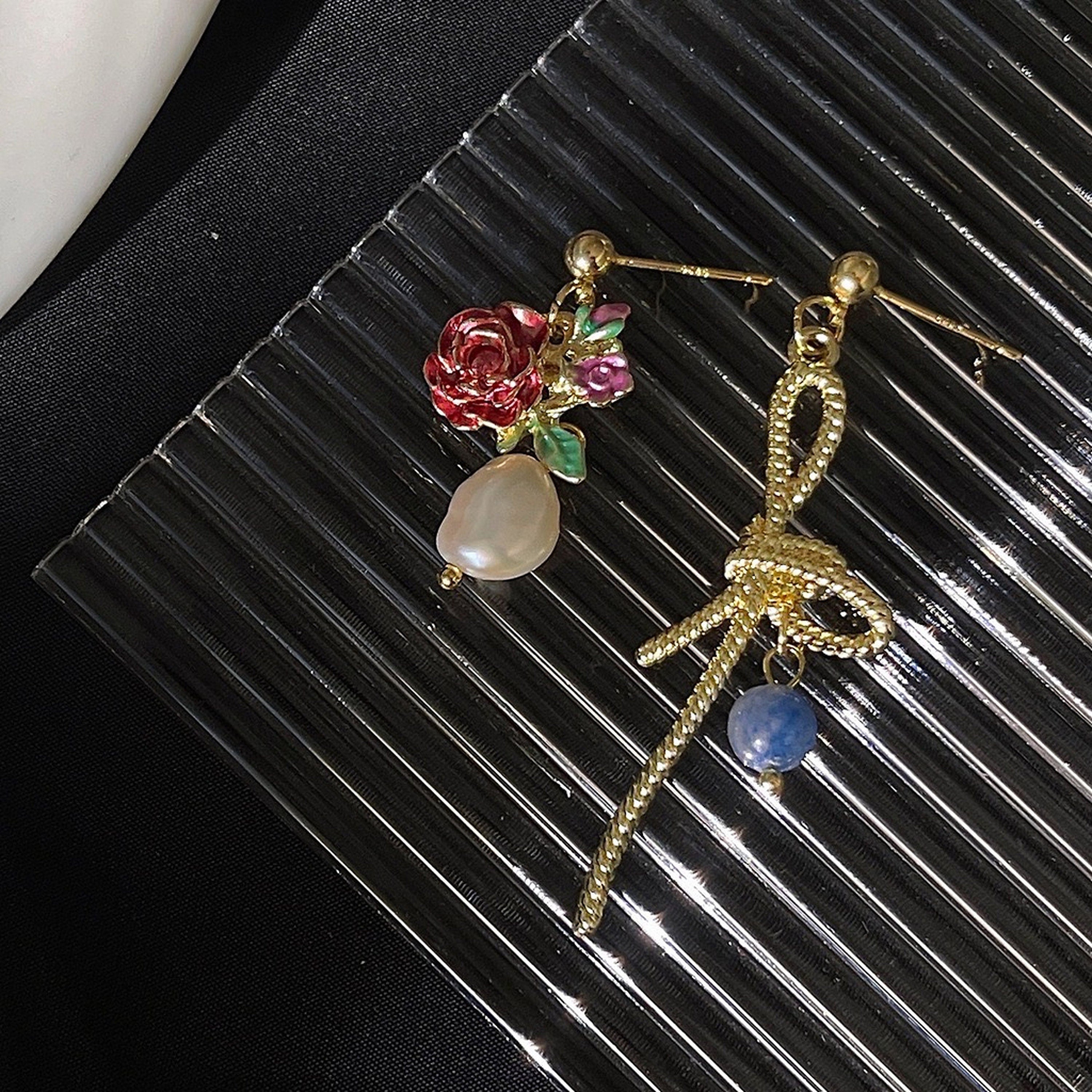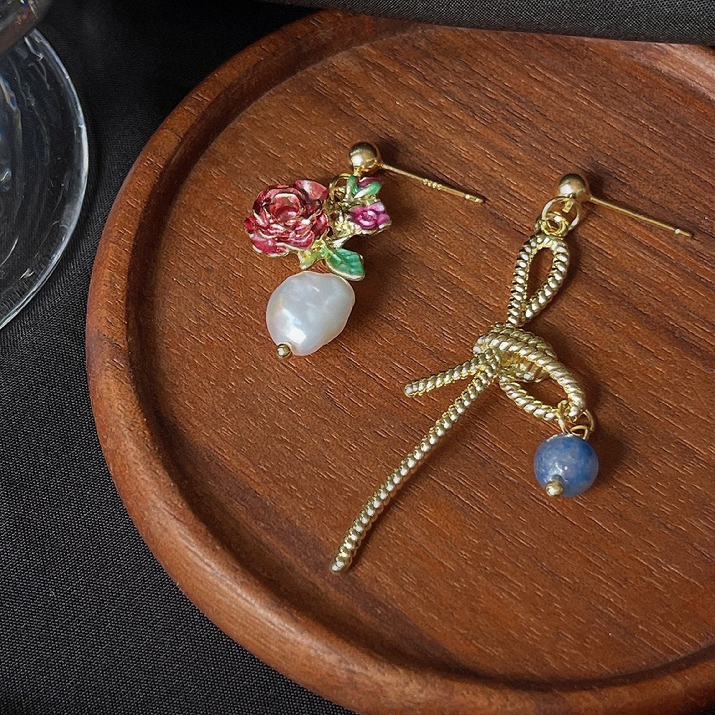 Atemberaubende, ungleiche, asymmetrische, romantische Ohrringe. Eine Seite ist eine baumelnde Schleife aus goldenem Spitzenband. Die andere Seite ist eine zarte rosa Rosenblüte und ein baumelnder Tropfen aus Naturperlen. Eleganter, romantischer Stil. Handarbeit in Top-Qualität. Wunderschöne, schicke Ohrringe. Sehr auffällig und einzigartig.