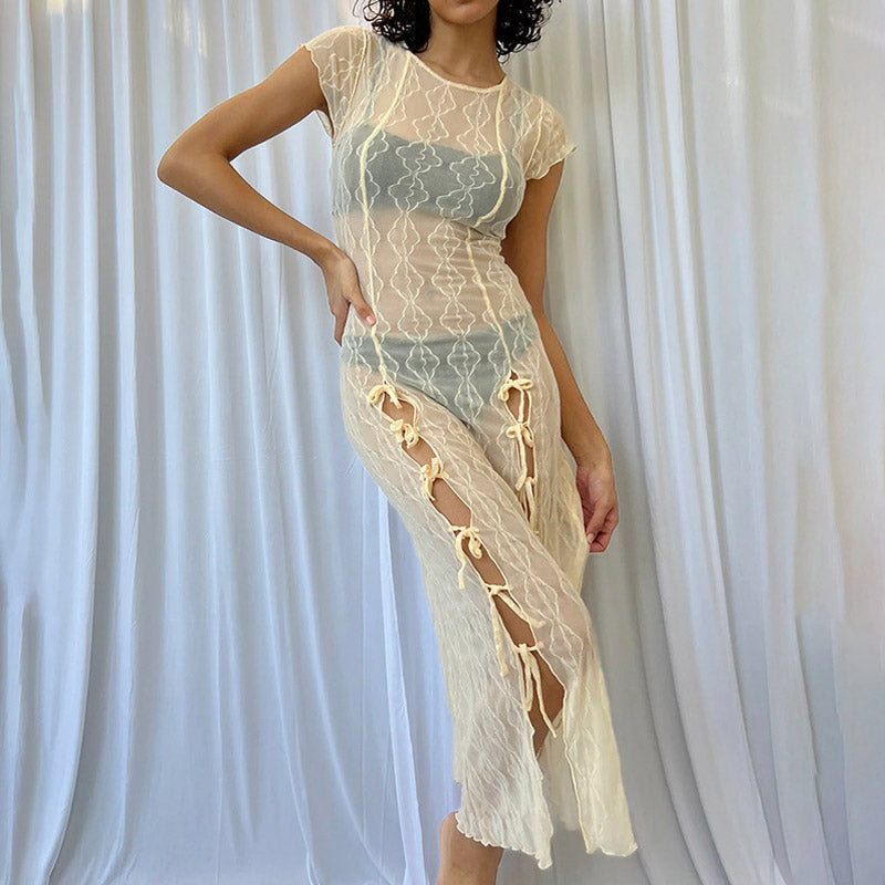 Ein bisschen Transparenz schadet nie! Mit einem zarten Spitzendesign, das Eleganz und Weiblichkeit ausstrahlt, bietet dieses Kleid einen gewagten und doch anspruchsvollen Look. Die figurbetonte Passform, die Flügelärmel und der runde Ausschnitt sorgen für eine schmeichelhafte und bequeme Passform, während der hohe Schlitz mit mehreren Fliegenverzierungen einen Hauch von Verspieltheit und Sinnlichkeit verleiht. Das Urlaubs-Midikleid ist ungefüttert, aus Spitze gefertigt und hat einen transparenten Stil. Vervollständigen Sie Ihren trendigen Urlaubsstil, indem Sie dieses Kleid mit unserem einzigartigen klassischen einfarbigen Boutique-Bikini-Set kombinieren. Egal, ob Sie am Pool faulenzen oder am Strand spazieren gehen, in diesem Kleid sehen Sie selbstbewusst und schick aus und fühlen sich auch so.