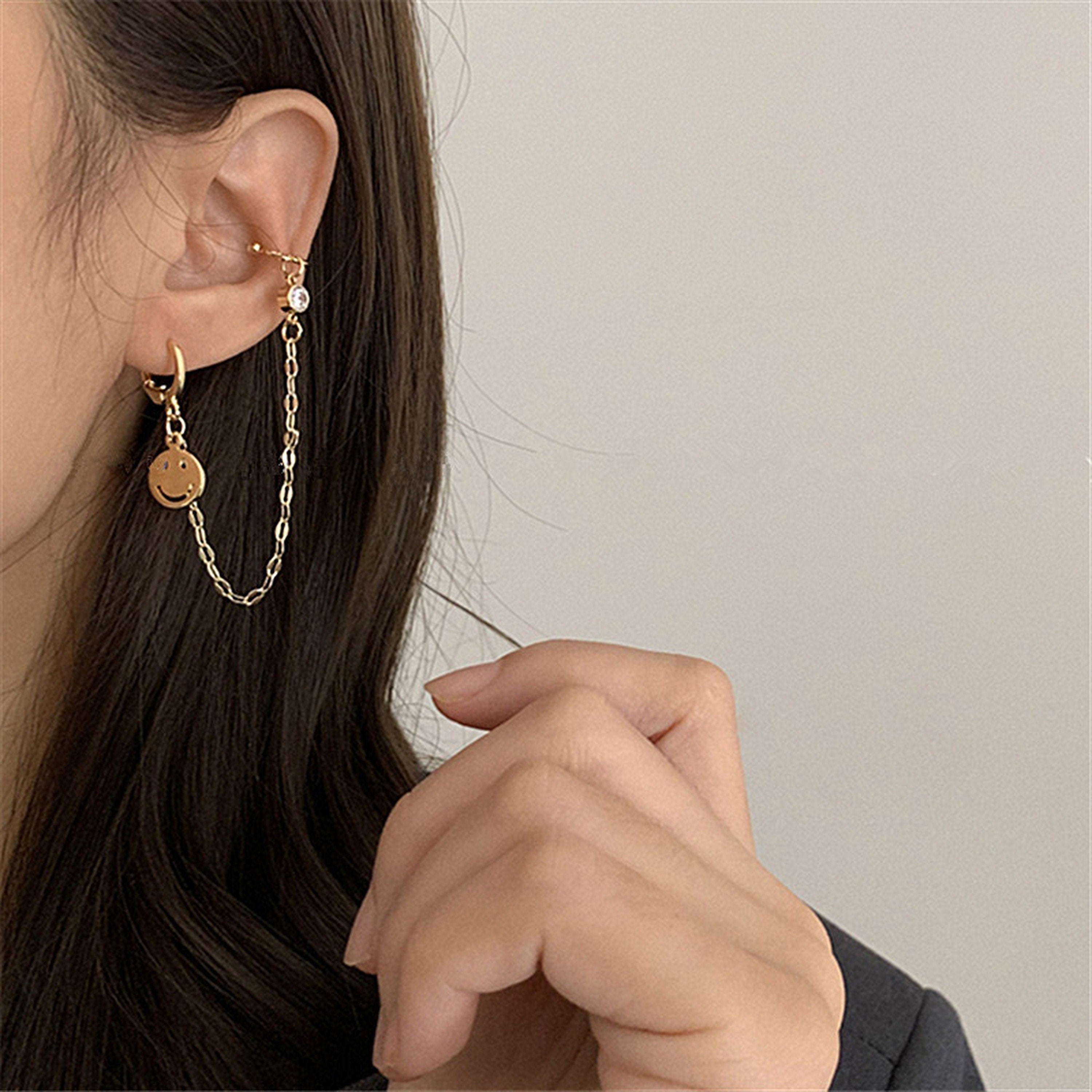 Ohrclip mit goldenem Emoji-Smiley und glücklichem Gesicht. Y2K-Punk-Streetwear-Stil. Mit goldener baumelnder Gliederkette. Stilvoll und kreativ! Auffälliges, lustiges Design. Ein funkelnder Zirkonia-Tropfen sorgt für zierliche, schicke Ausstrahlung. Handgefertigt aus vergoldetem Messing. Nicht durchstochener, verstellbarer Muschelknorpelverschluss und durchstochener Ohrläppchenverschluss. Passt zu jedem Outfit. Werten Sie Ihren Stil mühelos auf. Haben Sie einen schönen Sommer!