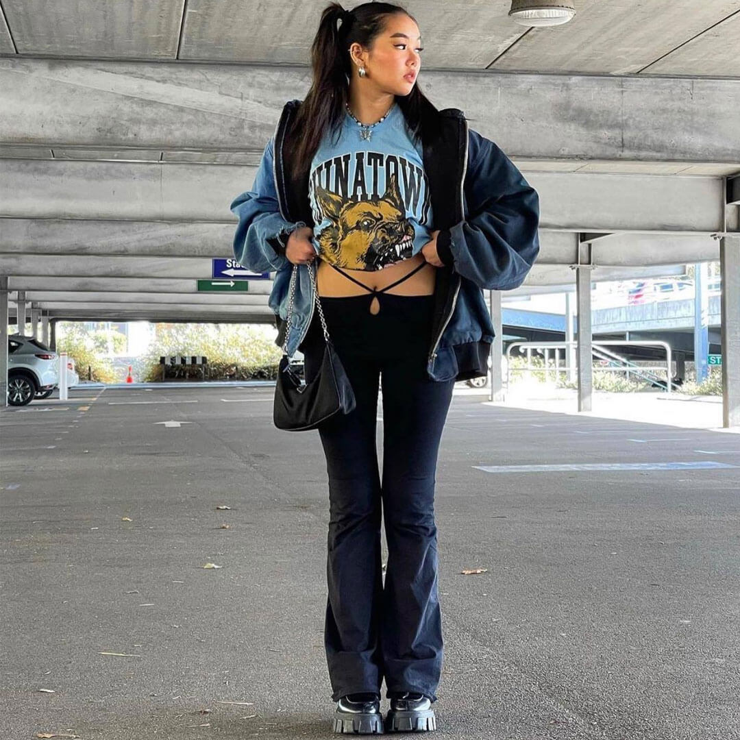 Setzen Sie mit diesen minimalistischen Leggings ein lässiges und doch alltagstaugliches Style-Statement. Hergestellt aus dehnbarem Polyester und Elastan. Sie fallen durch den elastischen Bund und den Cut-out-Effekt auf der Vorderseite auf. Mit Schlaghosenbeinen und langer Länge. Weitere trendige Damenhosen mit weitem Bein oder einzigartige Kleidung finden Sie in unserer Boutique. Kombinieren Sie sie mit allem für einen auffälligen Look.