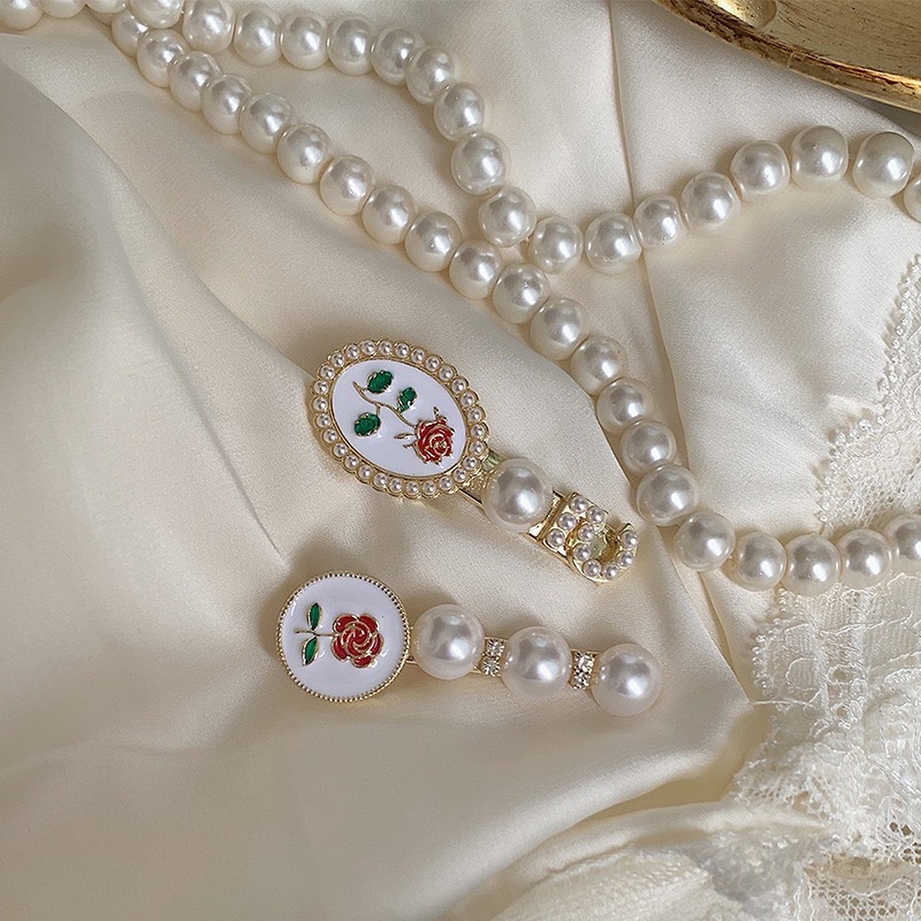 Haarspangen im Prinzessinnenstil „Die Schöne und das Biest“ mit roten Rosen, Perlen und Gold. Haarschmuck. Haaraccessoires. Atemberaubende, zarte handgezeichnete rote Rosenblüte mit Gravur auf weißem Emaille. Mit Barockperlen-Cluster auf antiken goldenen Haarspangen. Wunderschöne romantische Vintage-Akzente. Feminin und doch elegant. Perfektes Haaraccessoire für Brautjungfern. Sieht auch als Haarschmuck für jeden Tag fantastisch aus und unterstreicht Ihren einzigartigen Stil! Zwei süße Designs zur Auswahl /p>