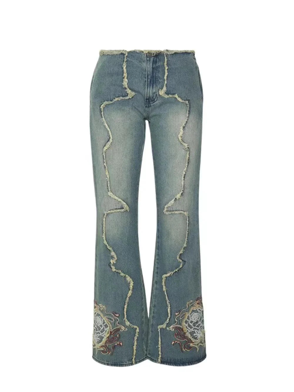 Pantalones de pierna recta viejos con bordado con flecos retro adelgazantes únicos y sexys para niñas de 2024