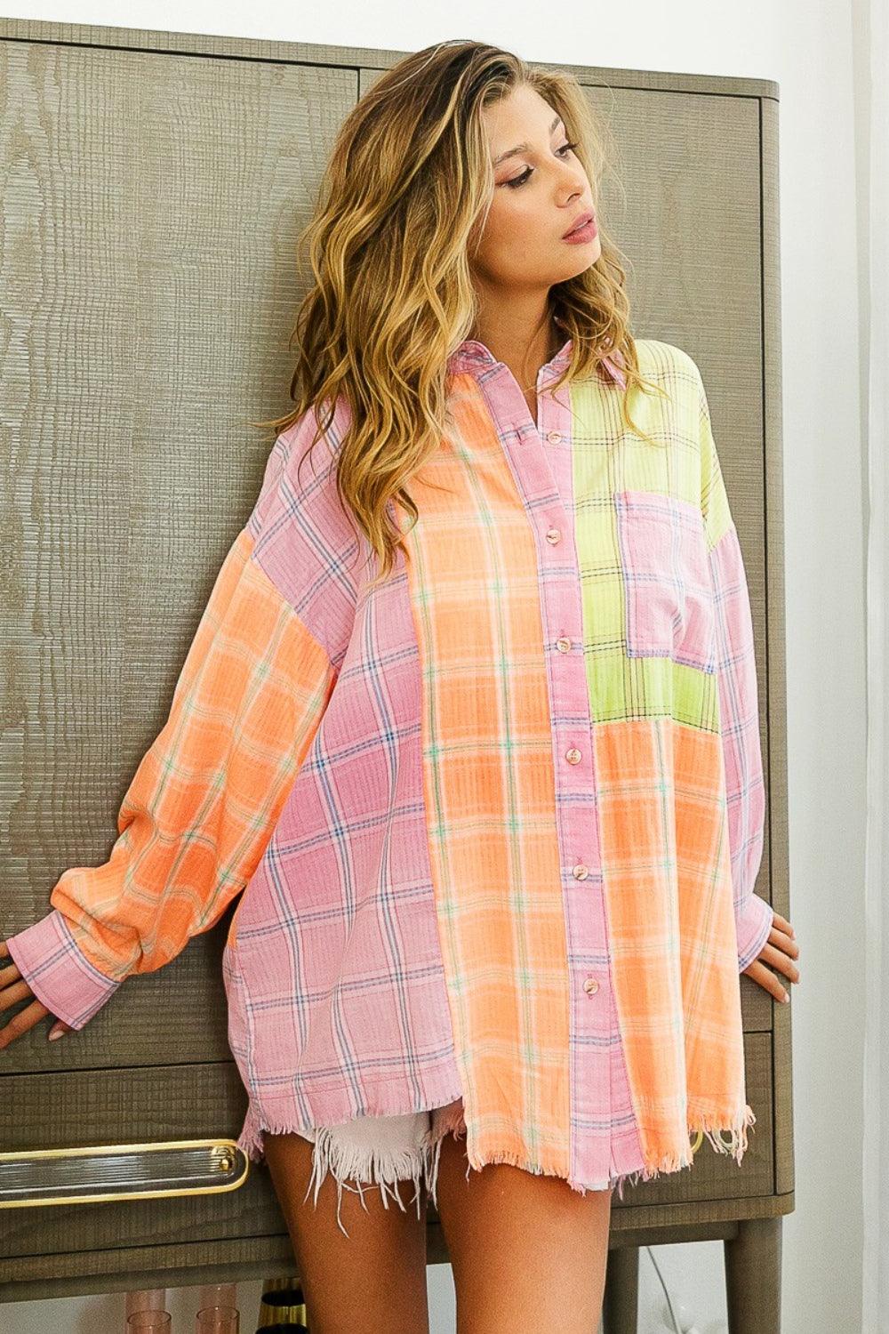 La camisa de cuadros con dobladillo sin rematar es una prenda vanguardista y moderna que combina cuadros clásicos con bloques de color modernos y detalles de dobladillo sin rematar. El patrón de cuadros añade un toque atemporal, mientras que el bloqueo de color crea un aspecto contemporáneo y llamativo. El dobladillo sin rematar añade un elemento fresco e inacabado, lo que le da a la camisa un aire moderno y vanguardista. Combínala con jeans o leggings para lograr un atuendo elegante e informal que se destaque. Ya sea que estés haciendo recados o reuniéndote con amigos para un brunch, esta camisa es una opción versátil y moderna. Realza tu guardarropa con esta elegante y moderna camisa de cuadros con dobladillo sin rematar en bloques de color.
