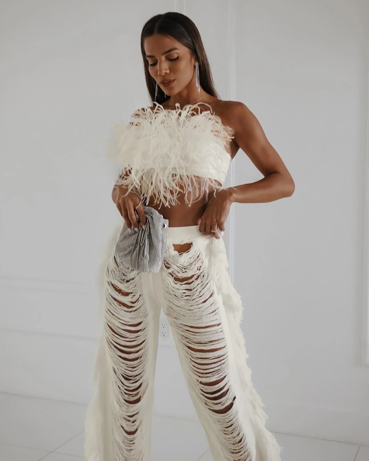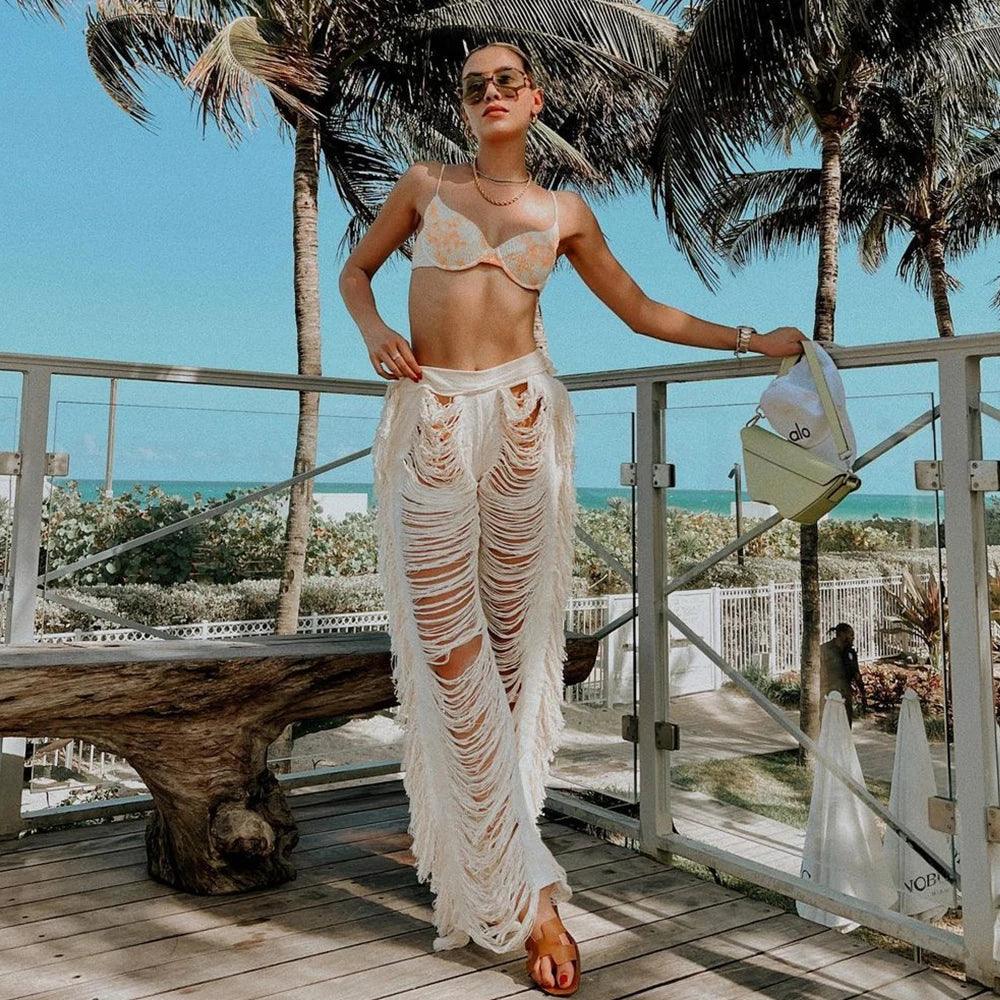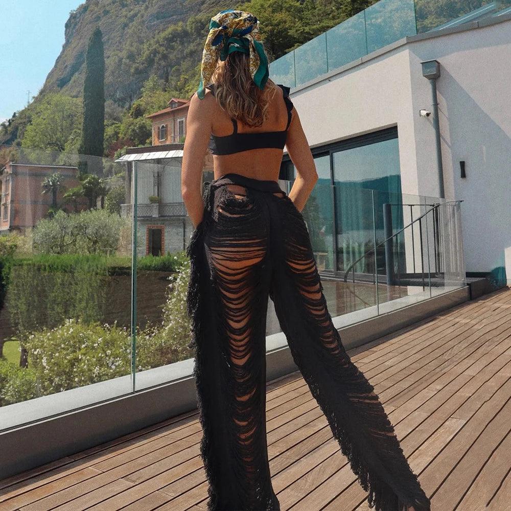 Pantalones de punto desgastados y deshilachados. Pernera recta. Borlas en las costuras laterales. Cintura natural