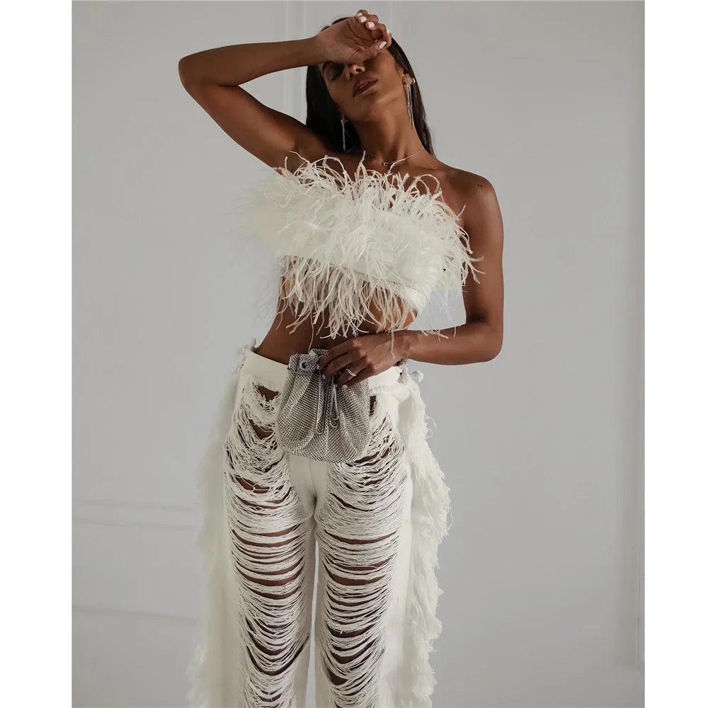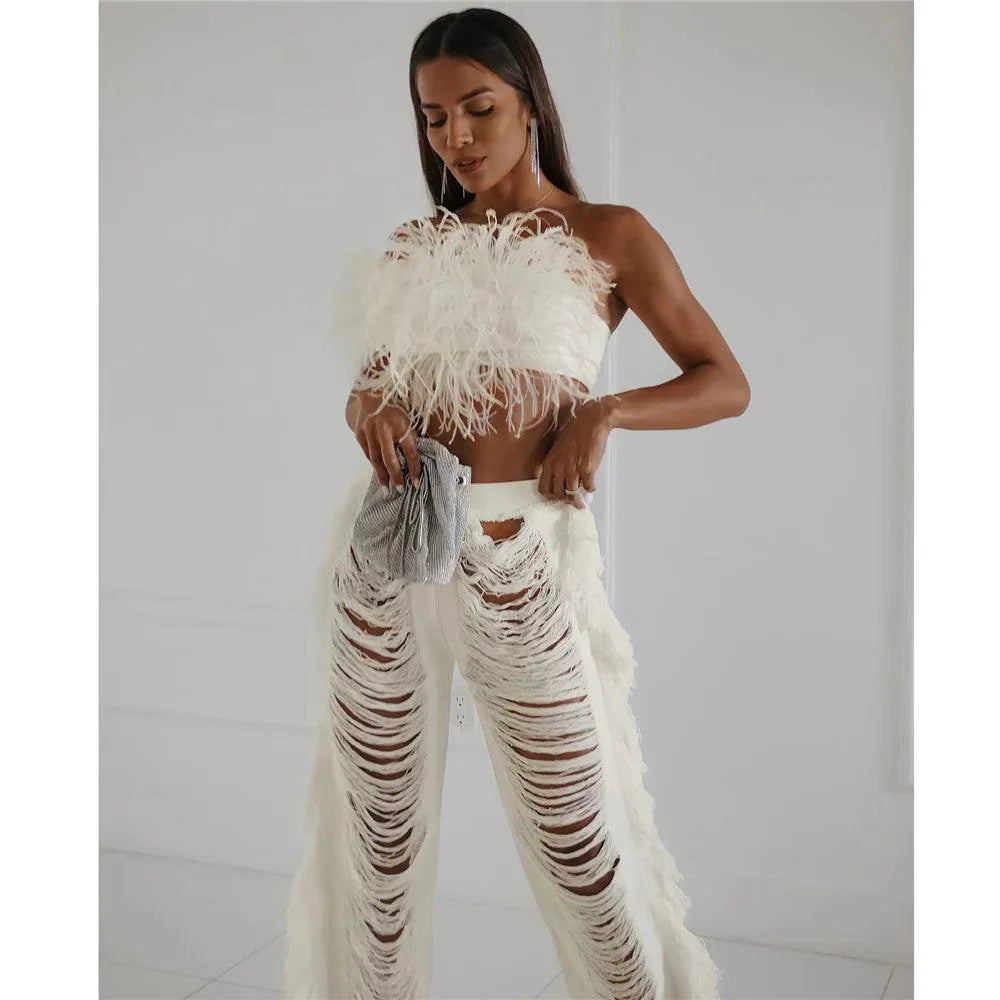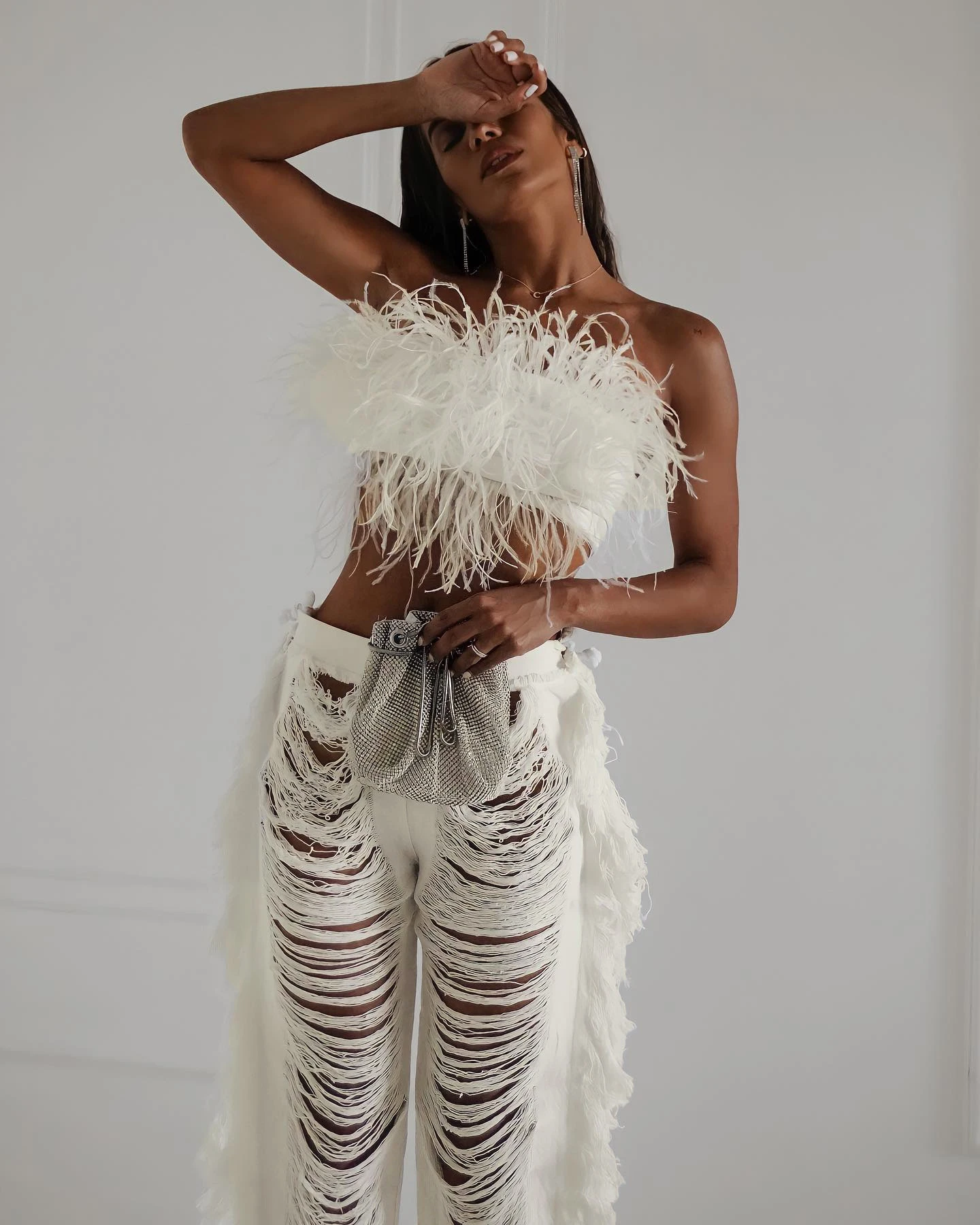 Pantalones de punto desgastados y deshilachados. Pernera recta. Borlas en las costuras laterales. Cintura natural