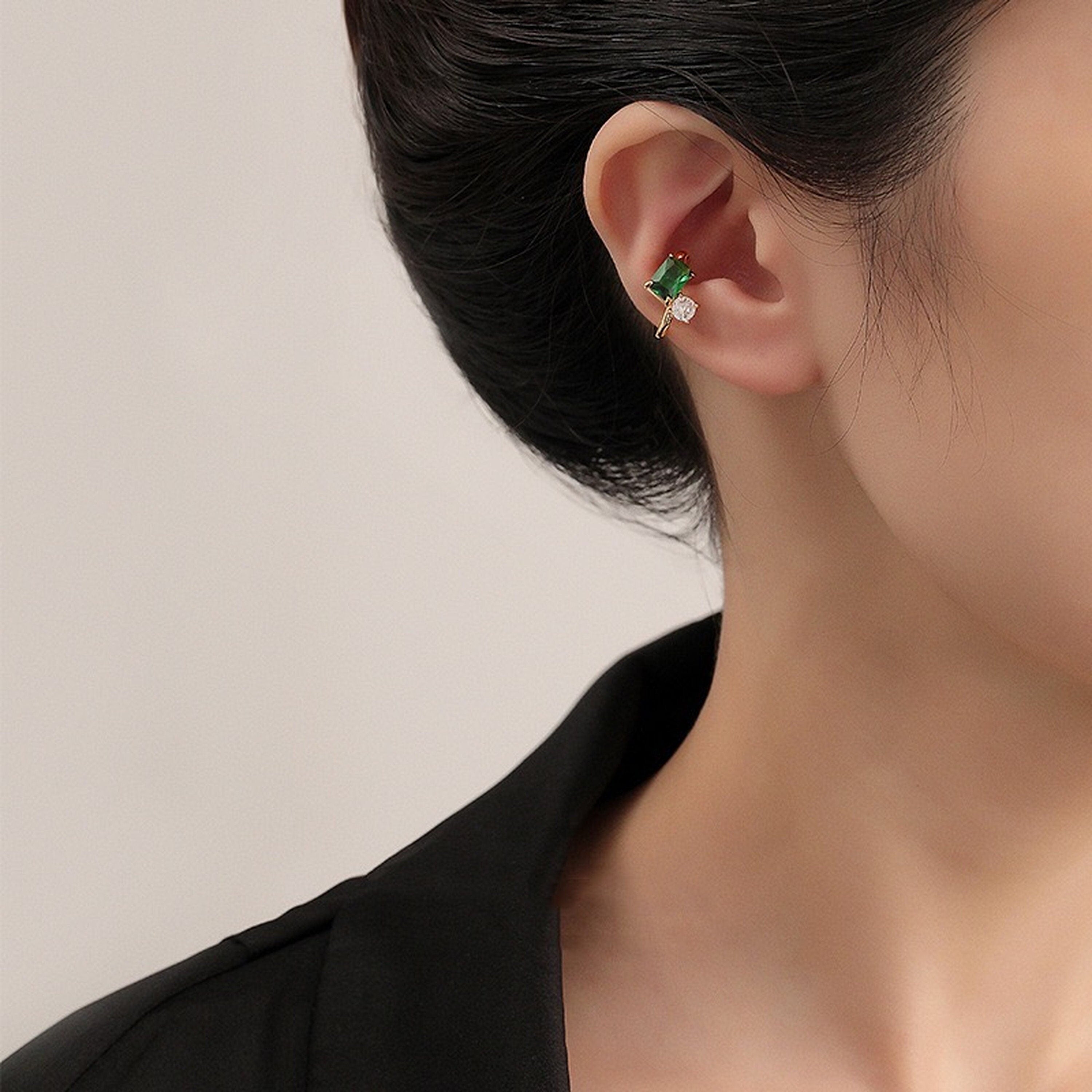 Pendientes trepadores de oreja verde esmeralda brillantes sin perforar. Pequeños y delicados pendientes minimalistas. Clásicos pendientes rectangulares de esmeralda y circonitas de diamante. Exquisitos y elegantes. Diseño de clip sin perforaciones. Súper fáciles de colocar y ajustar a tu gusto. Se venden por 1 pieza. Funcionan para ambas orejas. ¡Se ven lujosos para apilar o usarlos tal como están! Tu joya para las orejas imprescindible para todos los días para elevar tu estilo de moda.