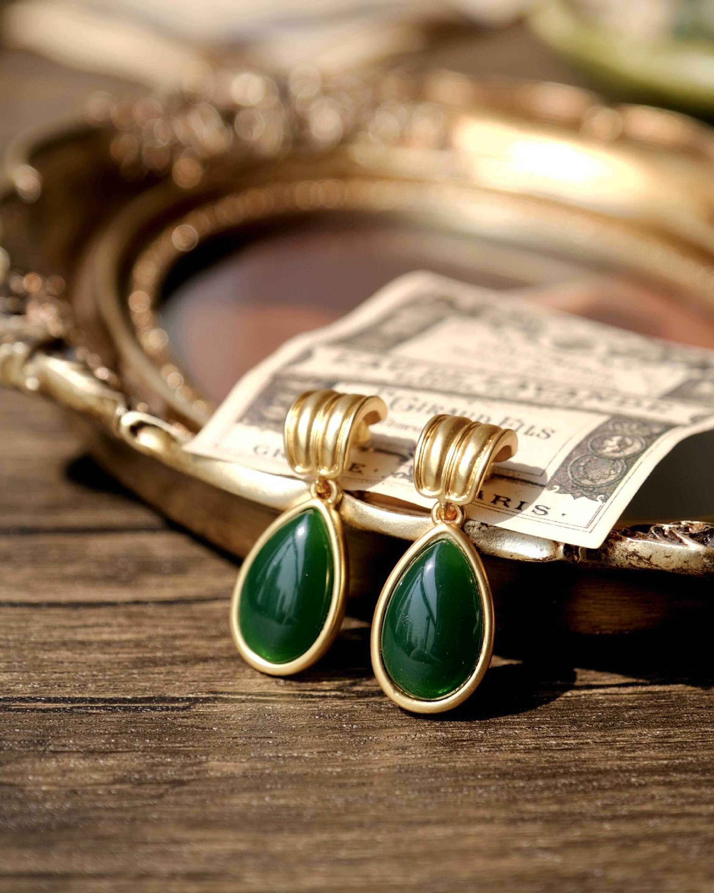Aros colgantes de oro con forma de lágrima de color verde esmeralda de estilo retro vintage. Aros de oro antiguo con una lujosa piedra preciosa verde esmeralda en forma de gota. Elegantes y clásicos. Brillos atemporales para realzar tu estilo. Con un toque de celebridad real de los años 90. Hechos a mano con poste de plata de ley 925. Hipoalergénicos y buenos para pieles sensibles. Diseño original y hermoso de WithHerNYC. ¡Aretes únicos y llamativos para tu colección de joyas!