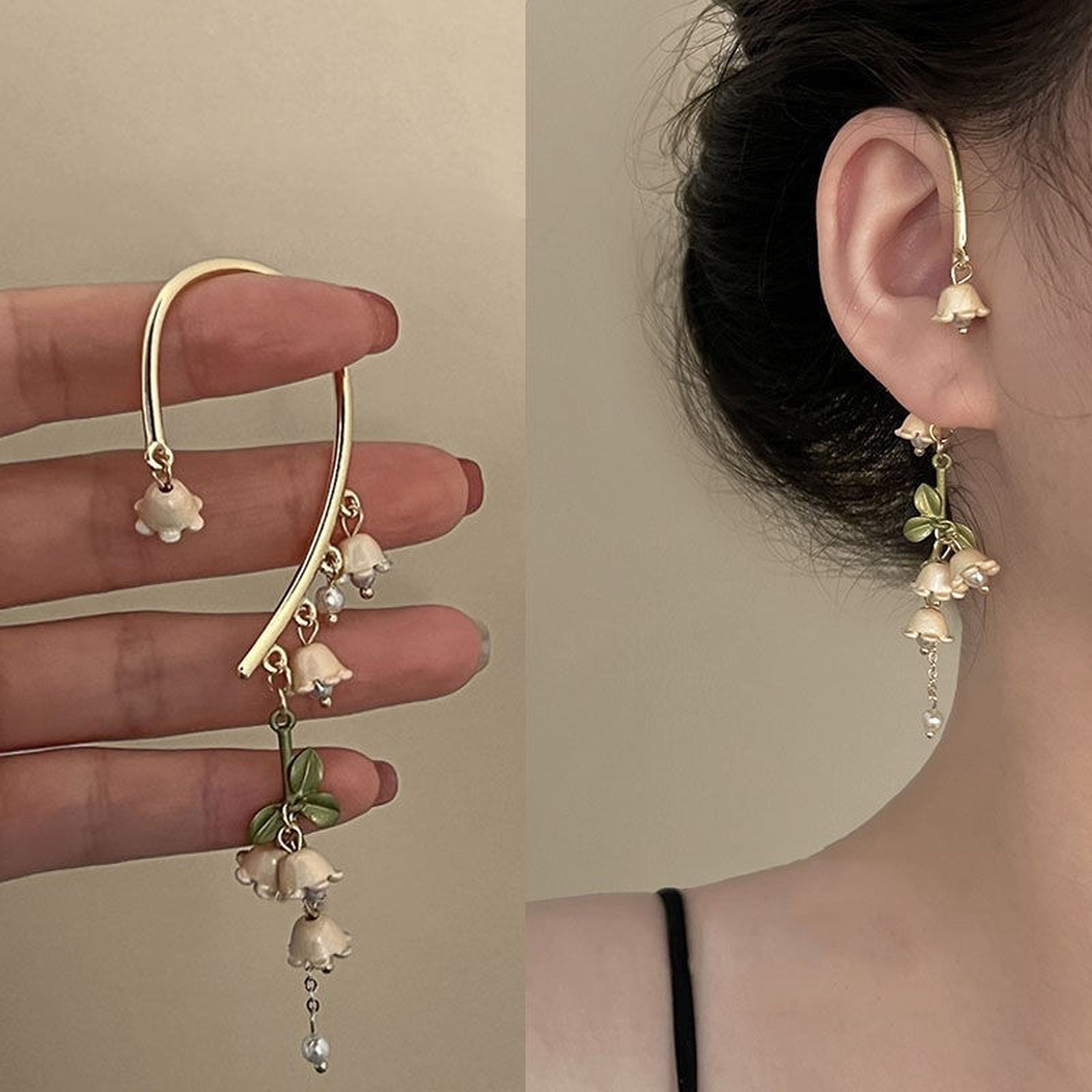 Pendientes colgantes con borlas y flores en forma de ramo de hadas románticos. Pendientes tipo puño. Pendientes sin perforación. Capullos de flores de lirio bohemios y racimo de hojas. Colgantes elegantes con vibraciones femeninas. Pendientes de oro sin perforación. Súper fáciles de colocar en la silueta de tu oreja. No se necesita necesariamente un orificio para la oreja. Funcionan para ambas orejas. Pendientes con un estilo muy único para mostrar tu actitud de moda. Se venden por 1 pieza.