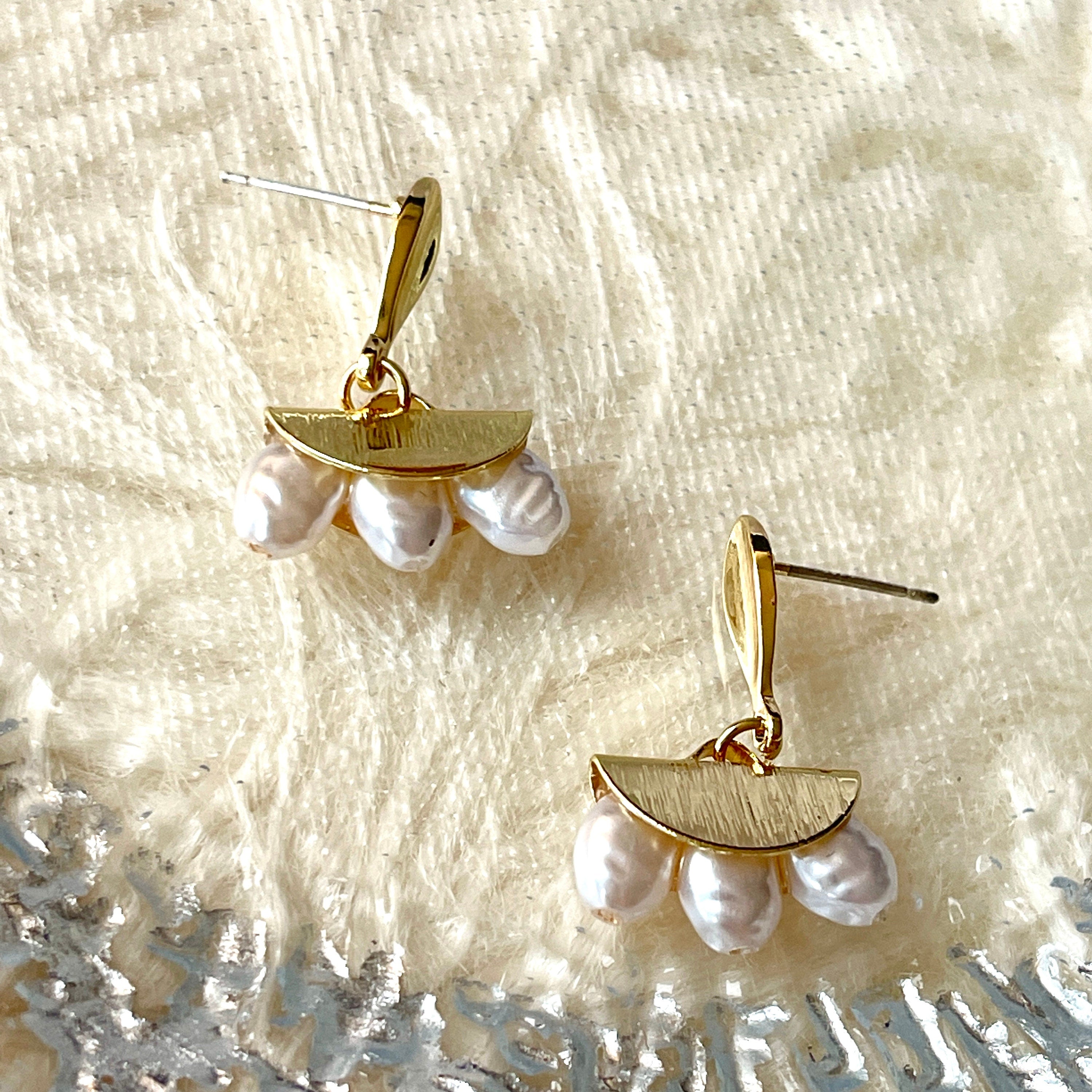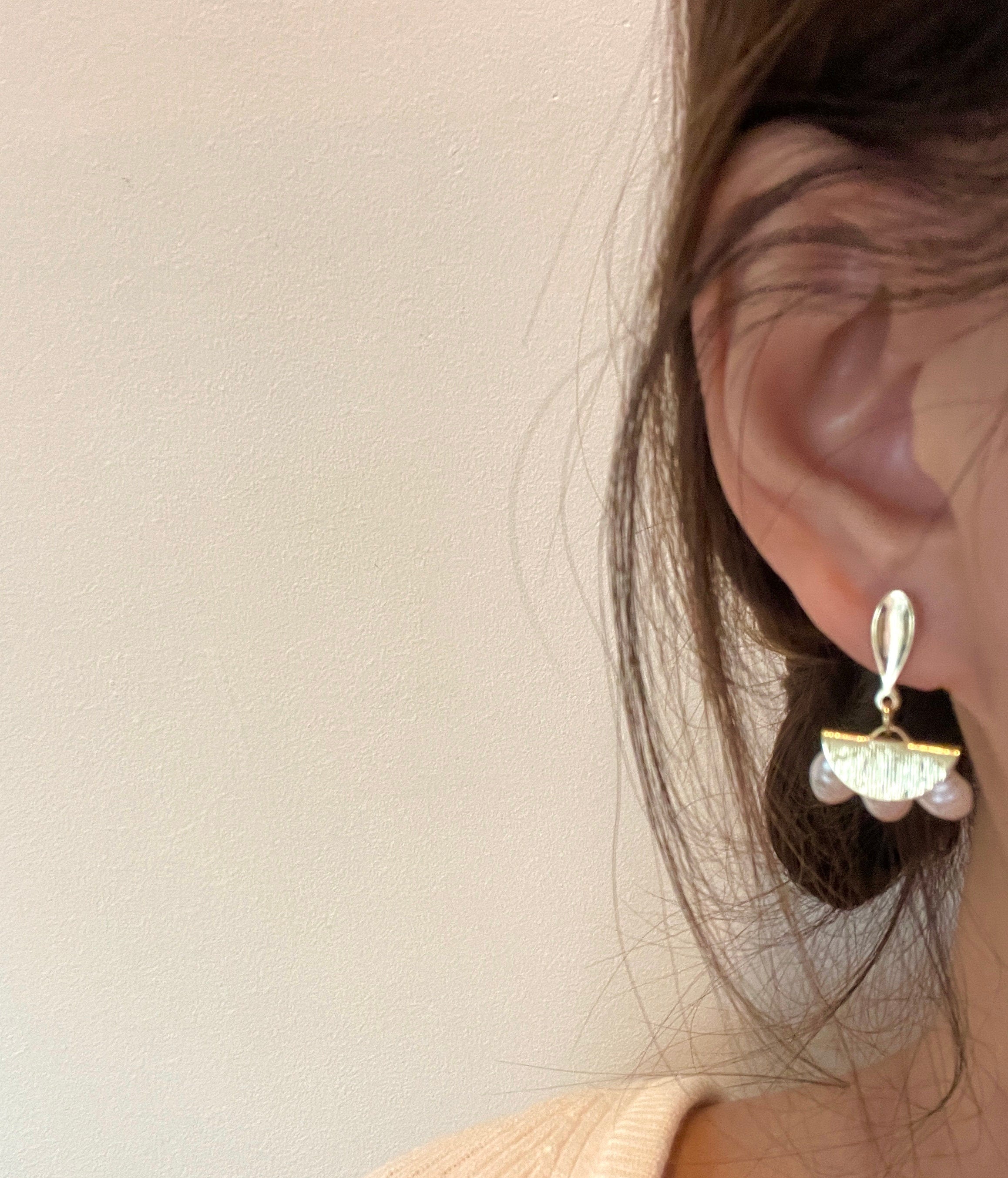 Pendientes colgantes con forma de abanico de perlas con forma geométrica. Estilo bohemio moderno. Delicado art déco hecho a mano. Tres perlas agrupadas en plata de ley bañada en oro de 14 k. ¡Te da una elegancia delicada y chic! Perfectos para el look diario. También lucen hermosos como regalo.