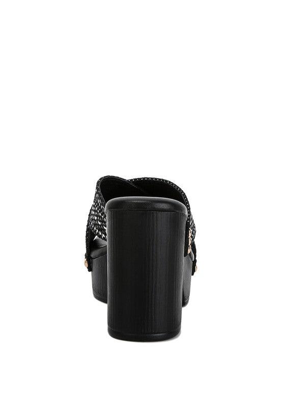 ¡Perfectas para tu próxima escapada a la isla! Las mules de tacón alto son sublimes y tienen un toque bohemio con el empeine de rafia con estampado cruzado. Los tacones altos añaden un poco de estilo al diseño, mientras que los adornos de tachuelas realzan la estética general.