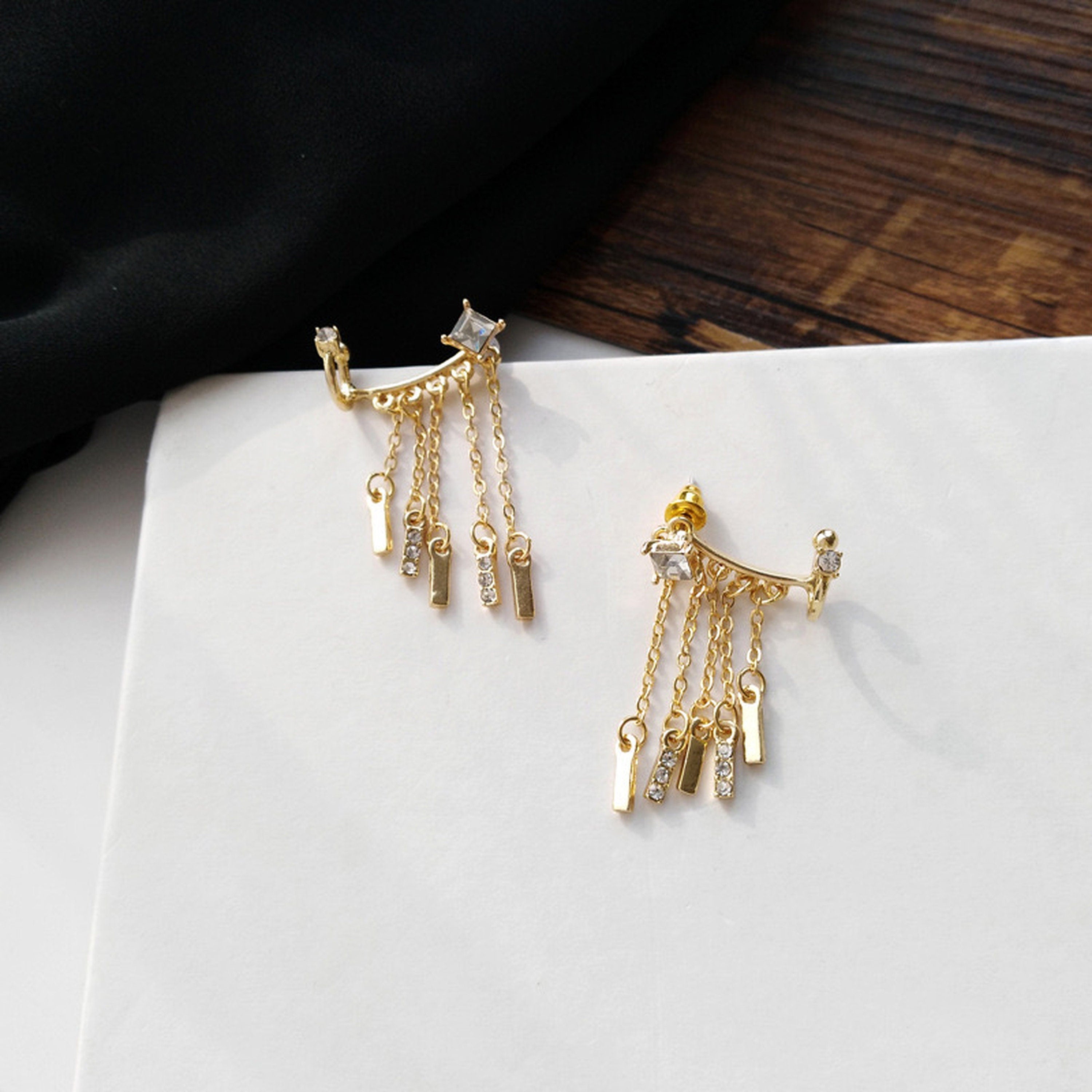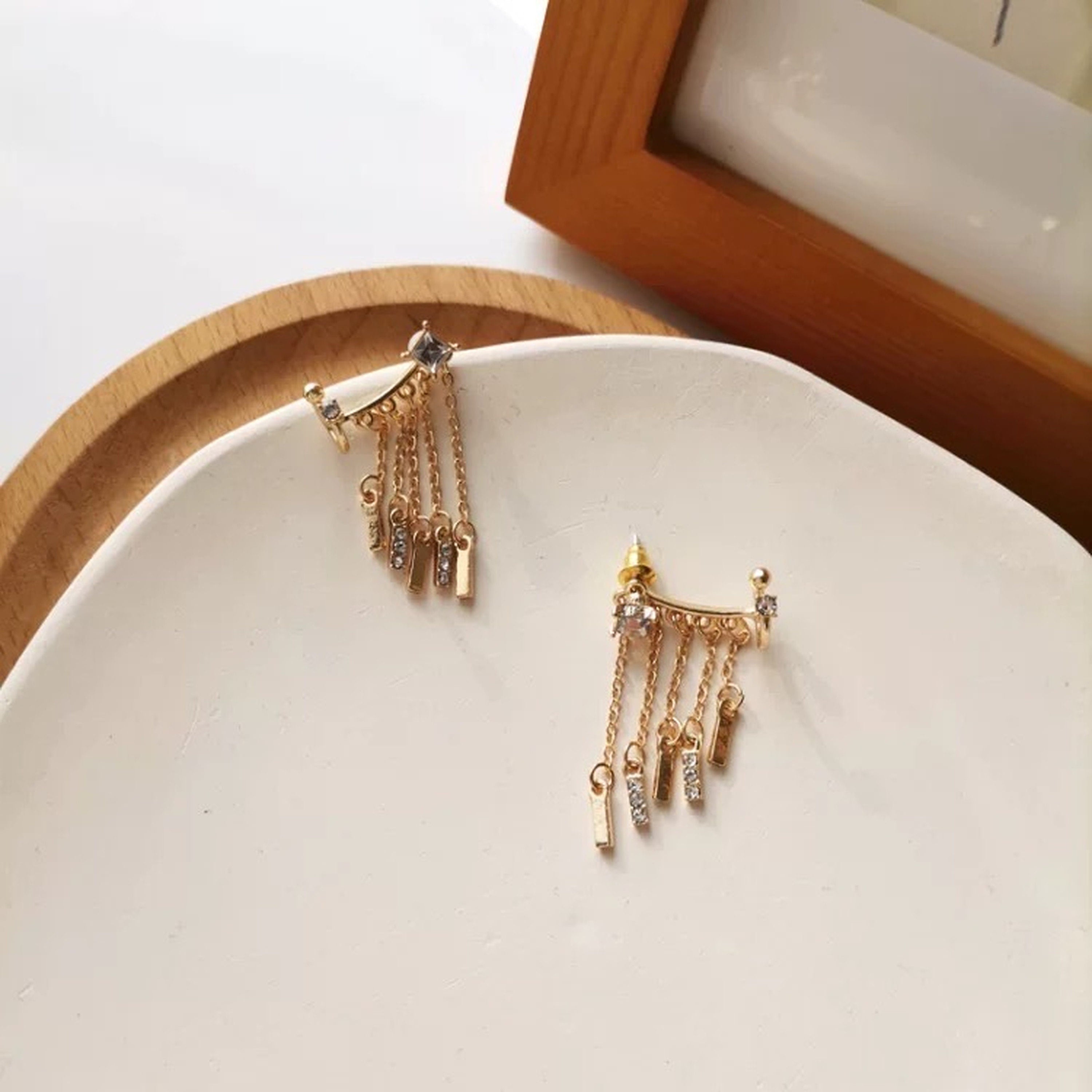 Pendientes tipo cuff con borlas y flecos dorados colgantes. Pendientes tipo trepador. Pendientes tipo trepador. Delicados diamantes de imitación y circonitas cúbicas incrustados en los flecos. Se ven brillantes y lindos. Diseño único con un toque bohemio hippie. Perfectos para atuendos diarios o cualquier ocasión. Se venden por pares.