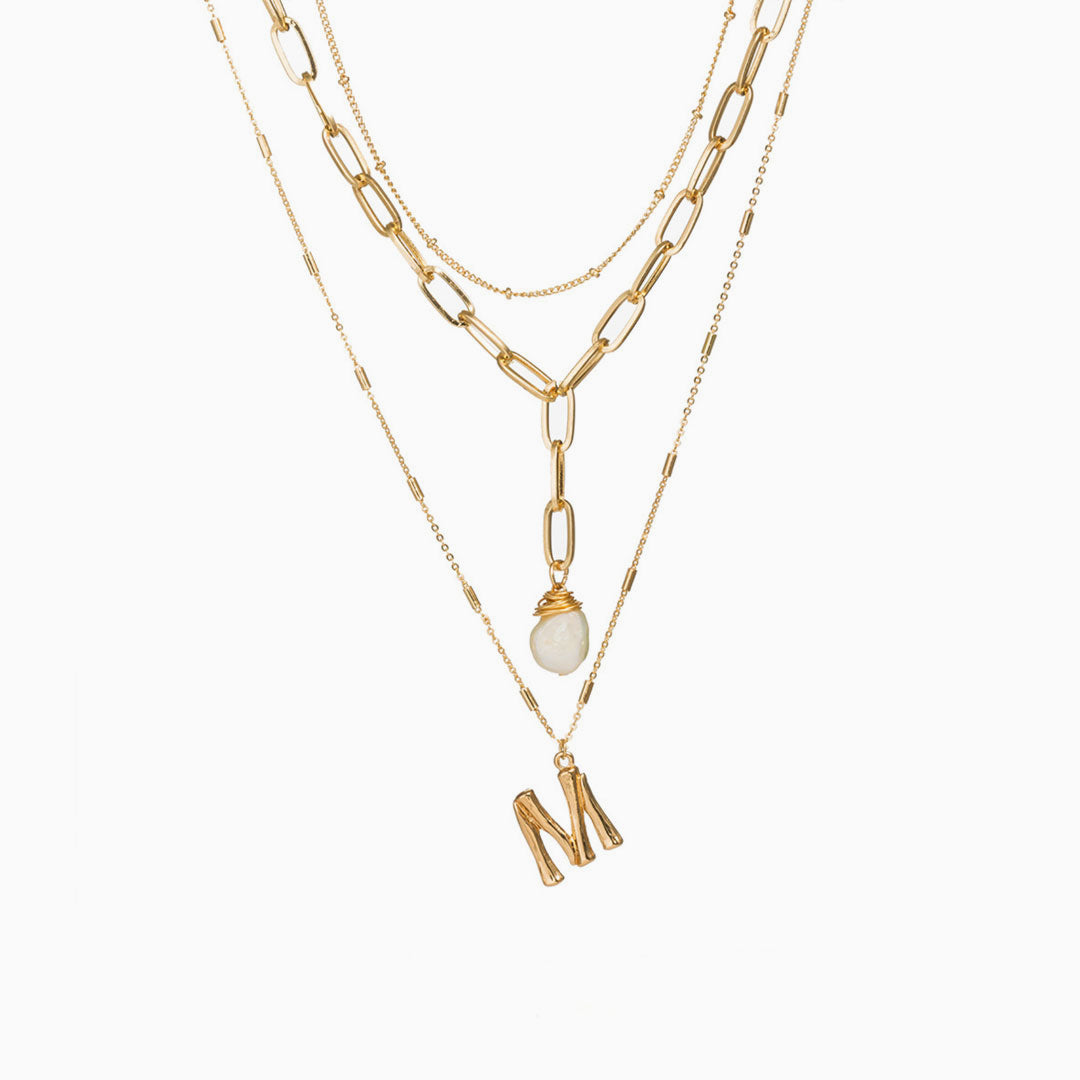 Este collar en capas es una incorporación destacada a su joyero. Elaborado con aleación bañada en oro. Cuenta con cuentas de estilo barroco y dijes con la letra M. Cuenta con una cadena de tres vueltas con un ajuste ajustable y está terminado con un cierre de reasa. Encuentre más collares de mujer de moda y accesorios únicos en nuestra boutique. Combínelos con otras cadenas de oro para lograr un estilo vintage.