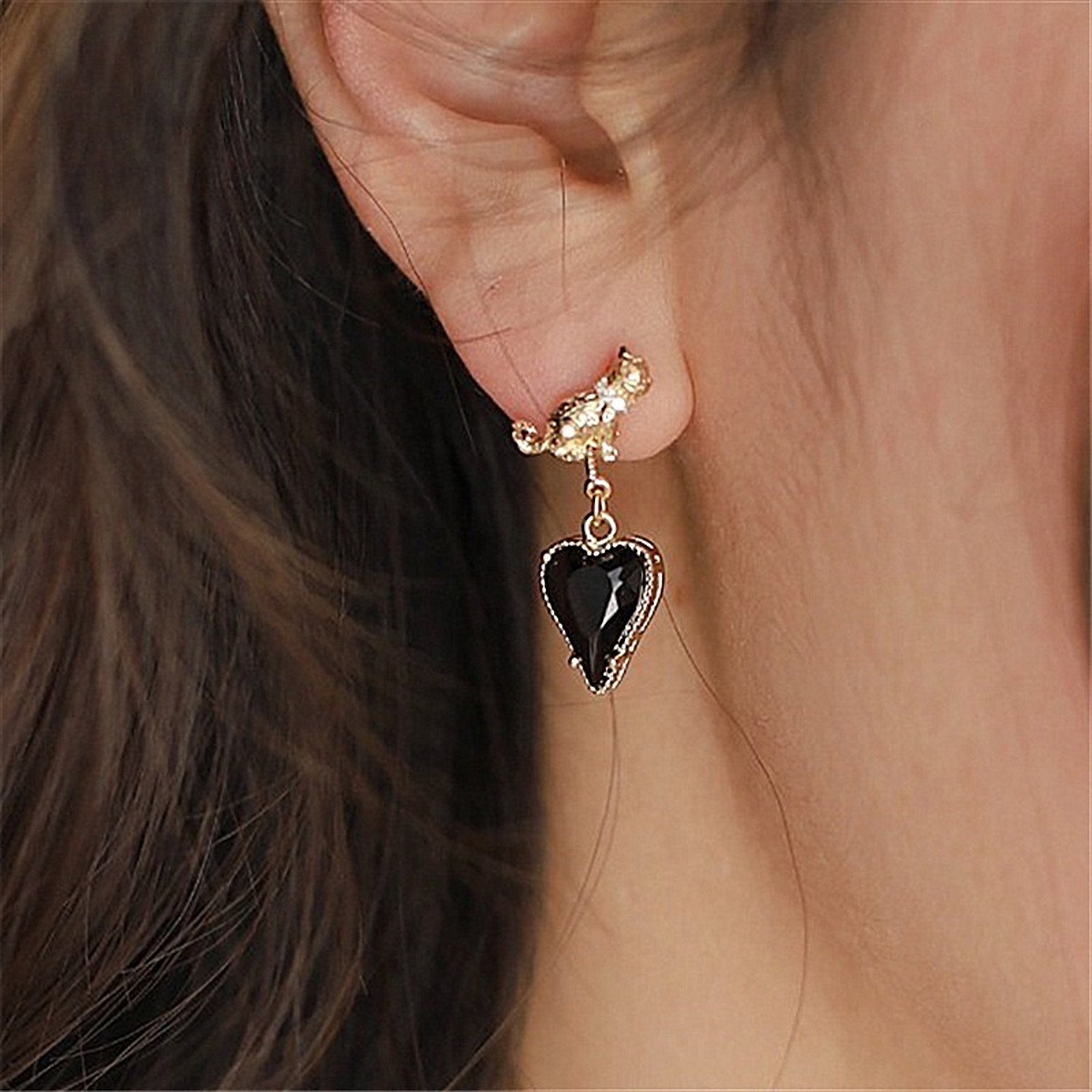 Exquisitos pendientes colgantes de gato dorado con corazón negro. Adorables pendientes con forma de gatito en 3D. Piedra preciosa gótica en forma de corazón de ónix negro. ¡Súper únicos y delicados! Hechos a mano con poste de plata de ley 925. Apto para pieles sensibles.