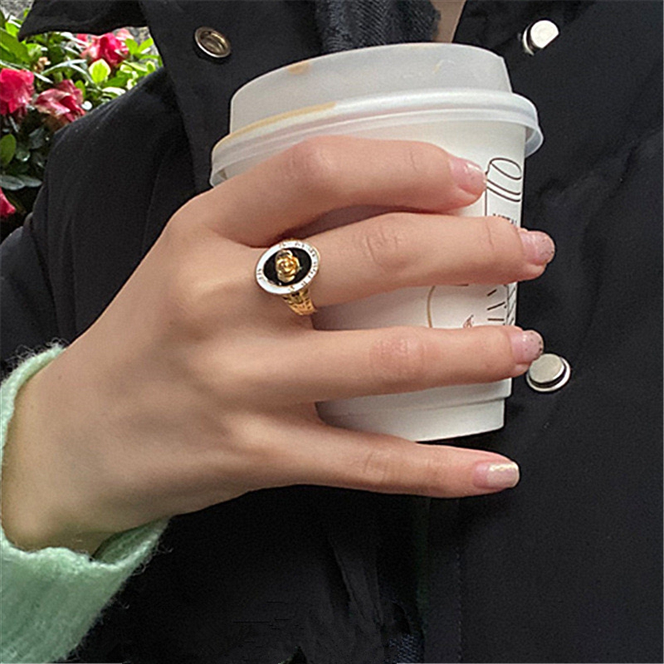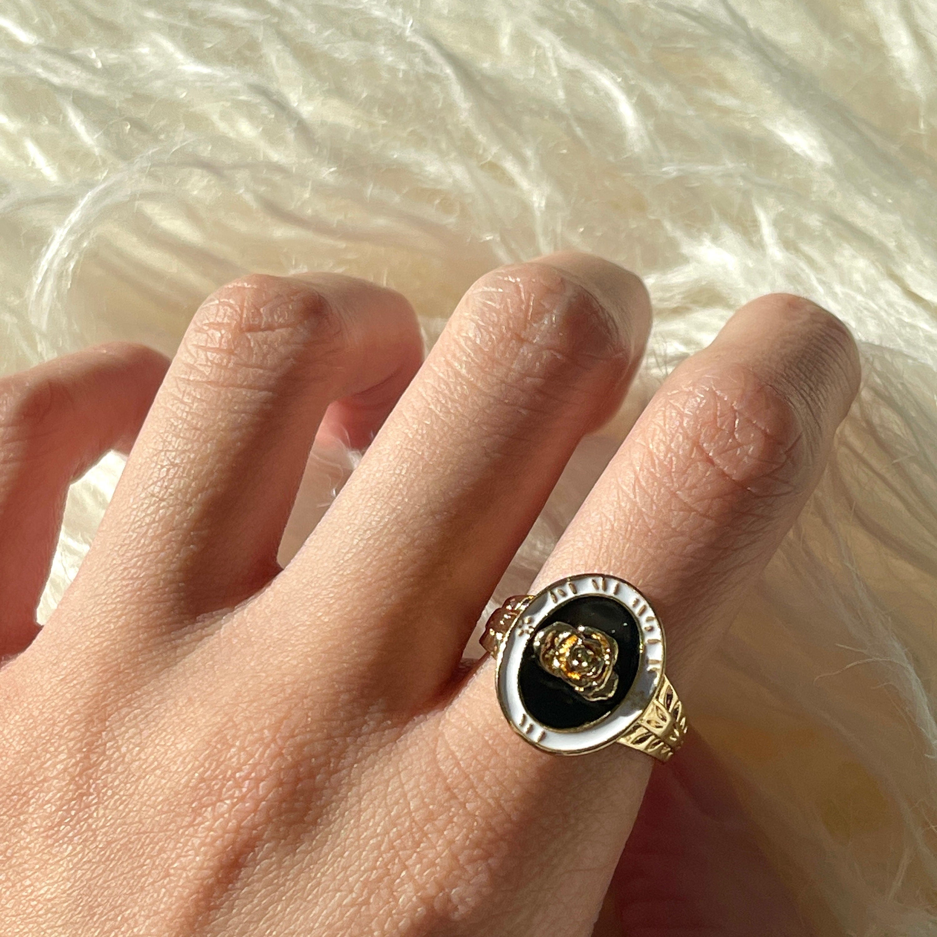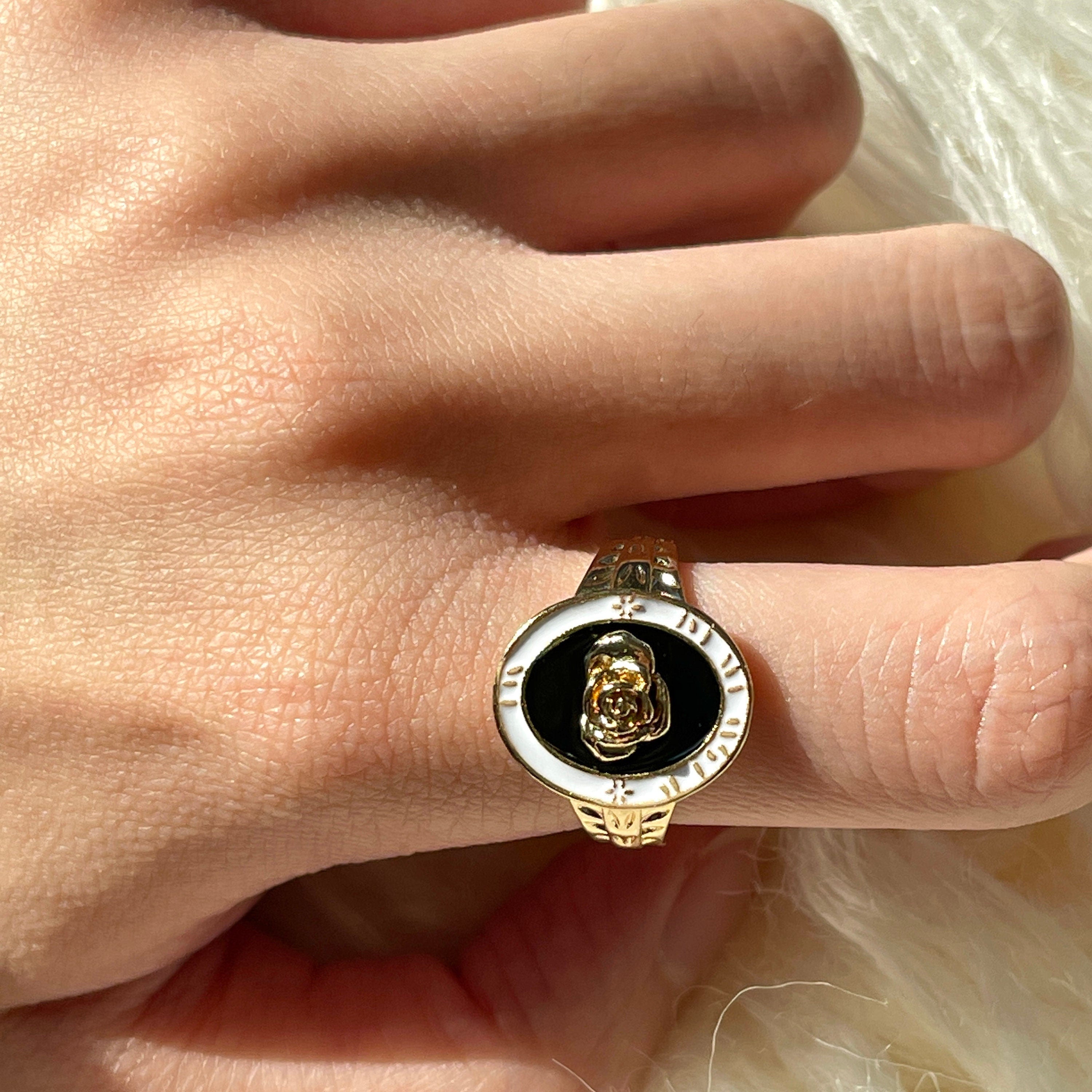 Anillo único en su tipo, con sello ovalado en blanco y negro, banda de oro con forma de vid, con flor de rosa y números romanos grabados. Anillo superúnico con vibraciones góticas vintage, hermoso y delicado en los detalles. Anillo de energía de la suerte. Fácil de usar y apilar. La banda es ajustable y abierta.