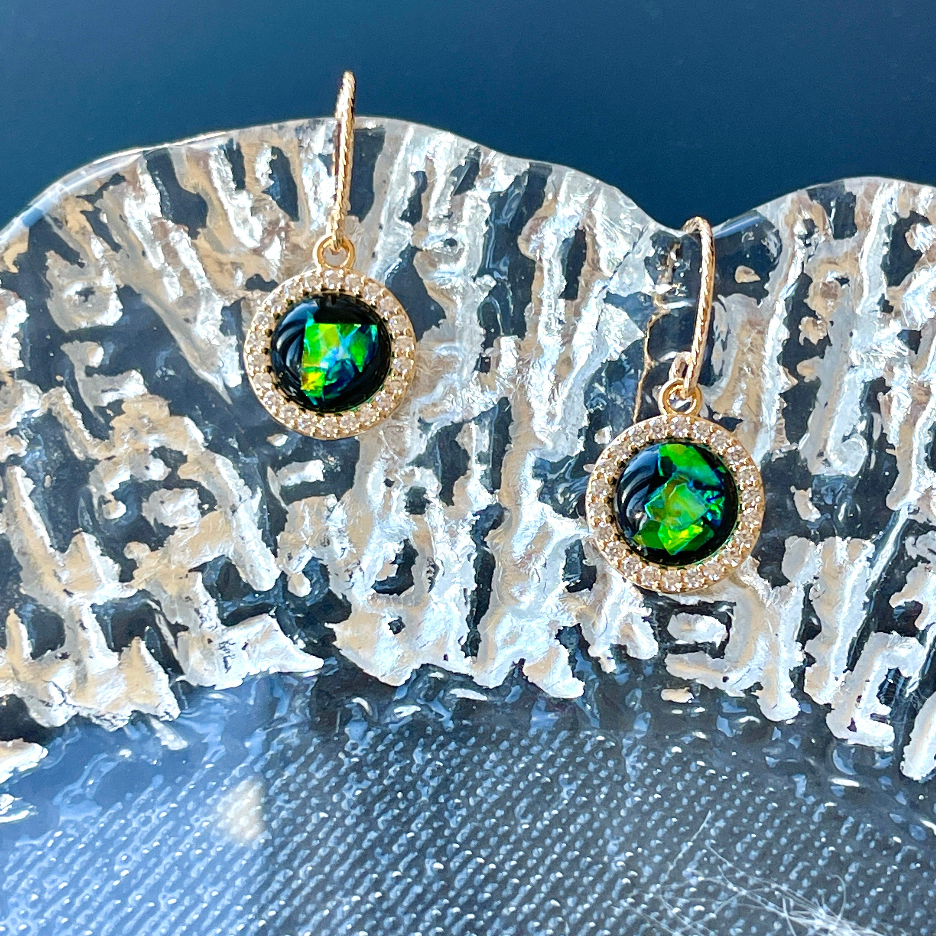 Pendientes colgantes de alambre con ópalo de fuego verde esmeralda de gran calidad. Acabado chapado en oro de 14 quilates de alta calidad con diamantes de circonita cúbica rodeados. El hermoso ópalo verde tiene un tono iridiscente de aurora boreal y cambia de color con la luz. Impresionante artesanía delicada. Brilla intensamente con diferentes luces. El verde esmeralda le da un aire vintage y lujoso. ¡Una verdadera obra de arte!