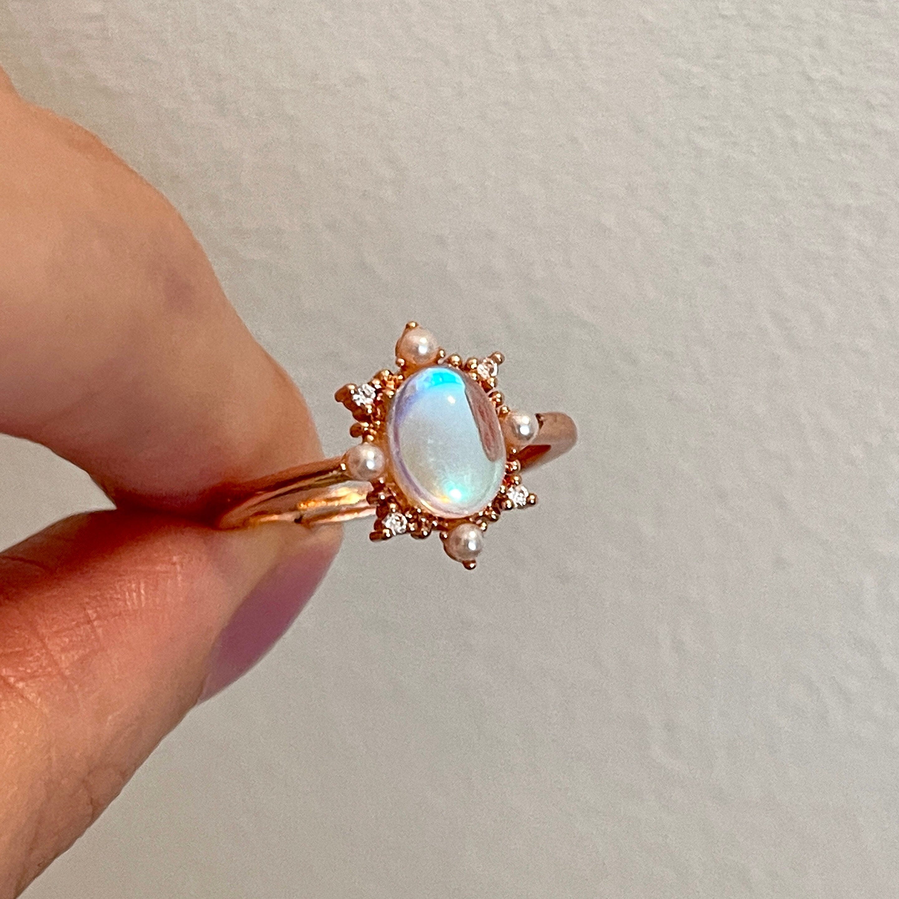 El delicado tono ruborizado de la banda de oro rosa complementa a la perfección los tonos iridiscentes de la piedra lunar y el suave brillo de las perlas, creando un look armonioso y romántico. Este anillo es perfecto para agregar un toque de glamour a cualquier atuendo, ya sea para un evento formal o para una salida informal.
