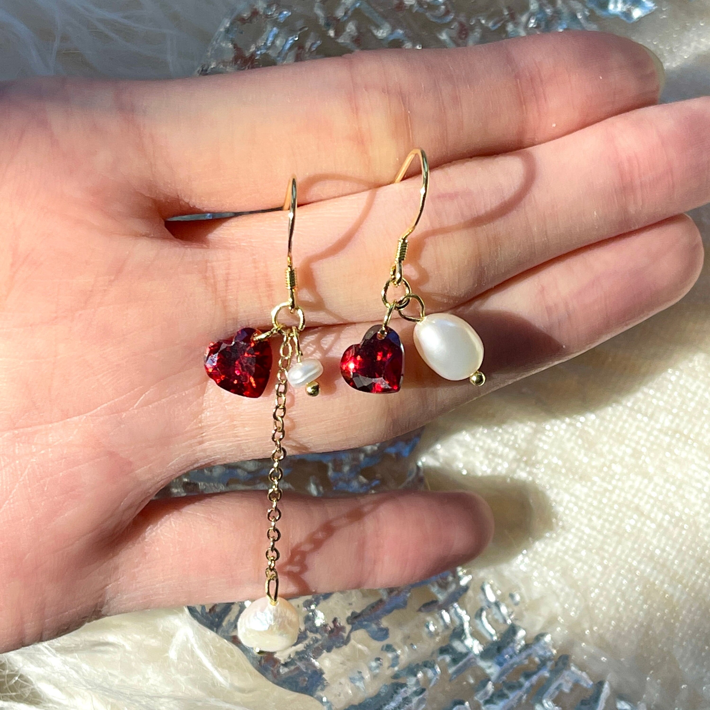 Delicados pendientes de corazón de rubí rojo en plata de ley bañada en oro de 14 quilates. Con perlas de agua dulce desparejadas. Impresionante dije de piedra preciosa de corazón rojo estilo amor. Súper lindo y delicado. Las perlas colgantes asimétricas le dan un toque de romance moderno y elegante. Delicados pendientes minimalistas. Lucen lujosos y hermosos. ¡Sé el ángel más dulce fácilmente!
