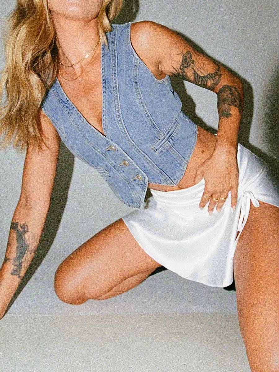 Chaleco vaquero con cuello en V, sin mangas, con botones y estilo Y2K de los años 90