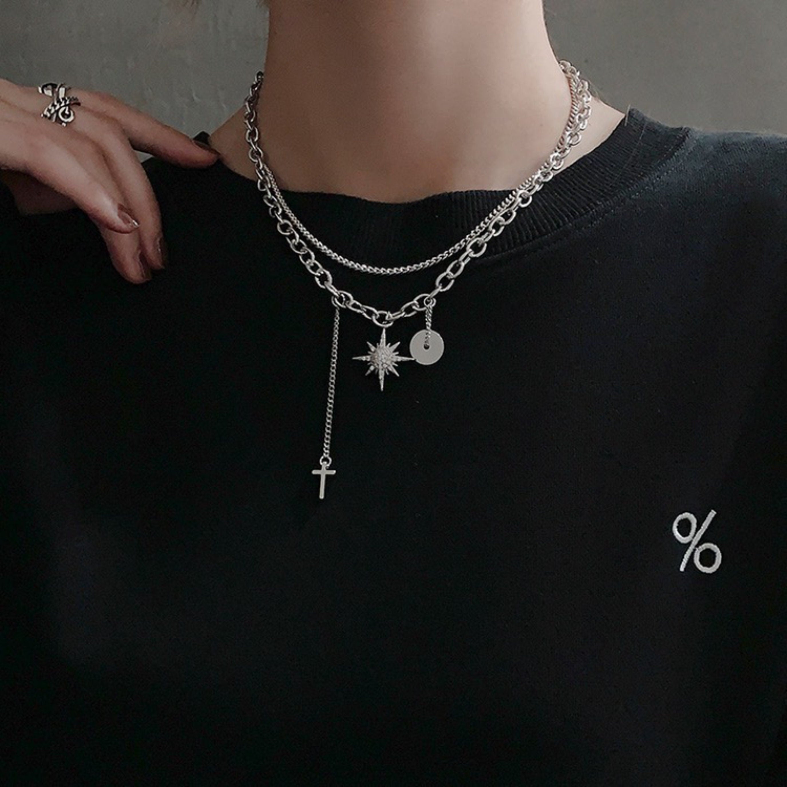 ¡Estilo gótico punk unisex oscuro para elevar tu estilo! Gargantilla de cadena de plata de doble capa con dije de estrella del norte de cristal, colgante de cruz y dije de anillo de donut de plata. Muy elegante y con estilo para hombres y mujeres. Un collar elegante y llamativo para mostrar tu gusto vanguardista único.