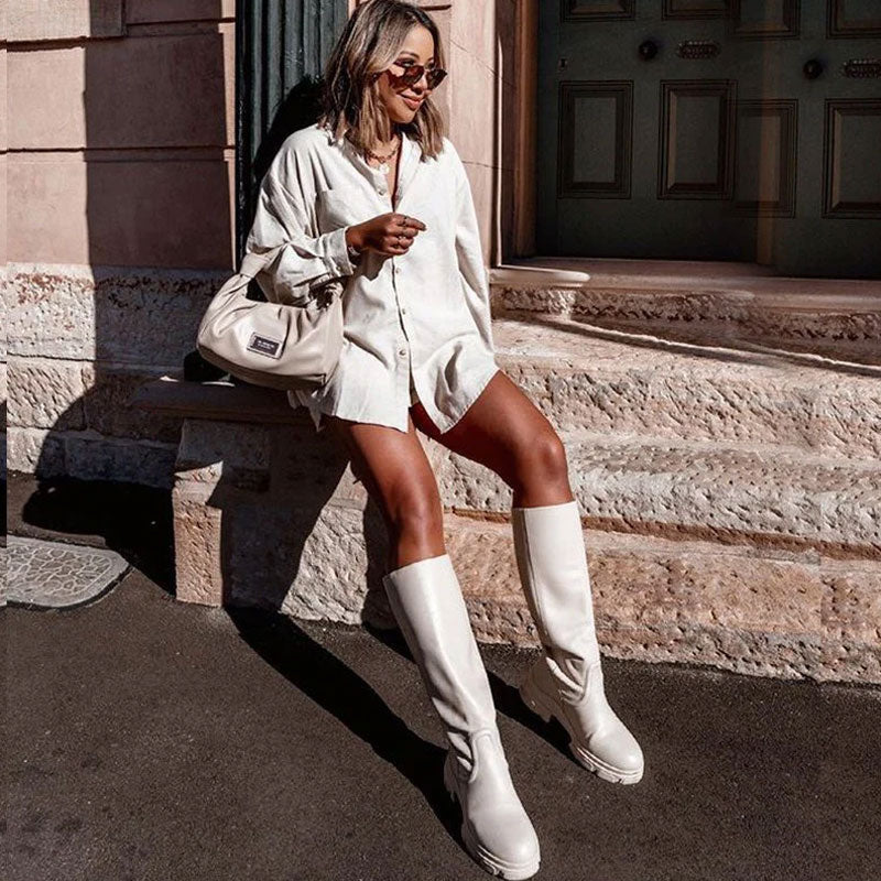 Botas altas hasta la rodilla con plataforma gruesa y ribete en la puntera - Beige