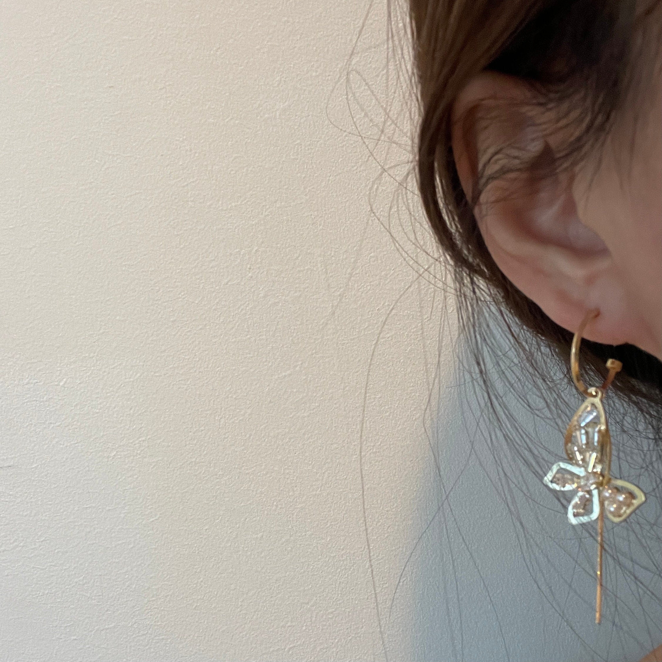 Pendientes colgantes con temática de mariposas desiguales. Delicado encaje bañado en oro. Perla de circonita cúbica bordada. Aros tipo aro. Estilo romántico de hada. Pendientes llamativos que te convierten en la estrella más brillante entre los demás. Hermosos para fiestas, ocasiones y looks cotidianos. Regalos de joyería perfectos para ella. Hechos a mano en plata de ley bañada en oro. Hipoalergénicos. Buenos para pieles sensibles.