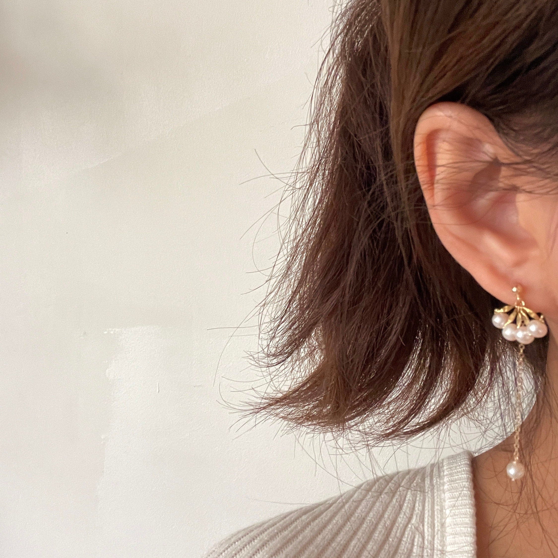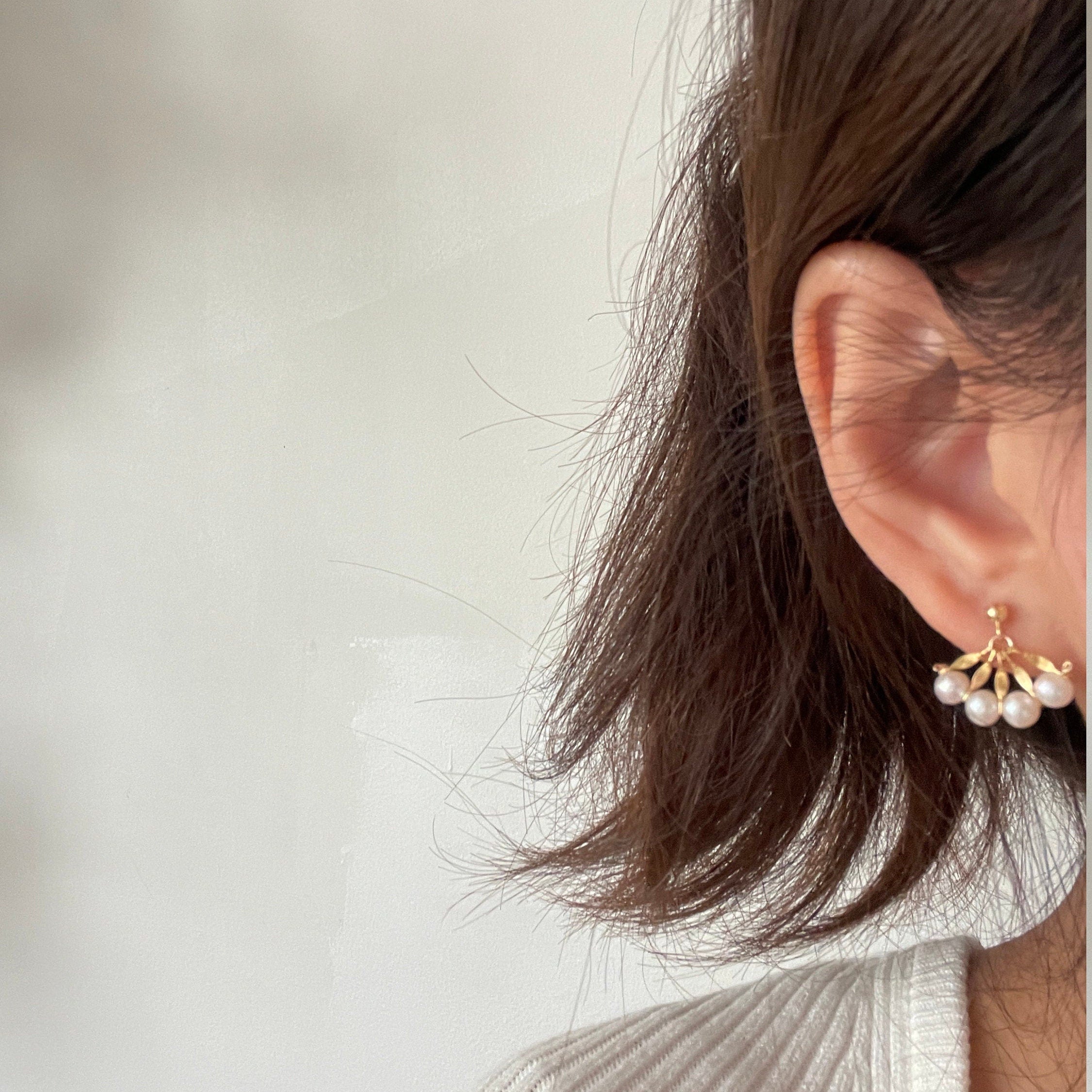 Pendientes colgantes en forma de abanico, absolutamente exquisitos, delicados y desiguales, hechos a mano. Revestidos en oro de 14 quilates con perlas naturales de la mejor calidad. Un lado con una hermosa perla femenina que cuelga elegantemente. Súper clásicos pero únicos.