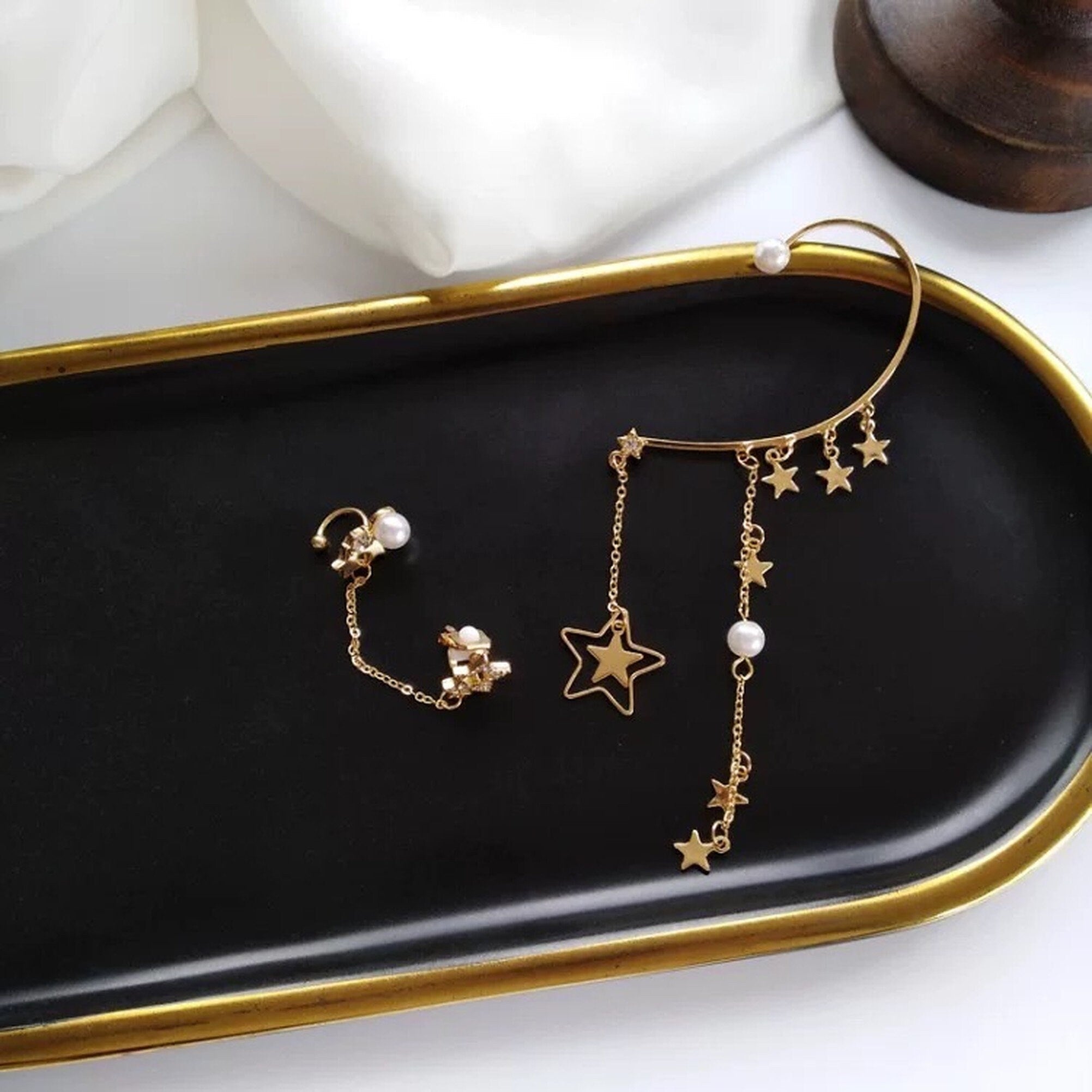 Delicados pendientes de oreja desiguales, sin perforaciones, hechos a mano, con forma de puño, trepador de orejas, trepador de orejas. Se venden por pares. Un lado tiene una envoltura de oreja con estrellas y perlas colgantes. El otro lado tiene un puño de oreja con cúmulo de estrellas de circonitas cúbicas. No necesita orificio para la oreja. Fáciles de ajustar y combinar según tus preferencias personales. Súper prácticos. Plata esterlina bañada en oro. Pendientes brillantes, delicados y delicados. Perfectos como joyería para el día a día. ¡También lucen hermosos como accesorios para fiestas, novias, damas de honor o bodas!