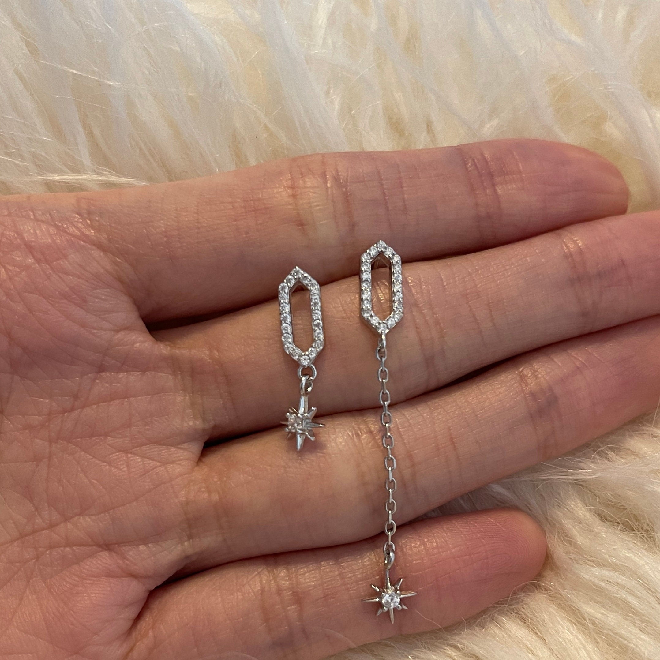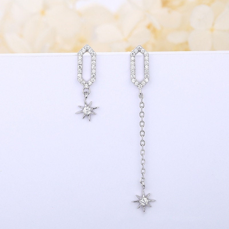 Delicados pendientes colgantes de cadena celestial con forma de estrella desparejada. Delicados dijes de estrella del norte y hexágono pavimentados con diamantes creados en laboratorio. Cadena colgante de 1" brillante. ¡El estilo minimalista más lindo para combinar y mezclar! Idea de regalo perfecta para ella. Ideal para fiestas. Accesorios de dama de honor nupcial y estilo diario. Hecho a mano en plata de ley 925. Hipoalergénico y bueno para pieles sensibles.