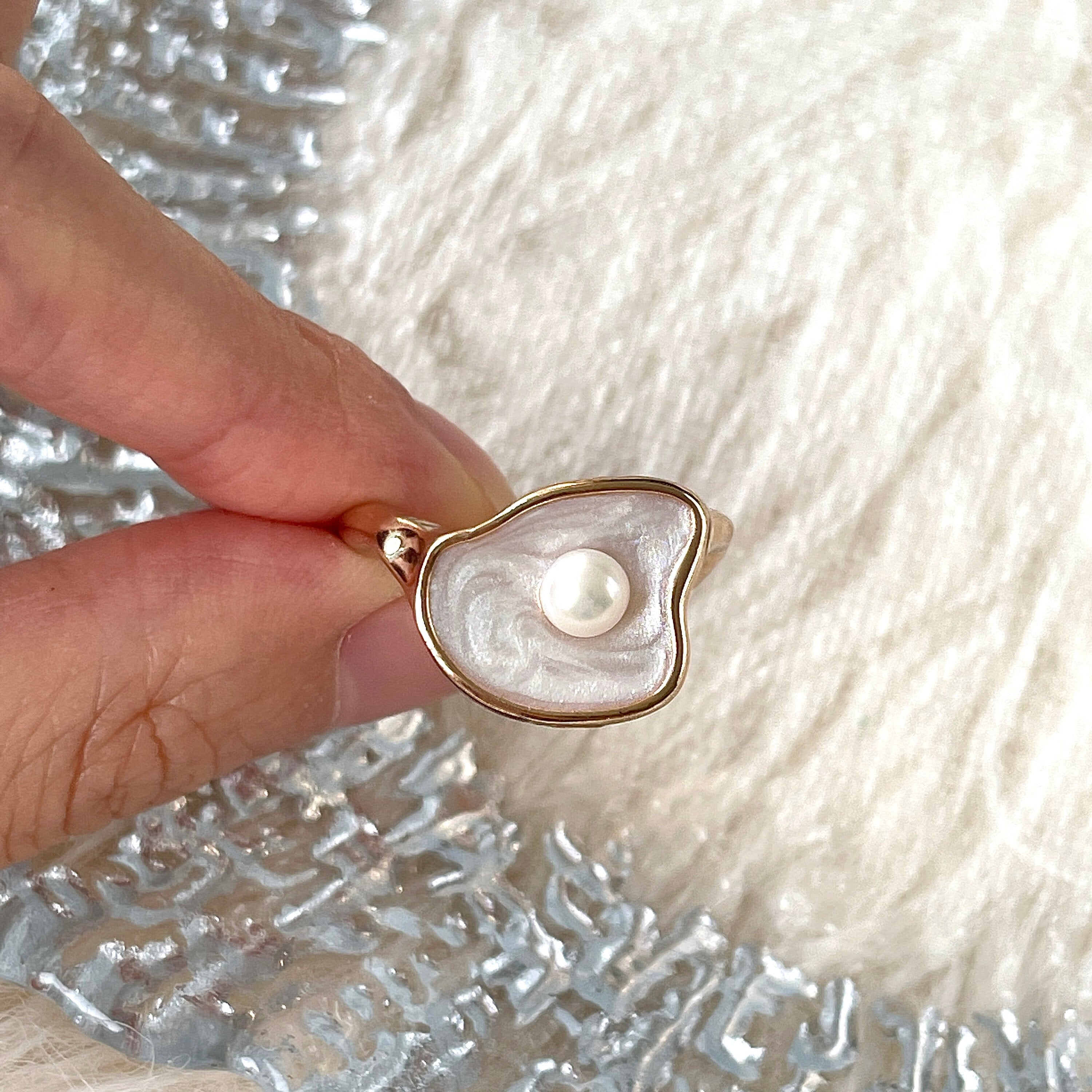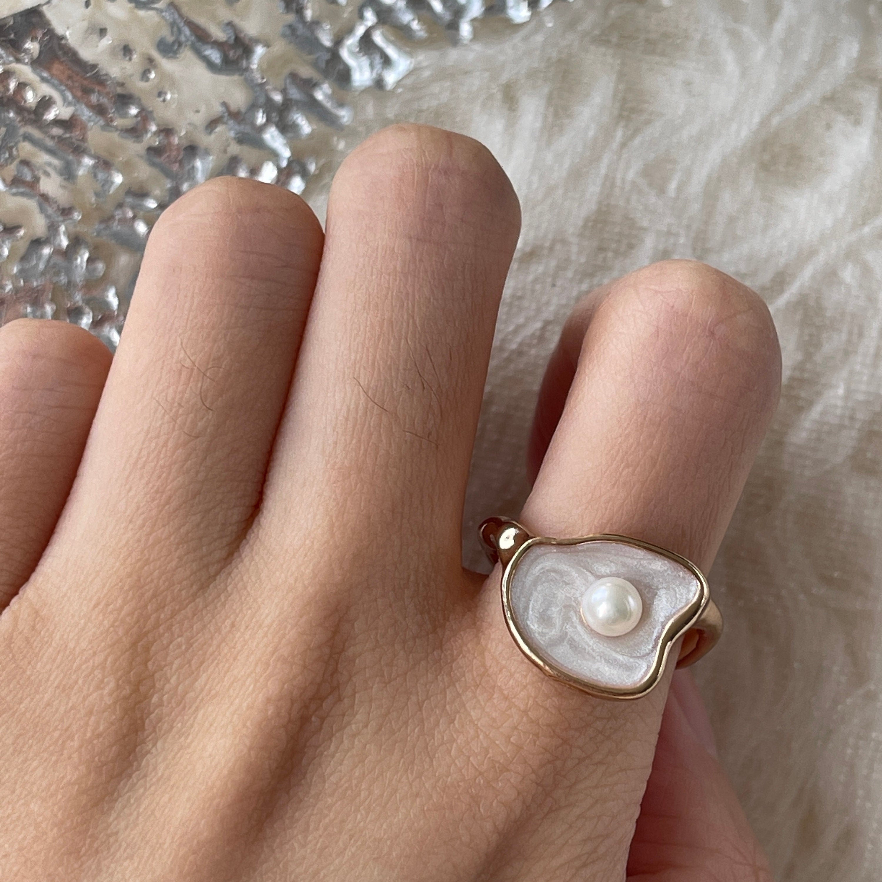 Impresionante anillo de cóctel con diseño de concha y perla de agua dulce natural auténtica. Anillo ajustable abierto. Sello de concha blanca con perla natural engastada en el centro. Acabado chapado en oro rosa de 14 k. Súper único y creativo. Realza tu estilo delicado. Fácil de apilar. Regalo perfecto para darte un capricho a ti y a tus amigos/familia. ¡Seguro que recibirás muchos cumplidos!