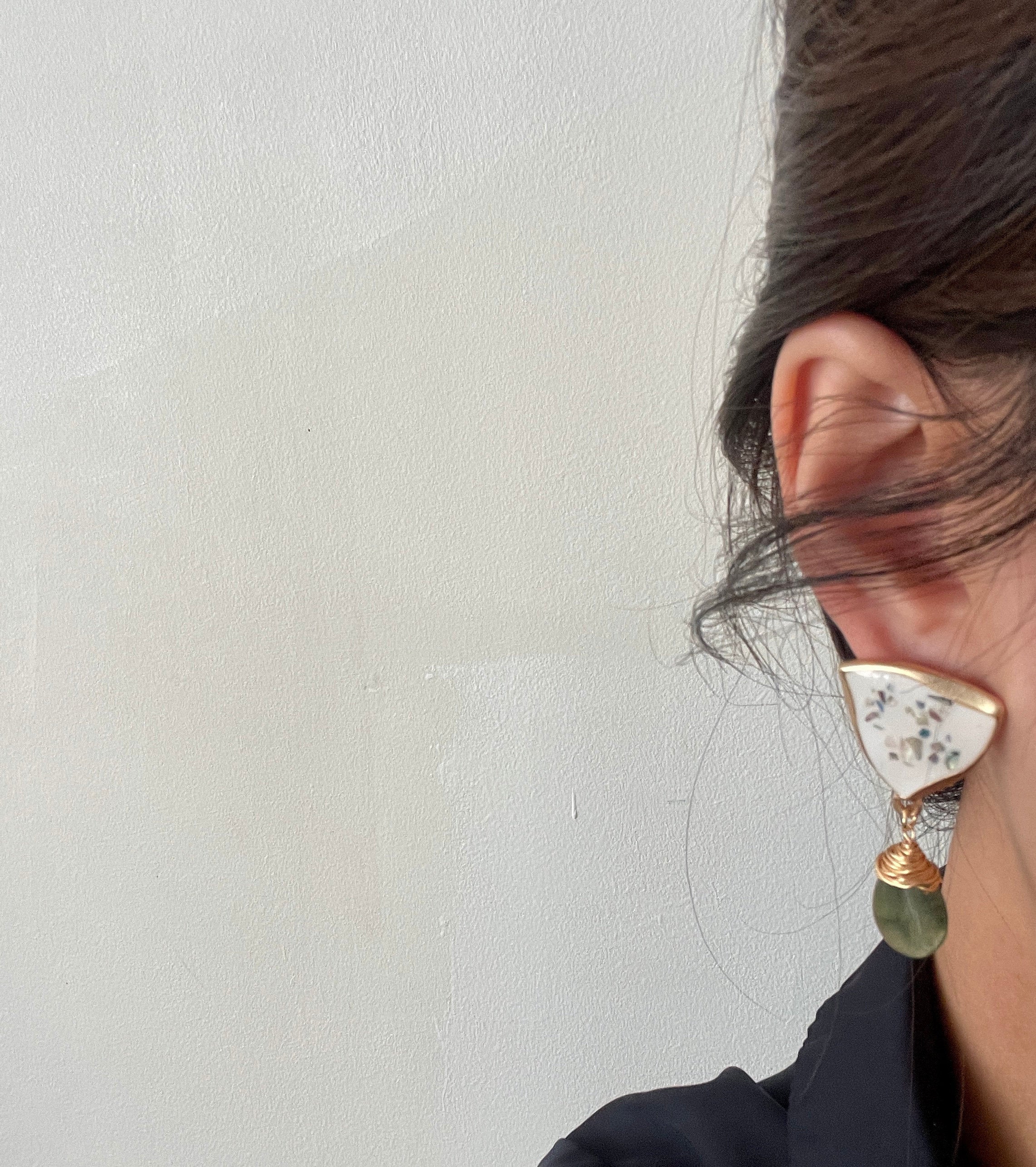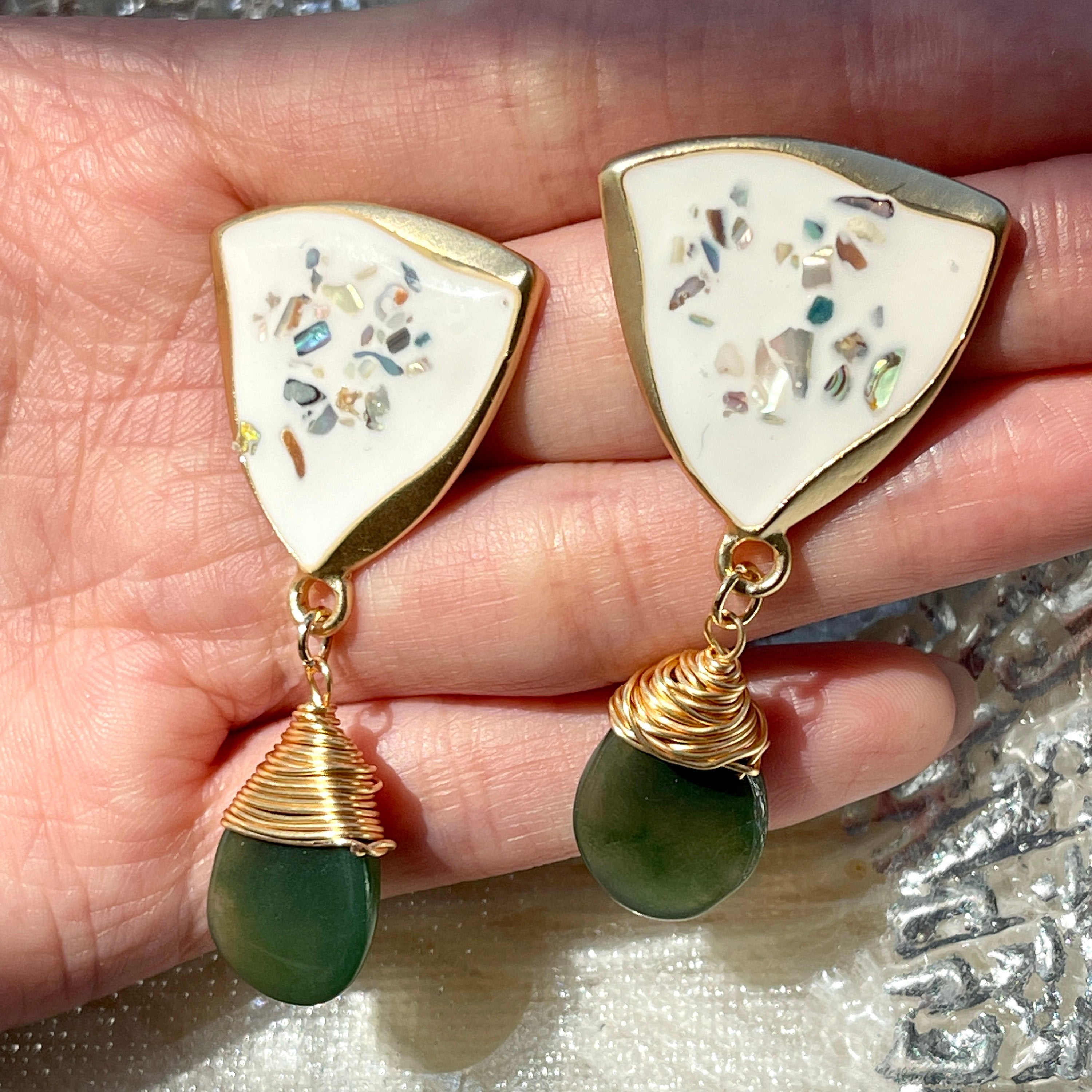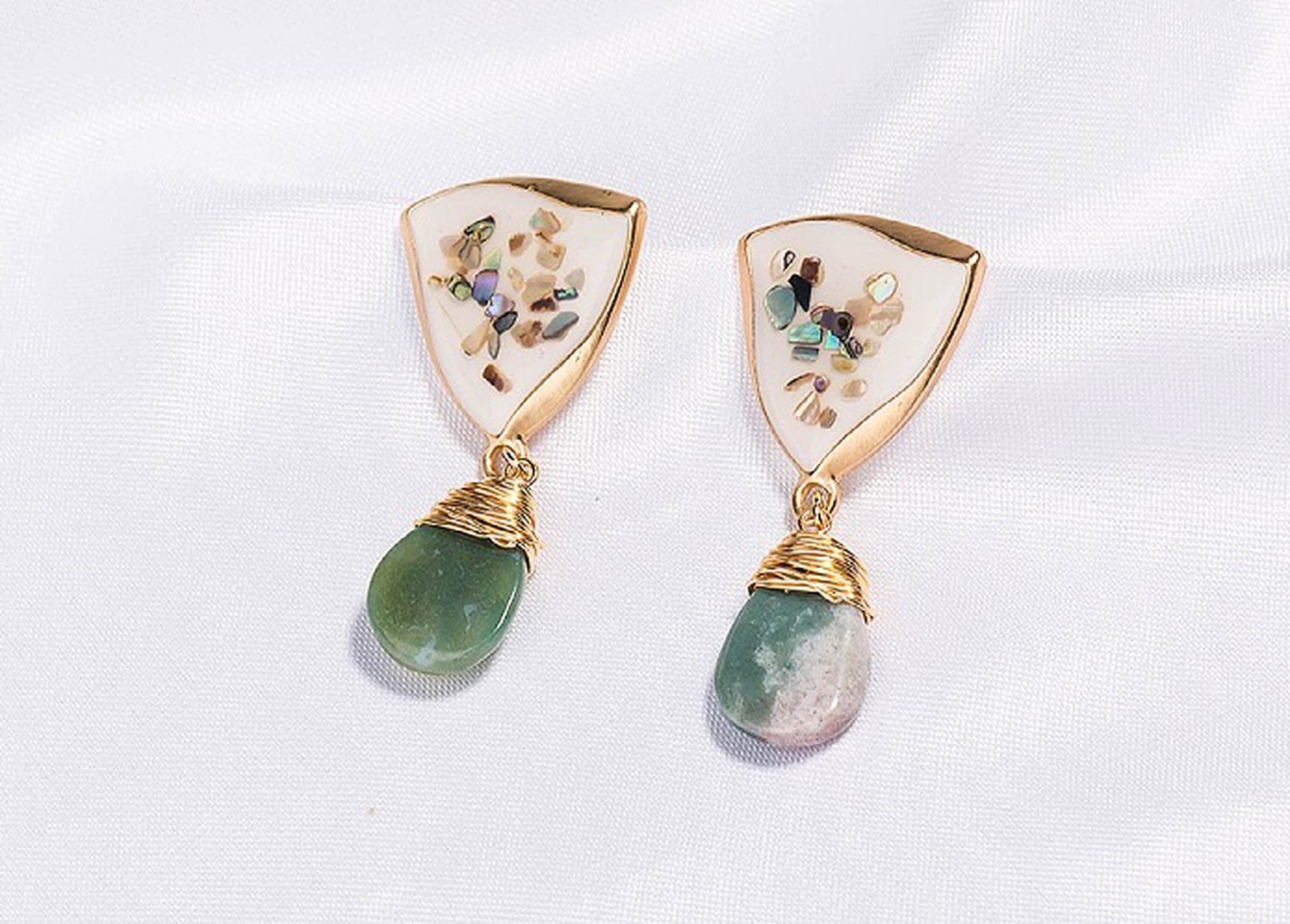 Pendientes colgantes de jade y ágata verde oscuro natural. Con chips de concha de arcoíris pavimentados sobre un sello triangular de esmalte blanco. En acabado bañado en oro de 14 quilates. Diseño de estilo vintage. Elegantes y exquisitos. Pendientes hechos a mano. Cada piedra preciosa natural tiene un patrón y una forma únicos.