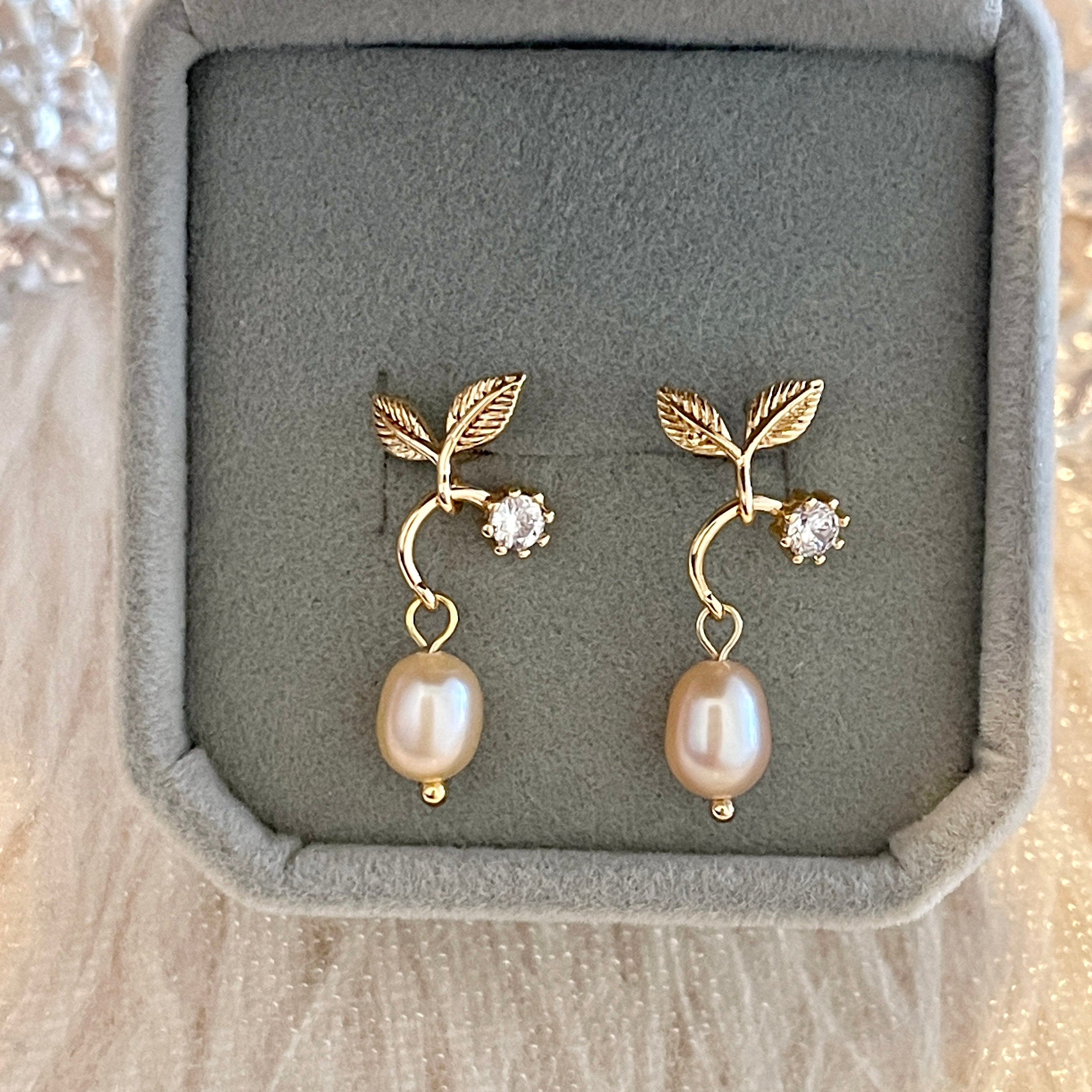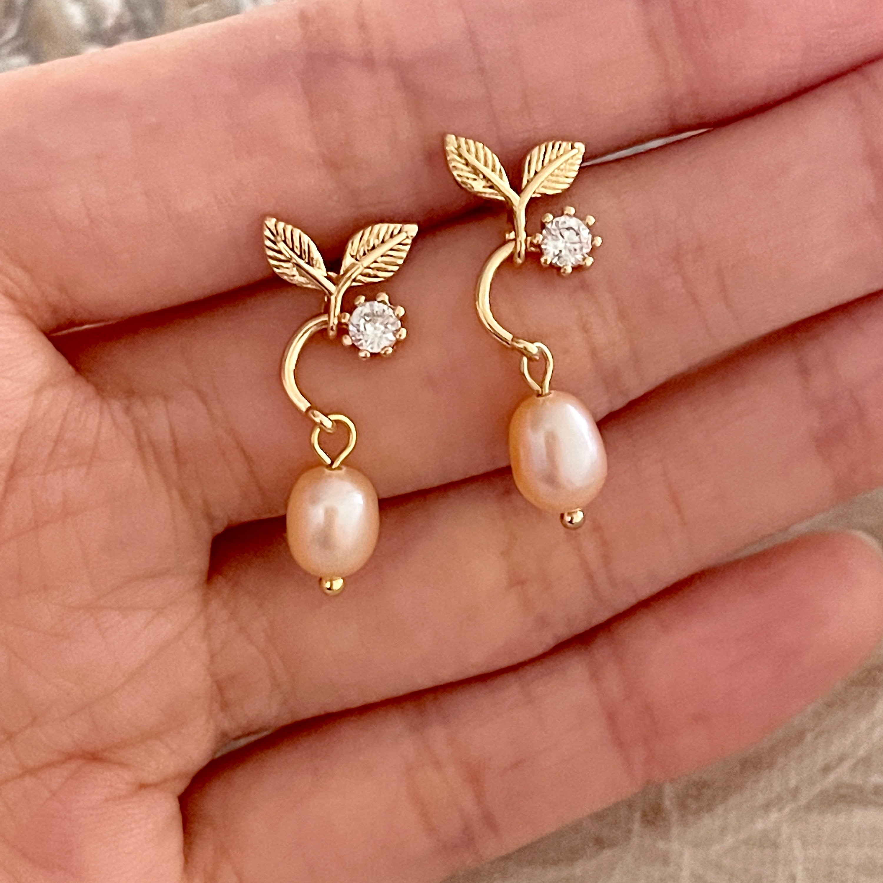 Hermosos aretes colgantes minimalistas con hojas de oro y perlas naturales de color rosa. Exquisita joyería original hecha a mano. Delicado diseño de hojas de oro con brillantes diamantes de circonita cúbica y perlas naturales de color rosa de alta calidad. Elegancia clásica con un toque vintage. ¡Delicados y sorprendentes! Elegimos las perlas ovaladas de color rosa de la mejor calidad para hacer estos hermosos aretes. Lucen lujosamente únicos.